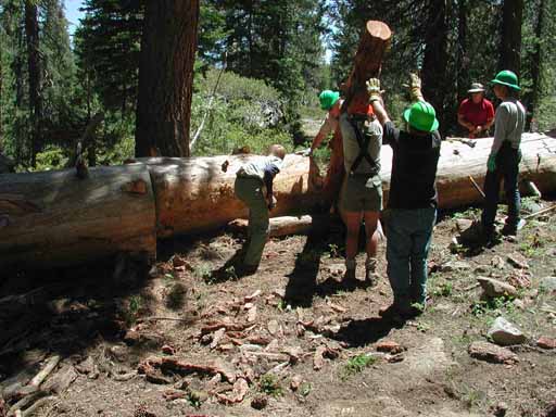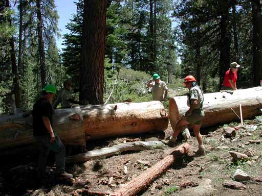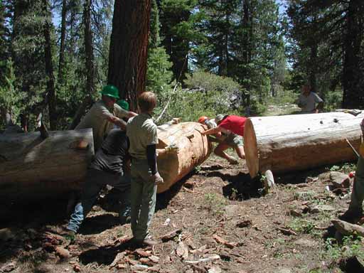 John, Nate, Pedro, Marty and Bill starting to roll the cut section out of the trail. Note that more small logs have been added to make it easier to roll the cut section down and then up to the fallen tree.