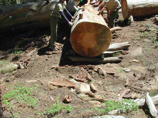 Marty, John, Bill, Eric, Pedro and Nate rolling the cut section up hill to get it completly out of the way.