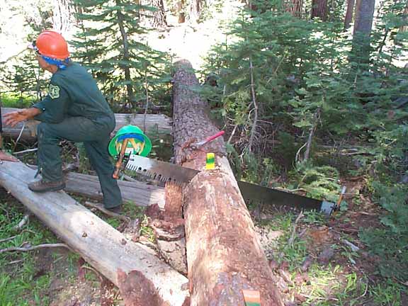 Buck The Saw does in another log. Note the pieces of wood directly under the cut. These are there to protect the saw if it "falls" after completing the cut. These two man cross cut saws are no longer being made and are not replaceable. So much care is taken with them to prevent any damage. (Normal wear and tear is all that happens to them.)