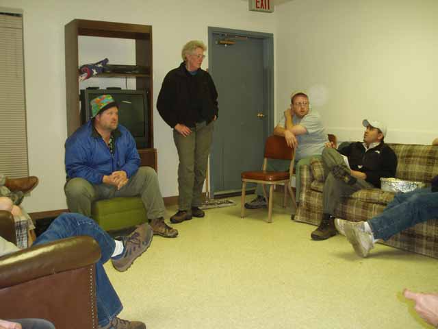 Shane on the phone, Karl buttoning up. Yes it was wet and cold. P4080004.JPG