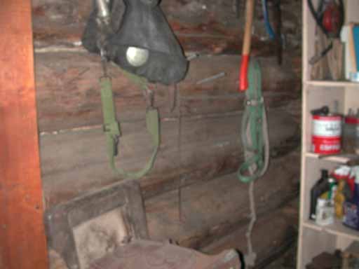 Misc stuff we found. This includes, two 5 lbs. propane bottles, at least two buckets of misc plumbing and other parts, a horse first aid kit (in the old 50 cal ammo box), two wooden chairs, three working metal chairs, a snow shovel and a propane lamp which we never got working. (We already had one working and the globe was broken on this one.)