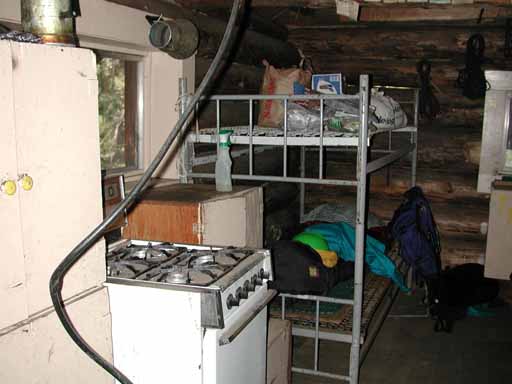 Left hand far corner of the cabin showing the other bunks, storage cabinets and stove. Eric slept in the lower bunk.