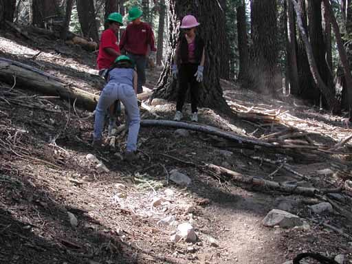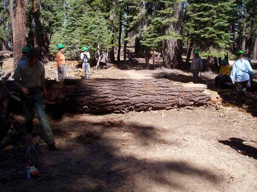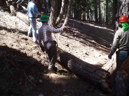 Second set of before and after views of the trail with Marty, Steve and John moving the cut log.