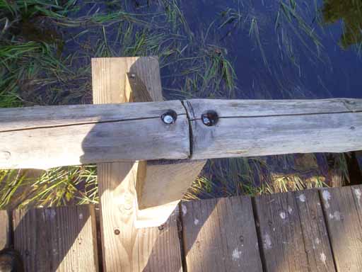 Bridge correctly installed. This was done by having one person climb in the creek to direct the bridge as it was pulled, floating, back to where