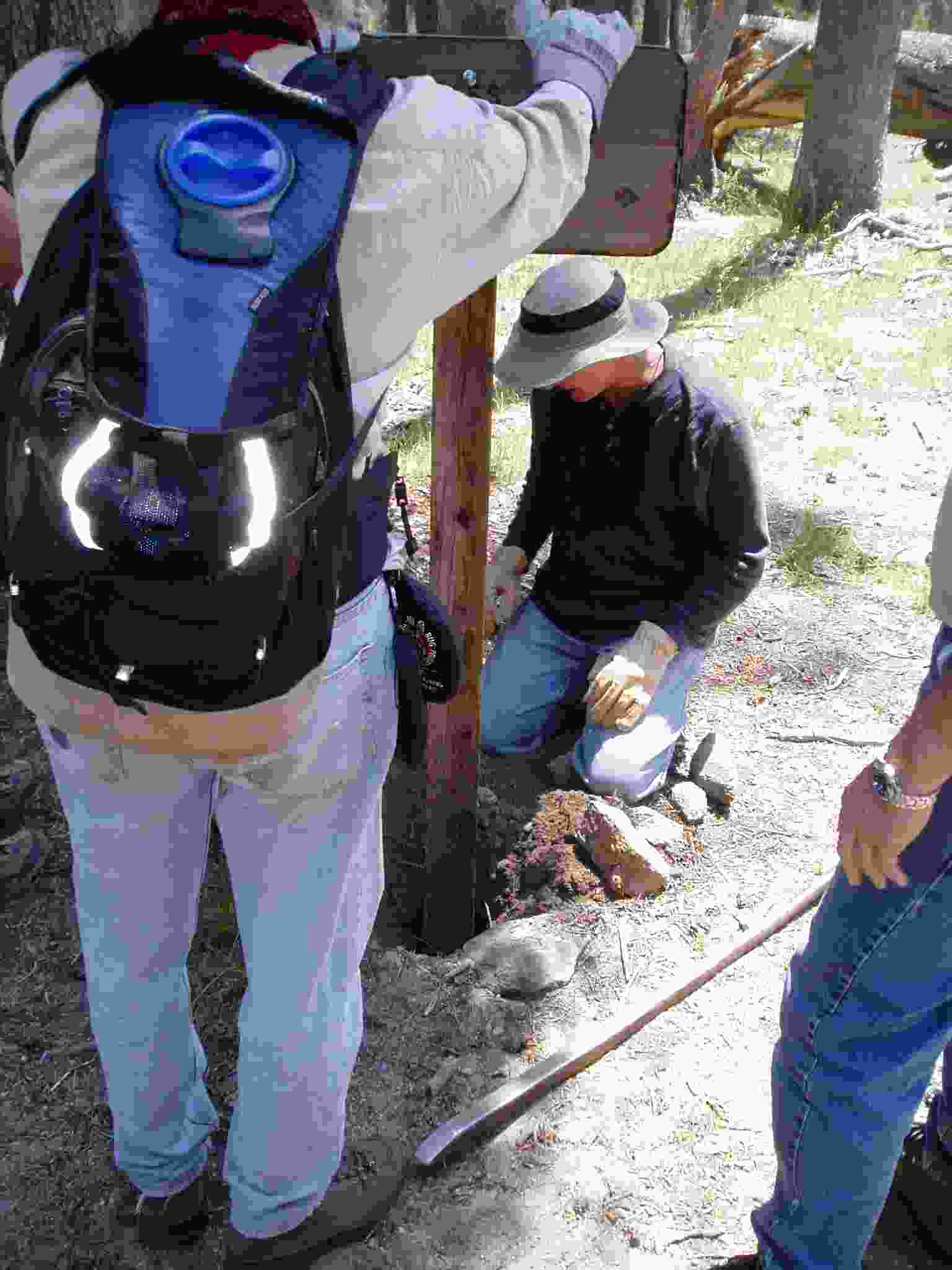 We found at trail sign that had been removed from the ground. Here we are replacing it. We dug out the old hole, replaced the sign post and then smashed as many rocks in as we could.