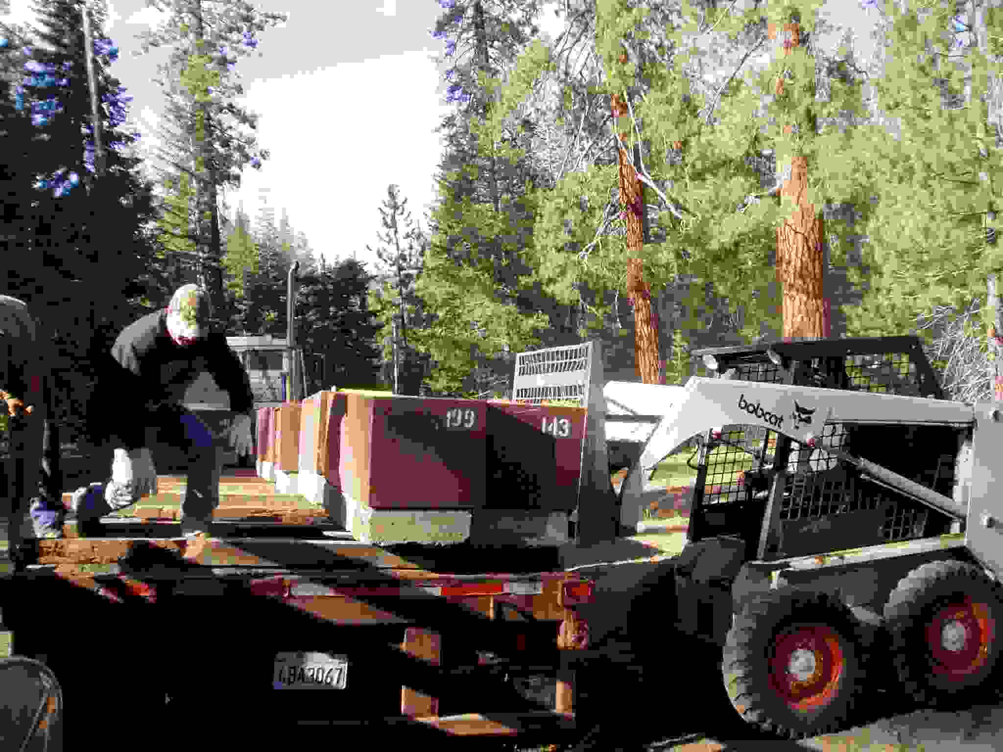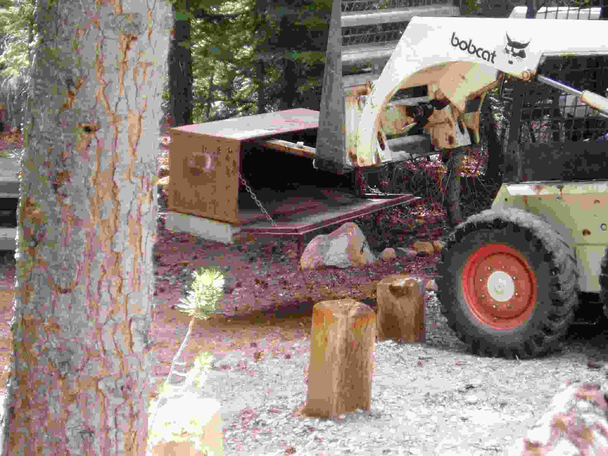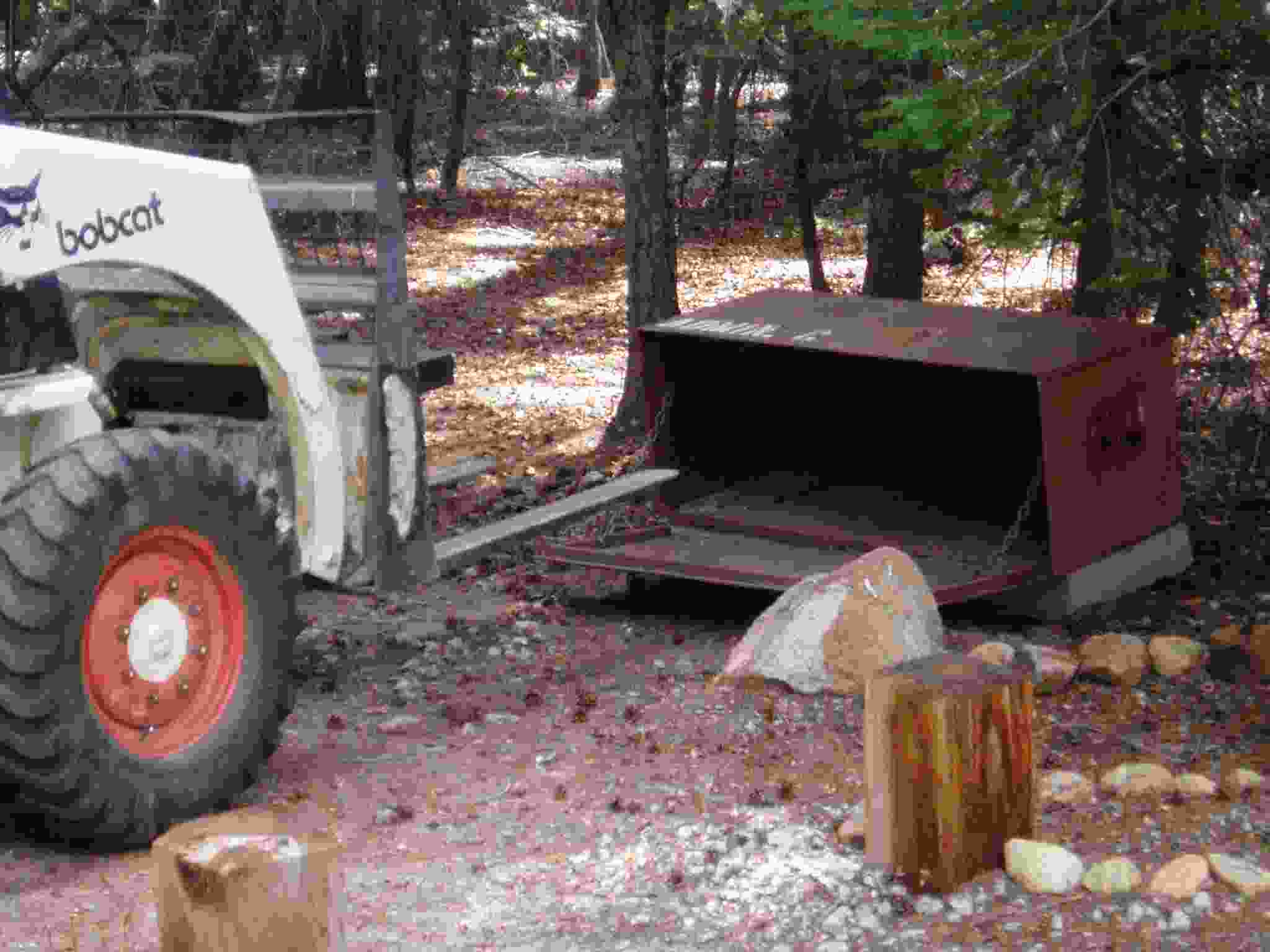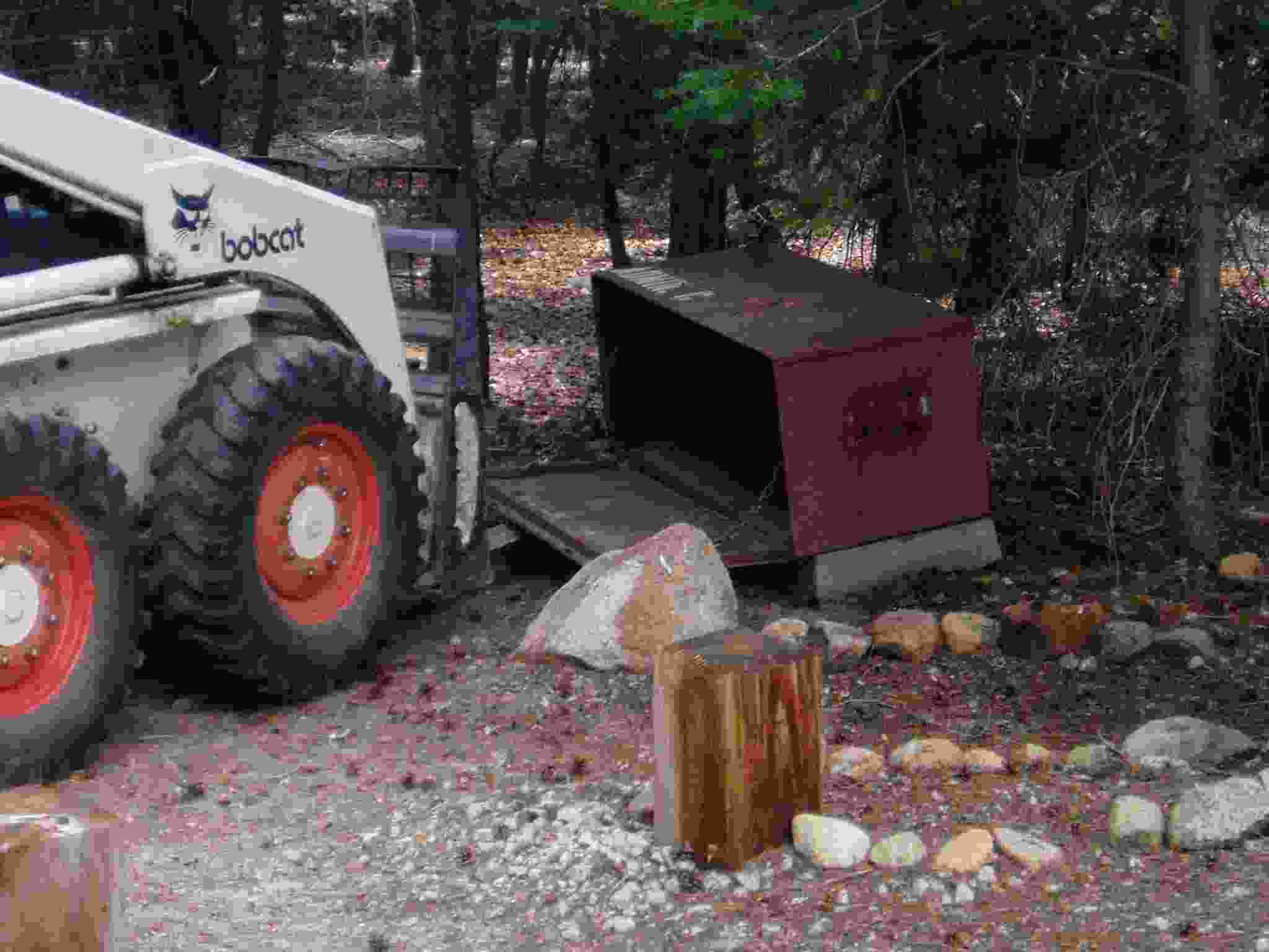 Bobcat grabbing a bear box for placement.
