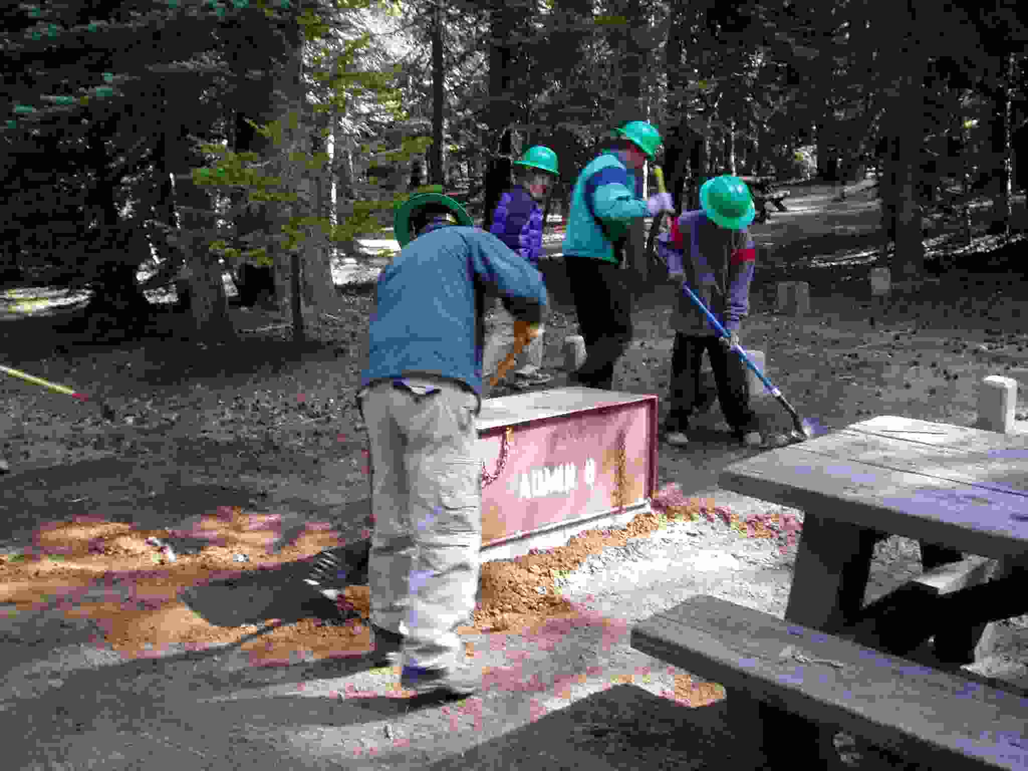 Keith shoveling dirt underneath a bear box while ? and Lisa hold it up.