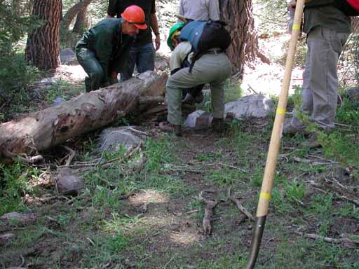 Most of the crew removing a log from the trail. (P7060007.MOV, movie by Eric.)