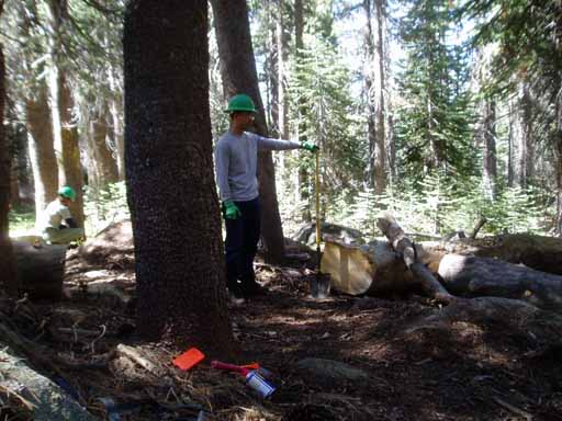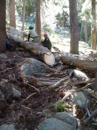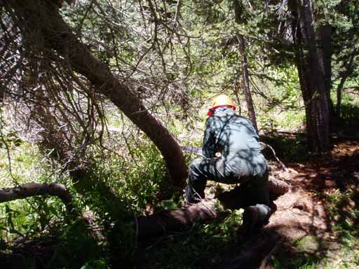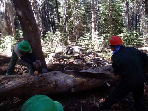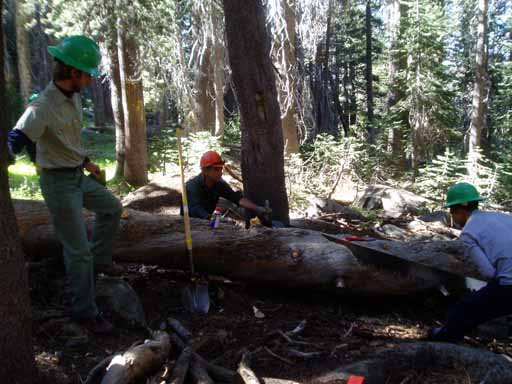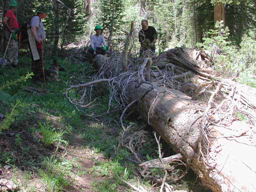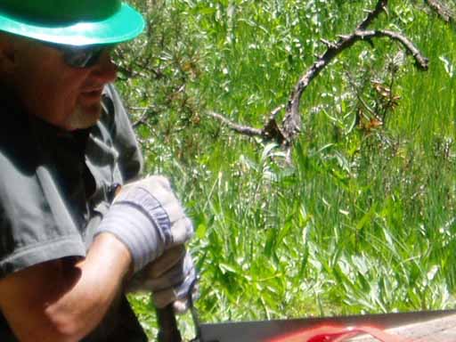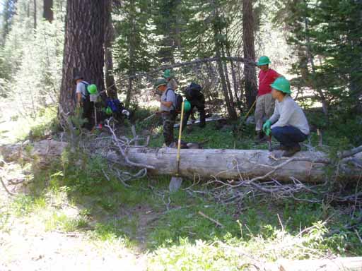 Ted, Bill, Pedro (with a hand sledge, or single jack, which is used to break off dead tree branches) and Eric debranching a downed tree near the trail.