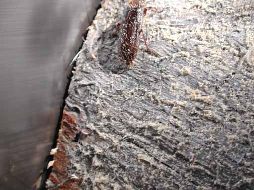 John and Pedro, note the quantity of saw dust that Buck the Saw makes from a little 10" tree on each cut. (P7070028.MOV, movie by Eric.)