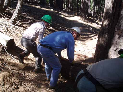 Second set of before and after views of the trail with Marty, Steve and John moving the cut log.