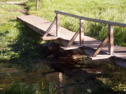 Bridge correctly installed. This was done by having one person climb in the creek to direct the bridge as it was pulled, floating, back to where