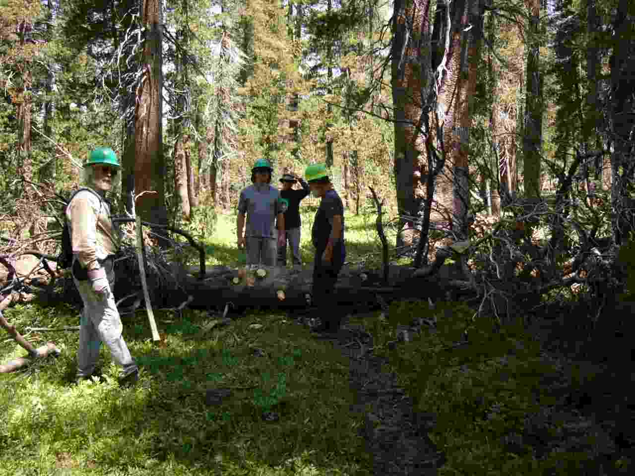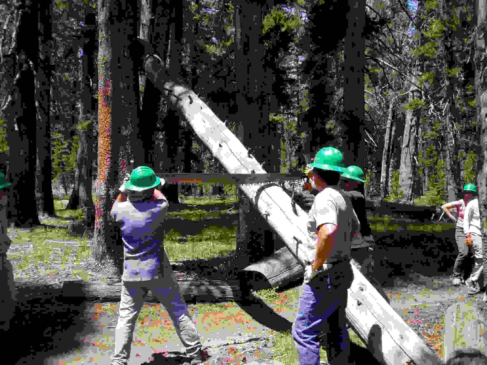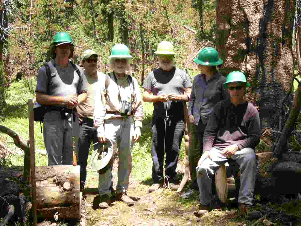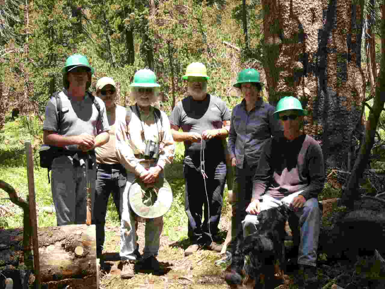 Trail crew goofing off in the meadow in front of the Snow Survey cabin.