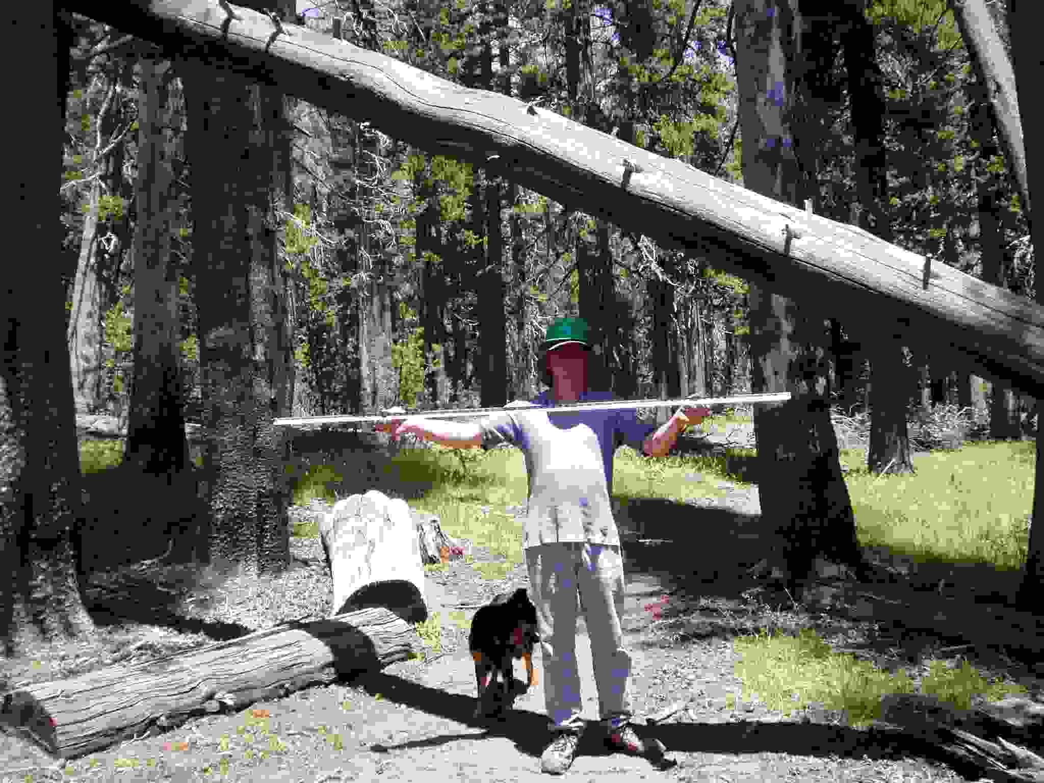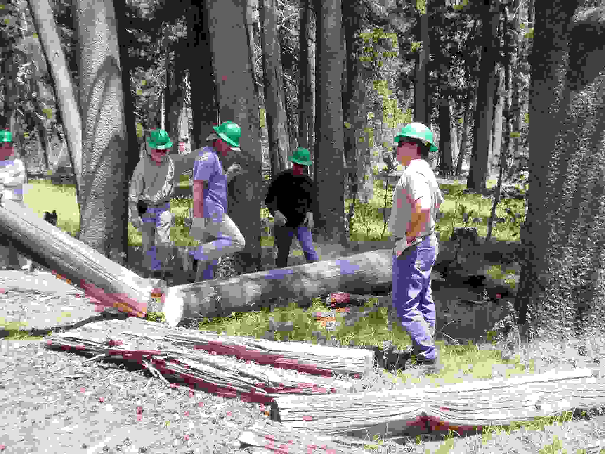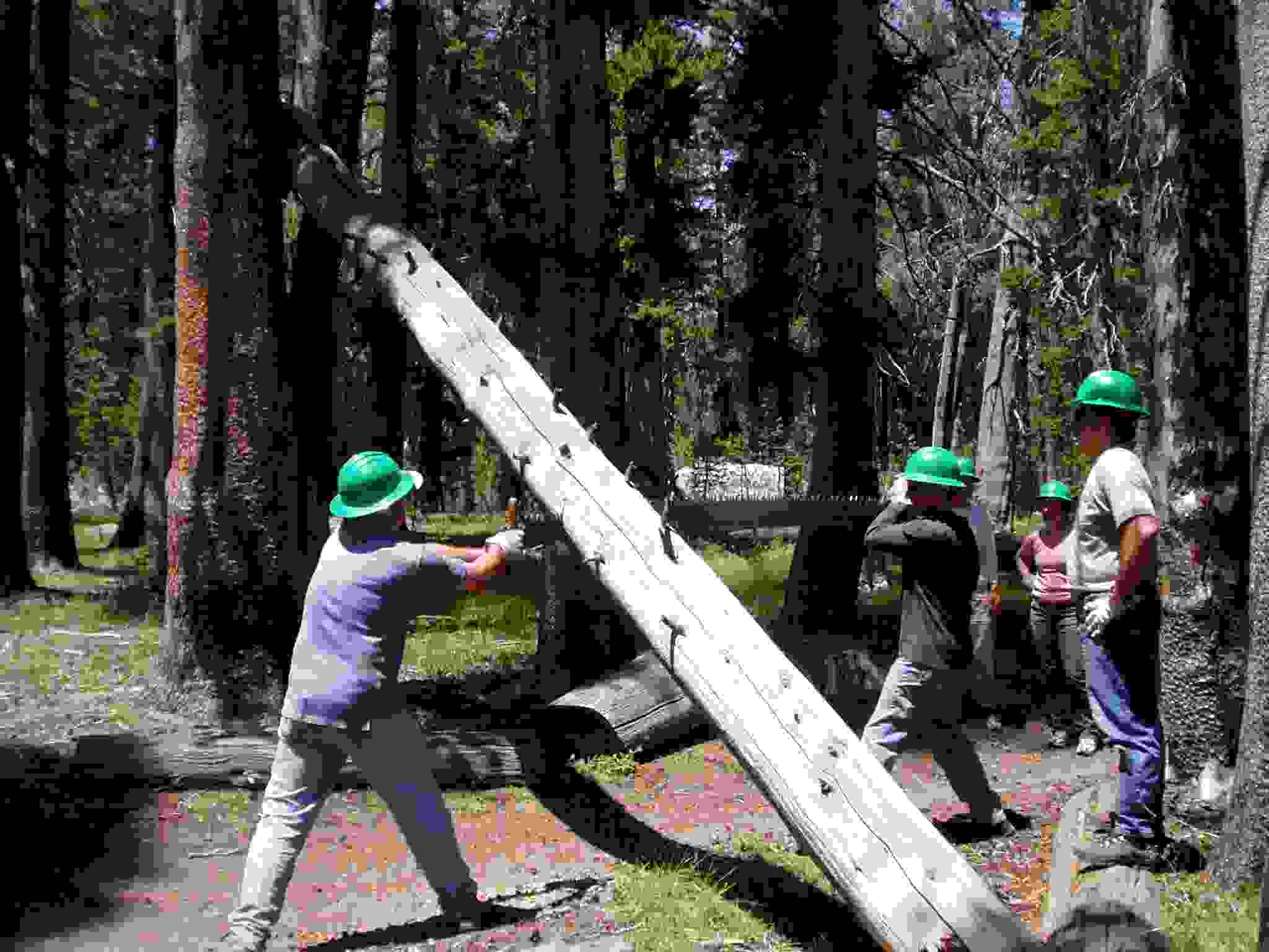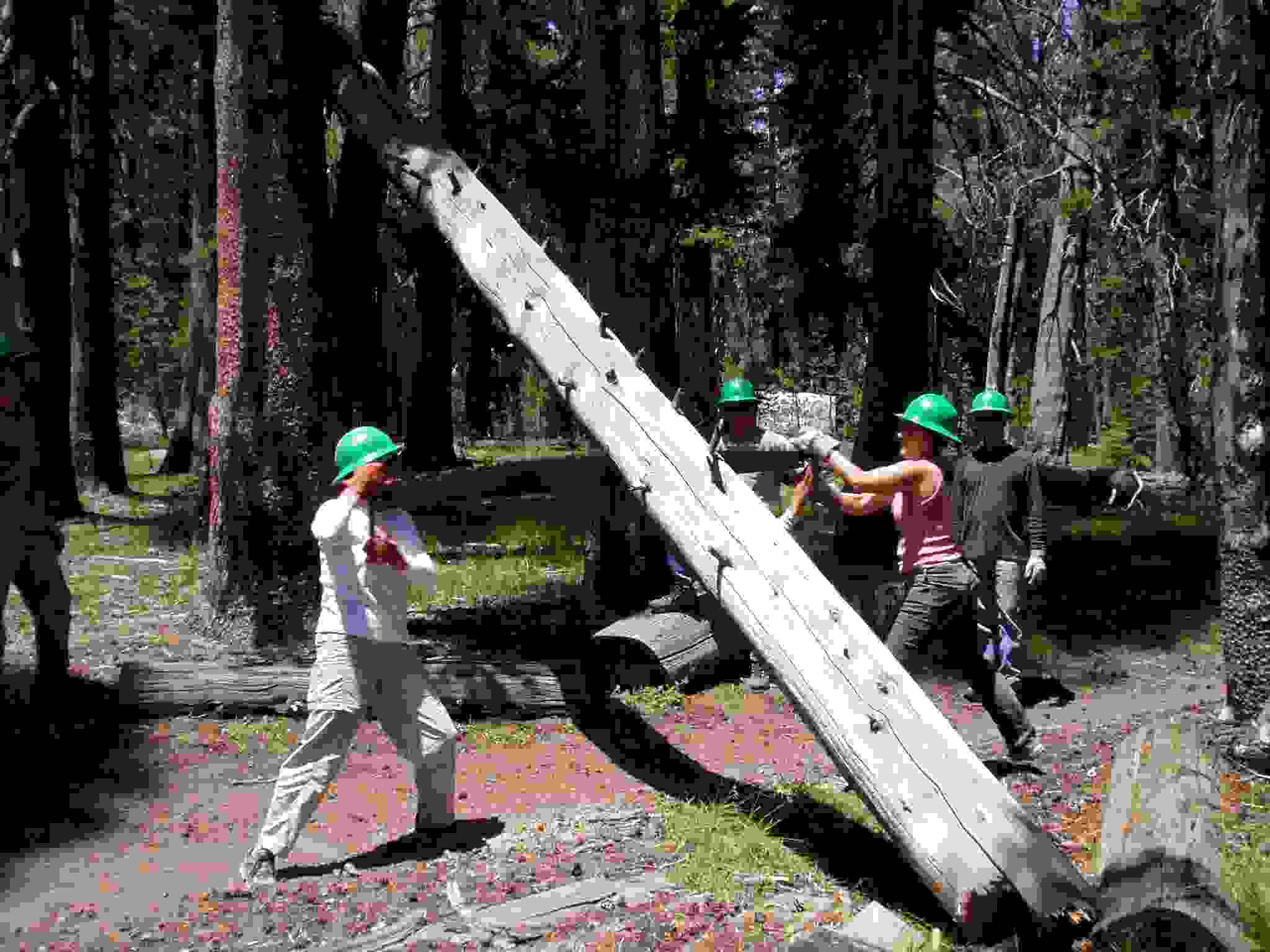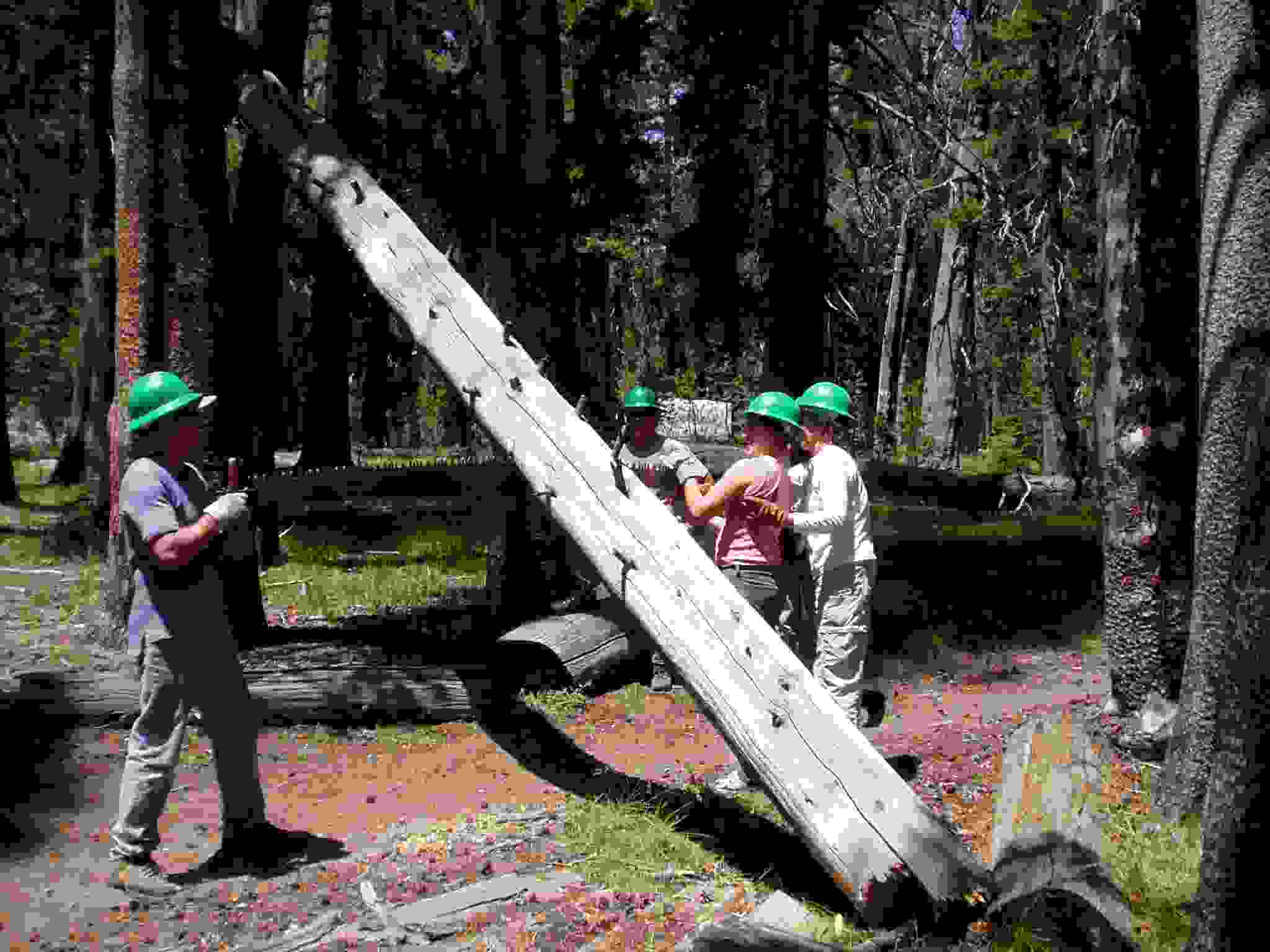Trail crew goofing off in the meadow in front of the Snow Survey cabin.