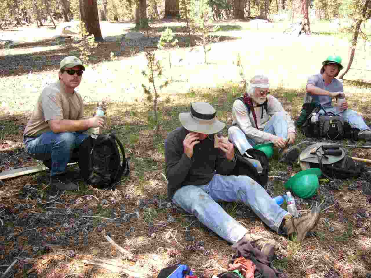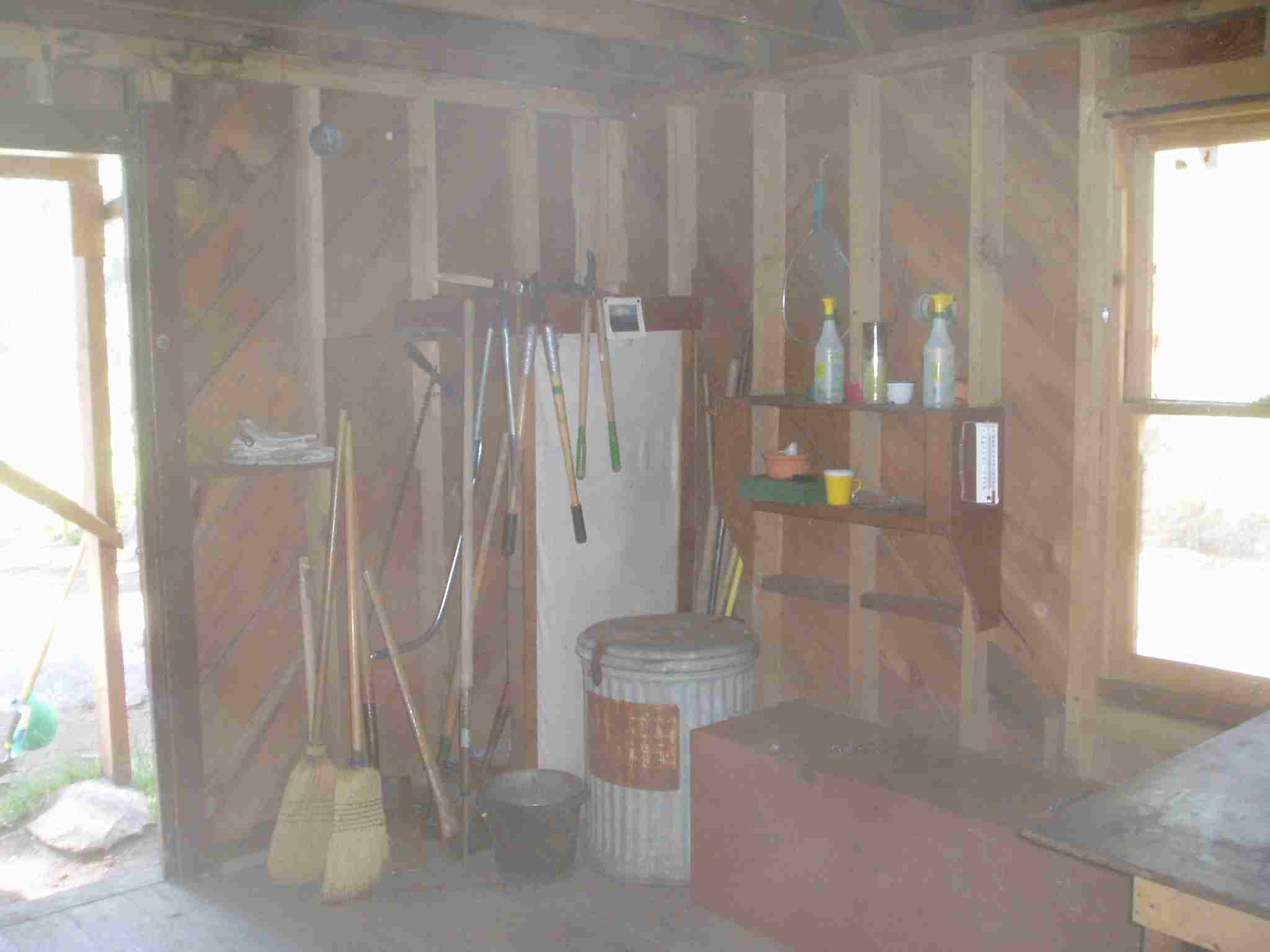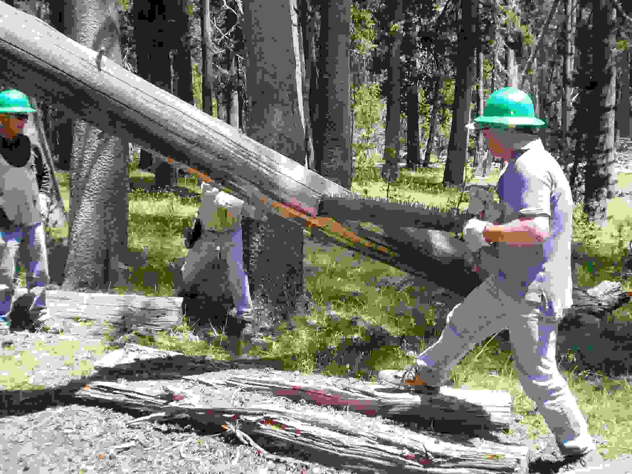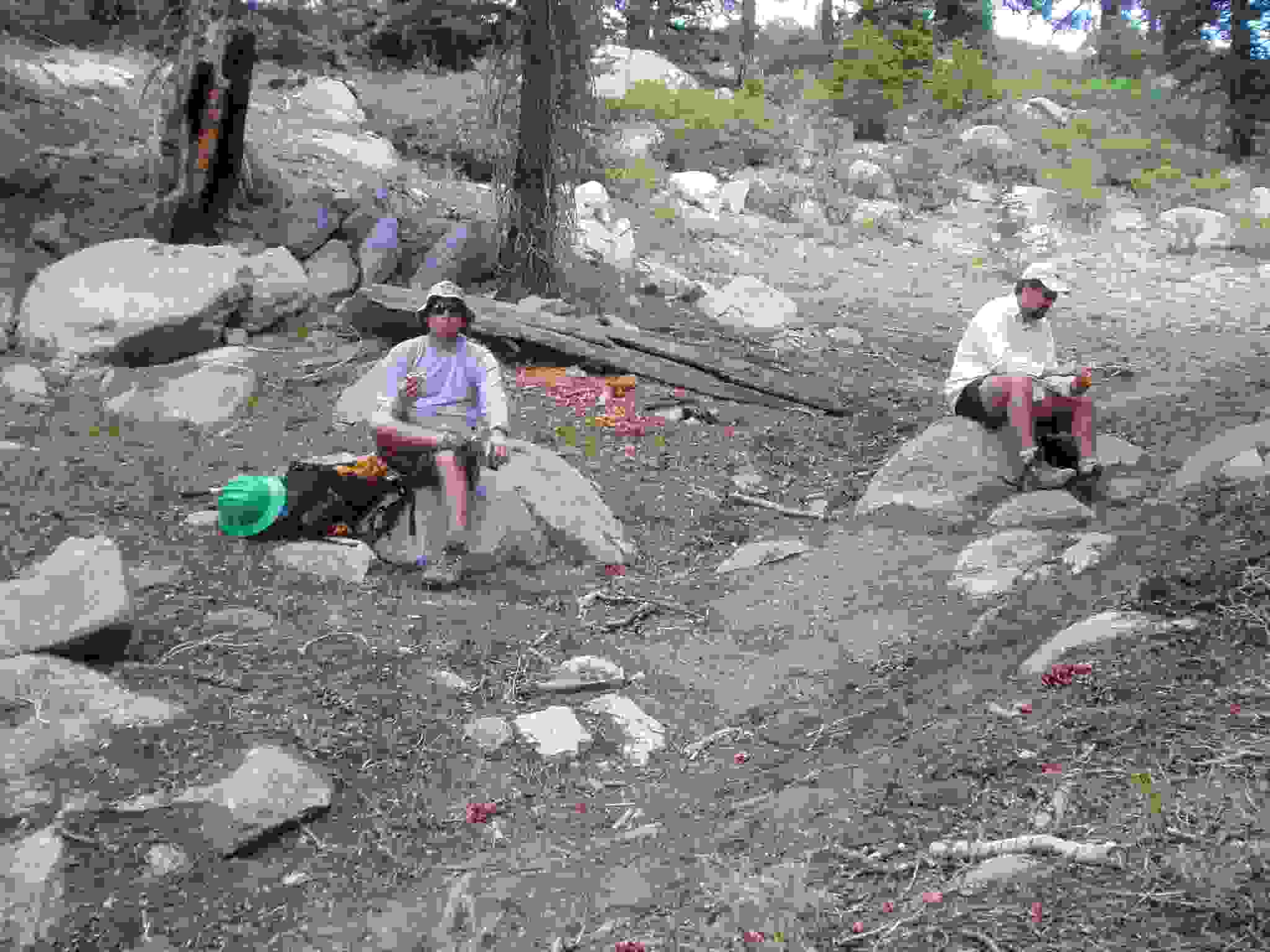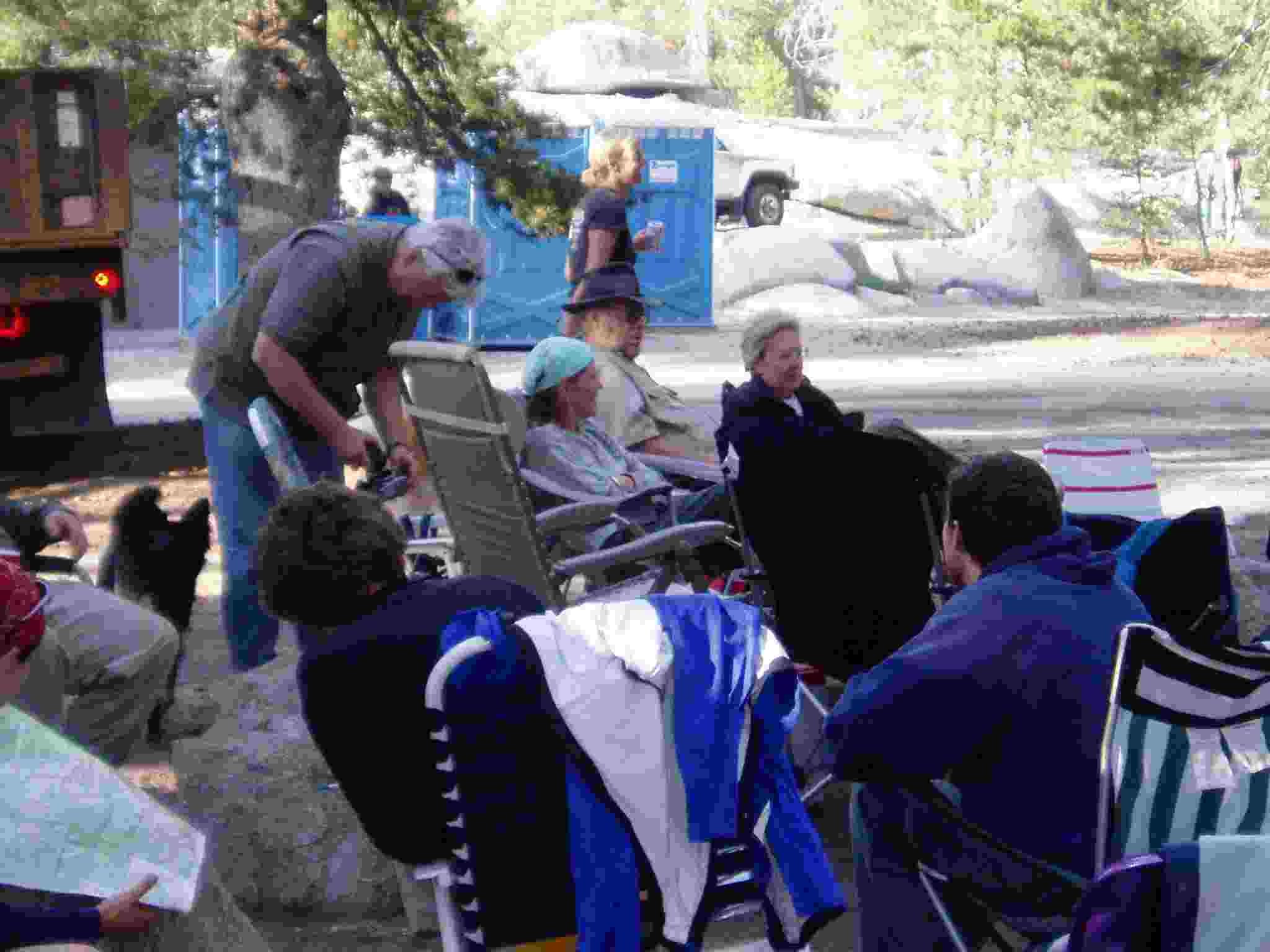 Kitchen area, first morning. (Friday) Today my task is to get a crew of all first timers and go to Rowell Meadow where the week long team has been working. They have left two "problem" trees for us, and some minor additional work. When they get packed out, they will be leaving a rock bar and two man crosscut saw behind for us.
