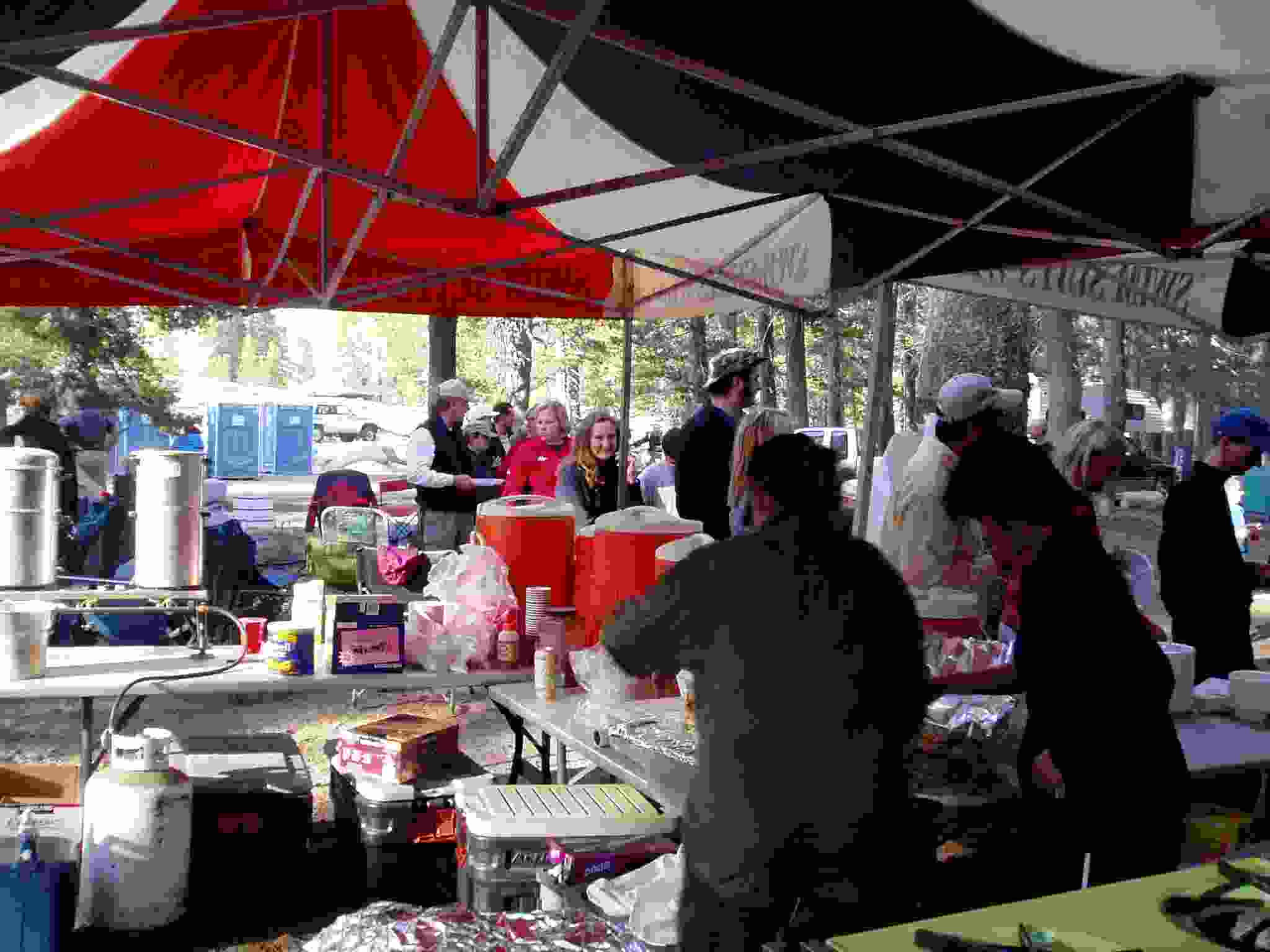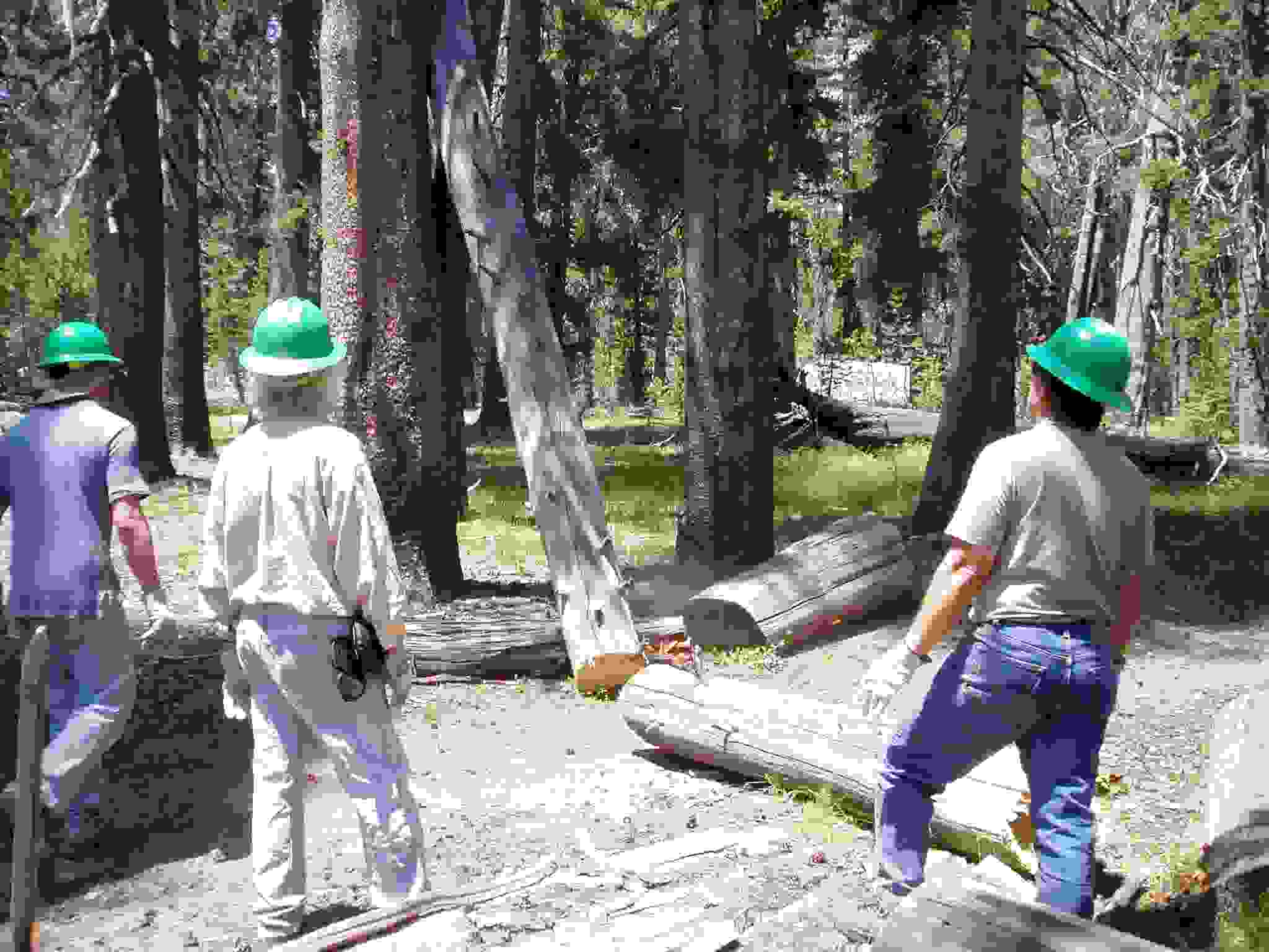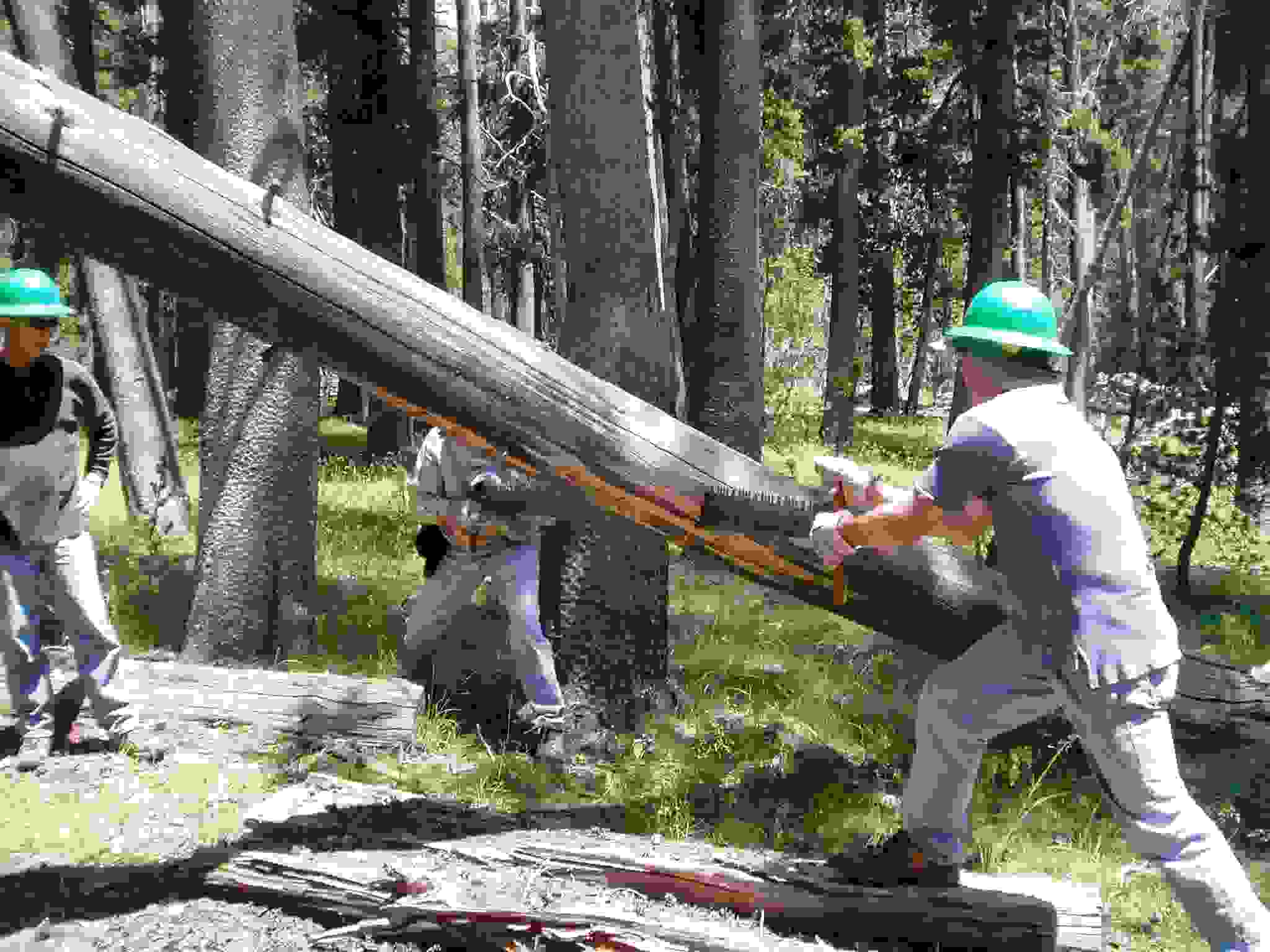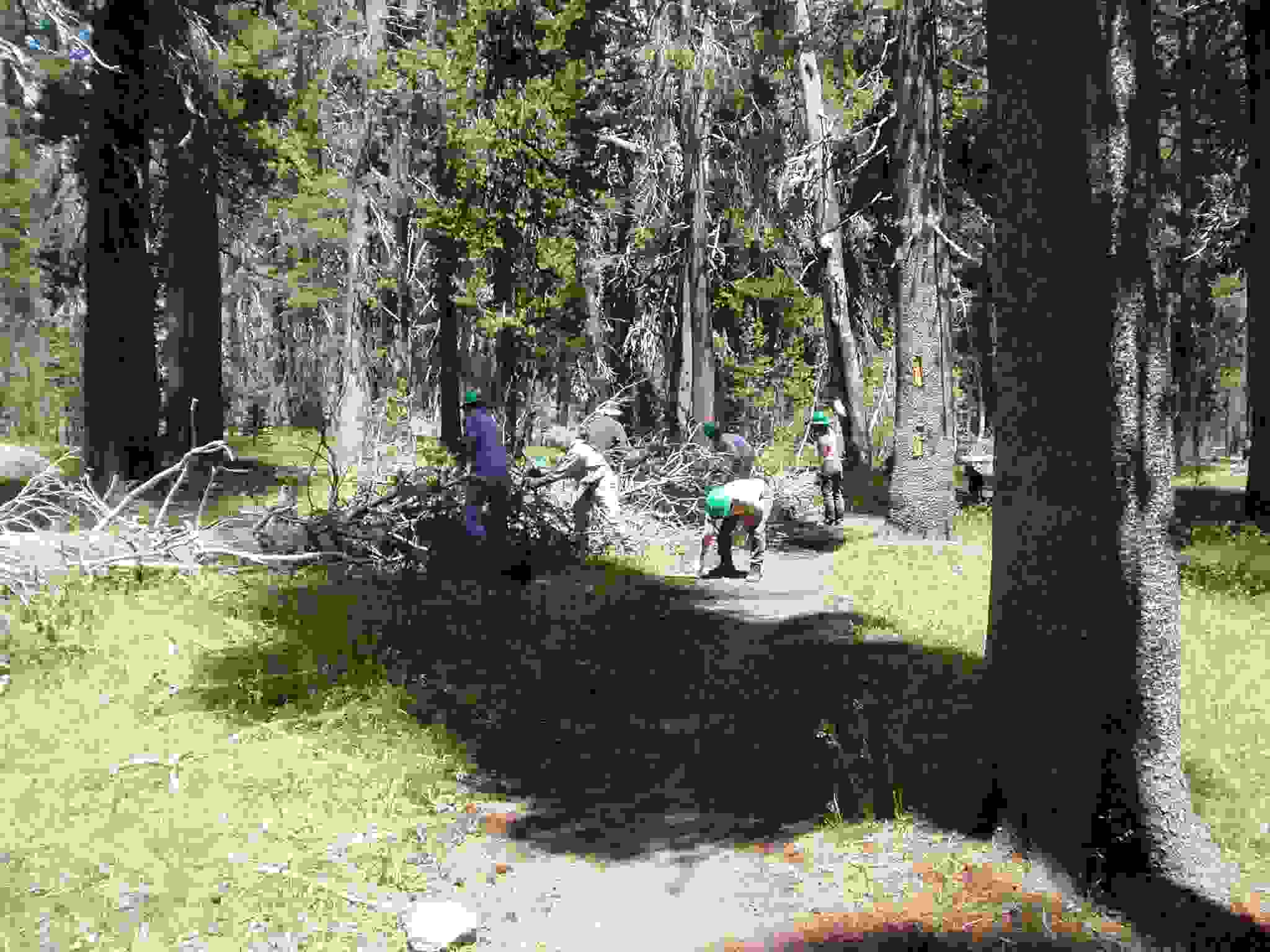 Kitchen area, first morning. (Friday) Today my task is to get a crew of all first timers and go to Rowell Meadow where the week long team has been working. They have left two "problem" trees for us, and some minor additional work. When they get packed out, they will be leaving a rock bar and two man crosscut saw behind for us.