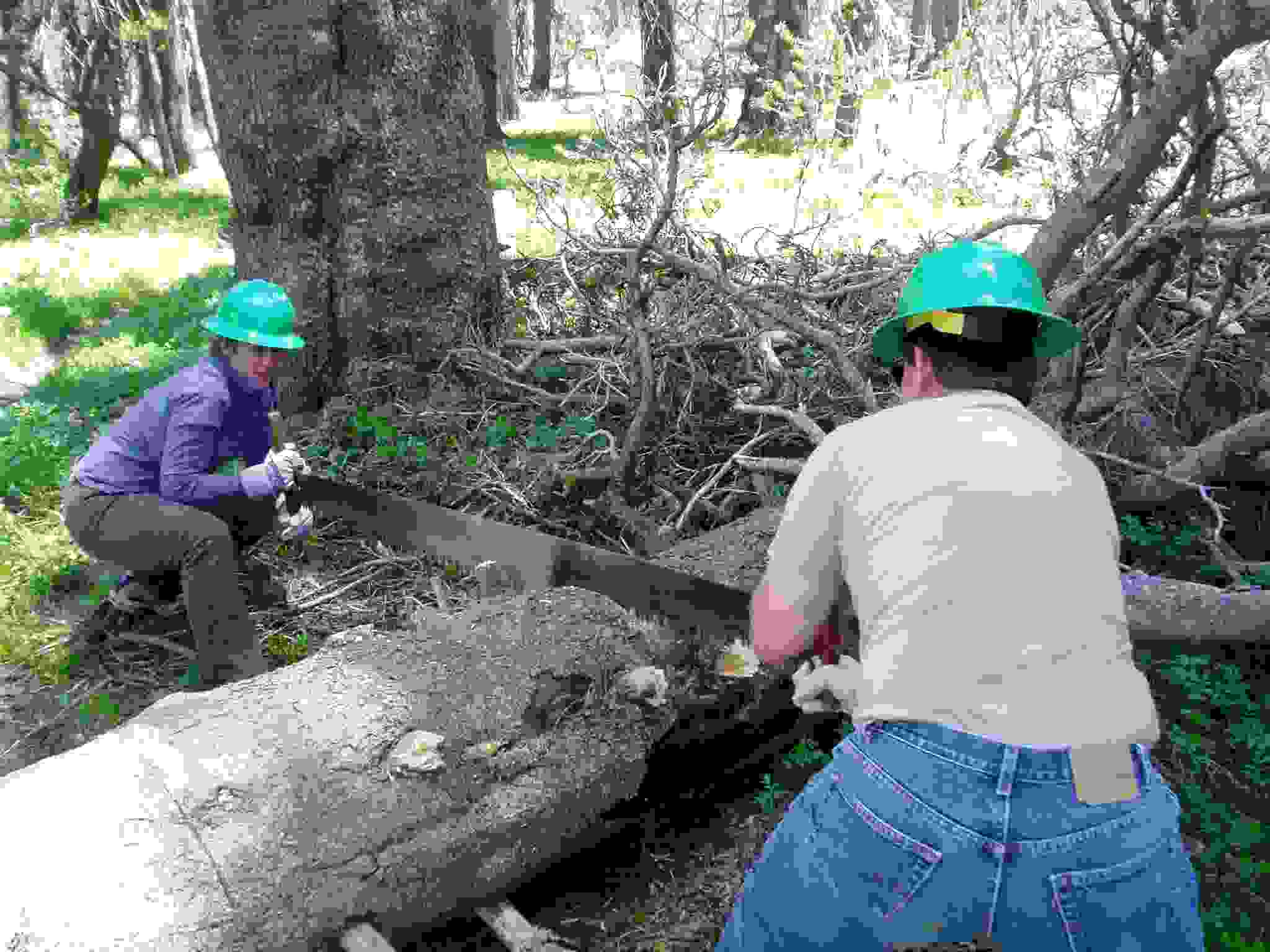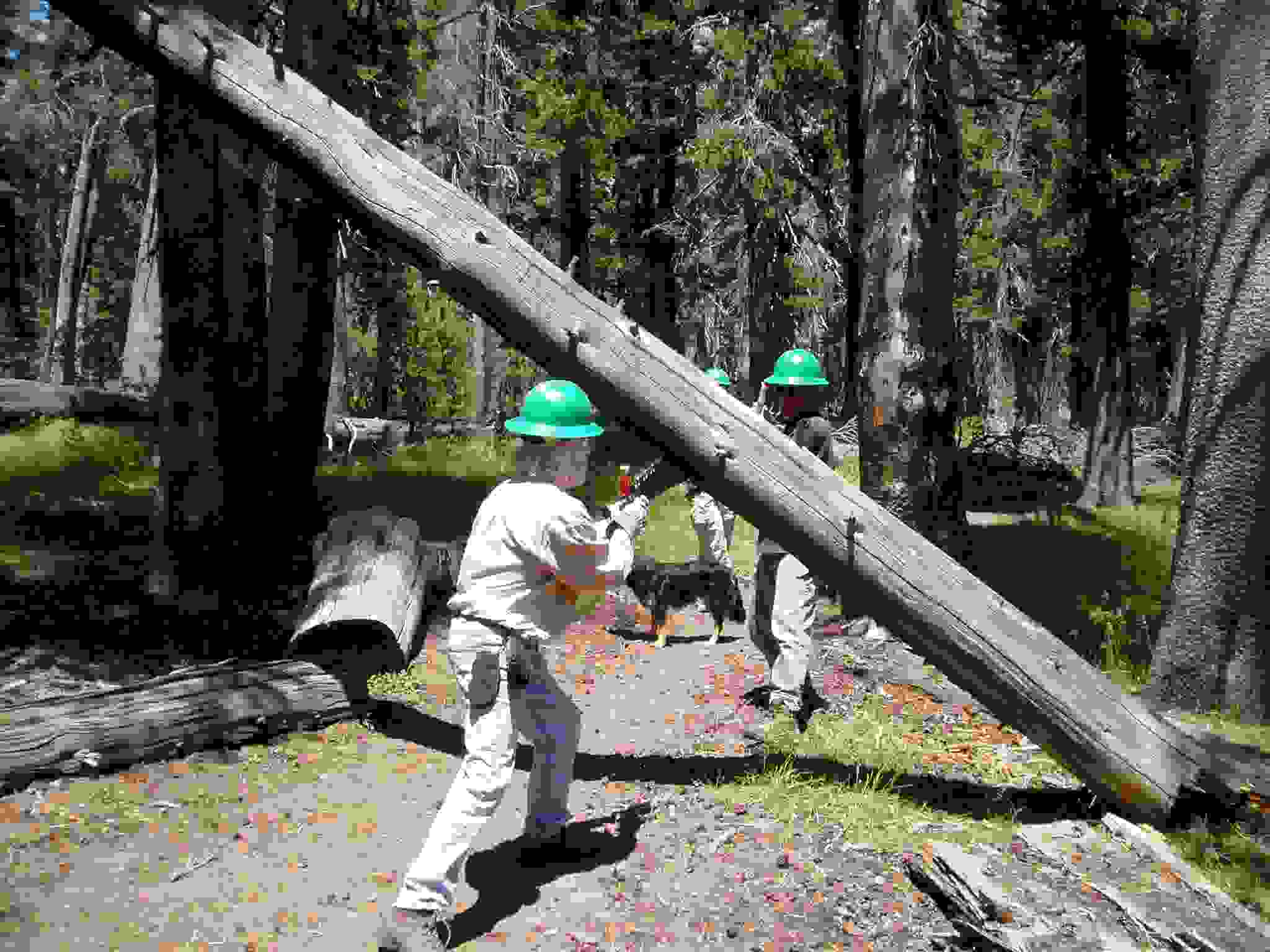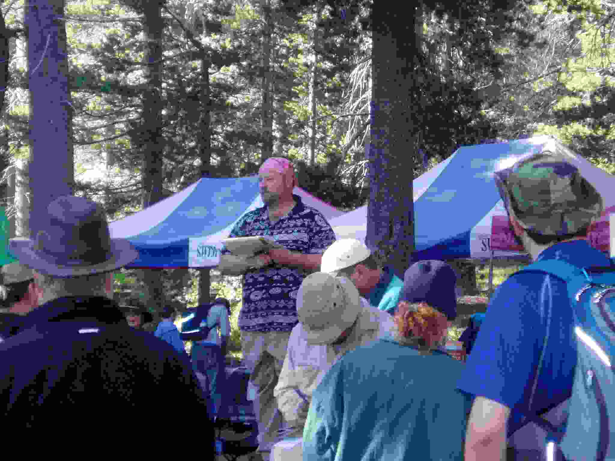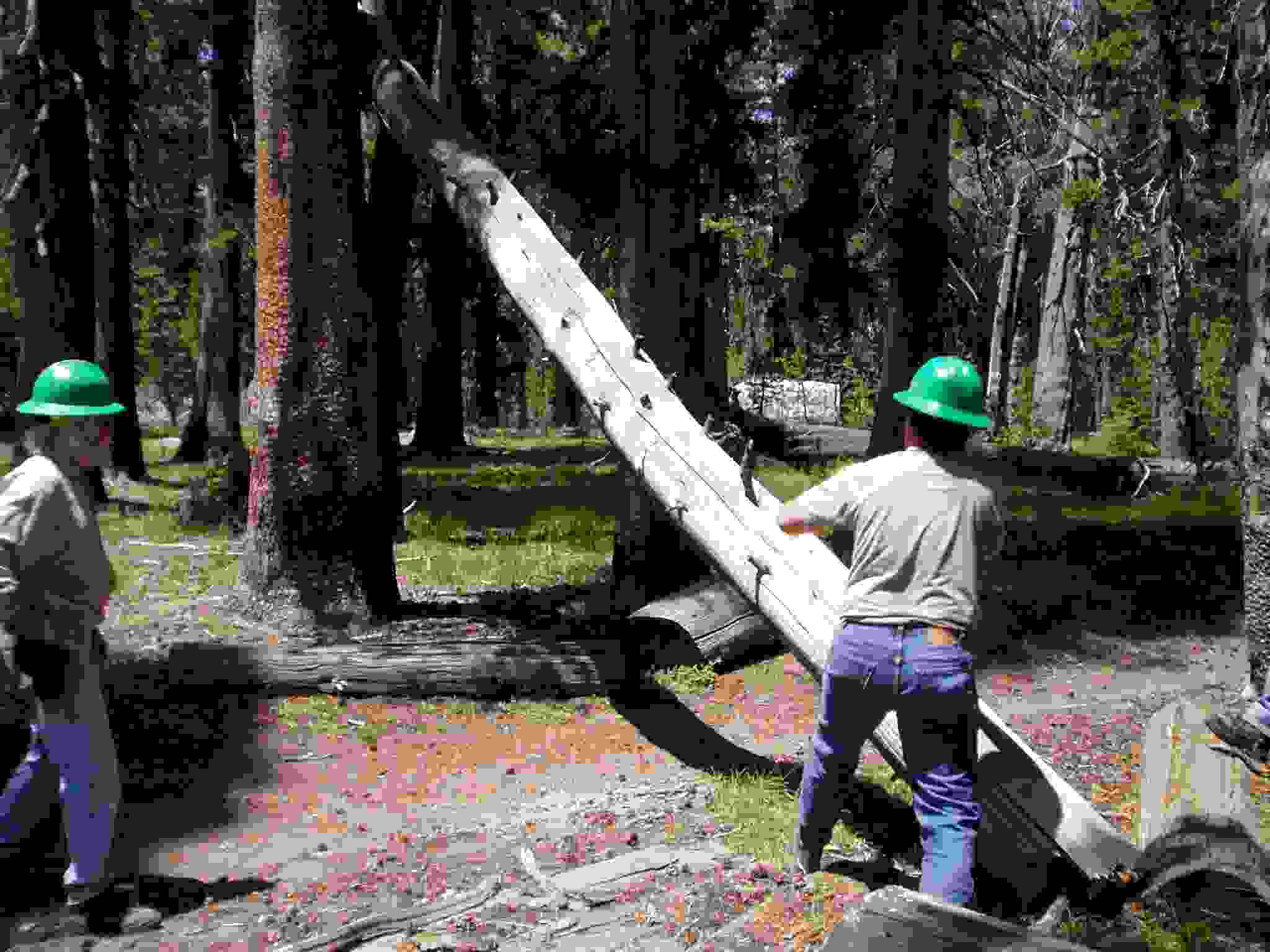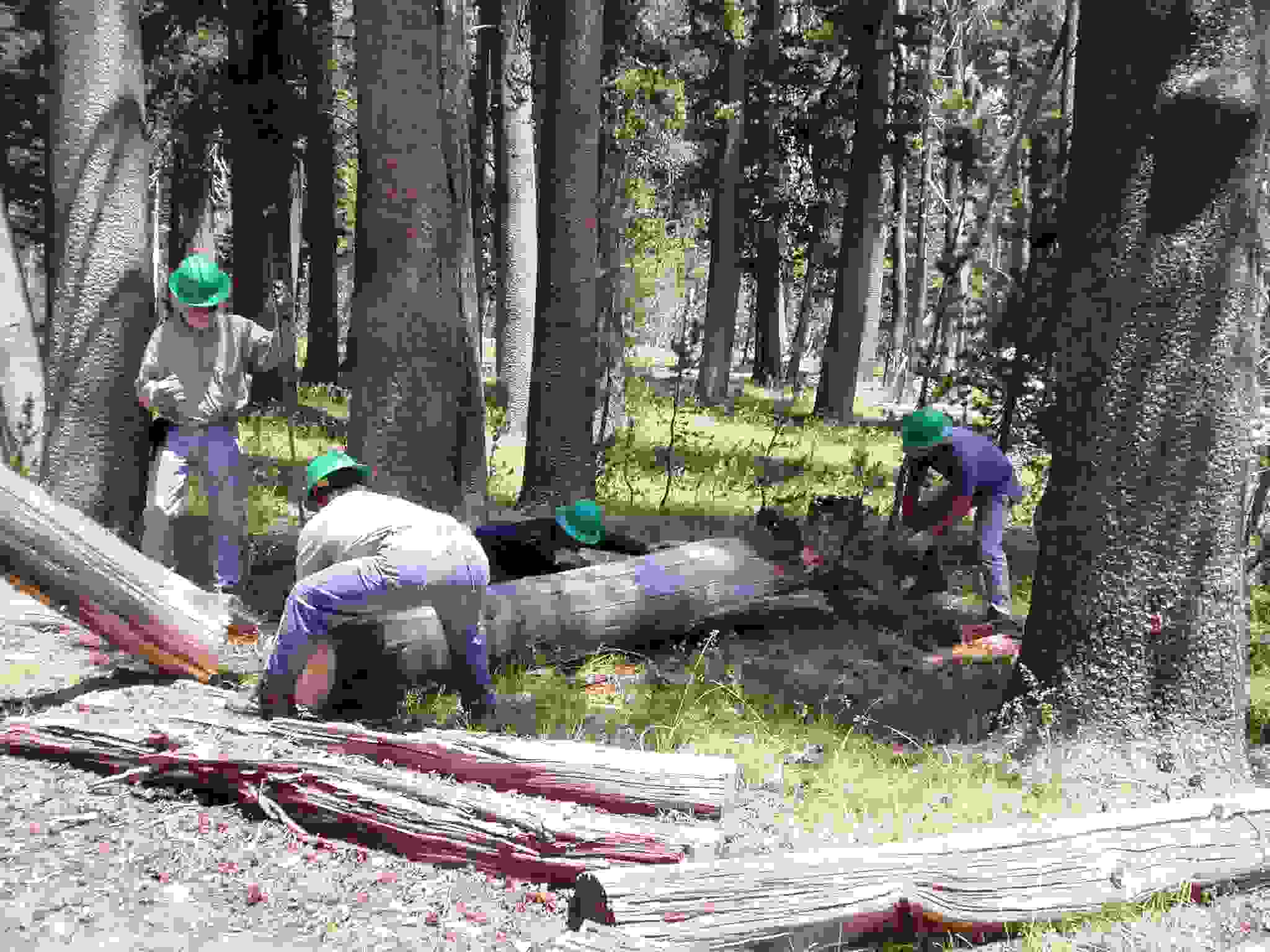 Kitchen area, first morning. (Friday) Today my task is to get a crew of all first timers and go to Rowell Meadow where the week long team has been working. They have left two "problem" trees for us, and some minor additional work. When they get packed out, they will be leaving a rock bar and two man crosscut saw behind for us.