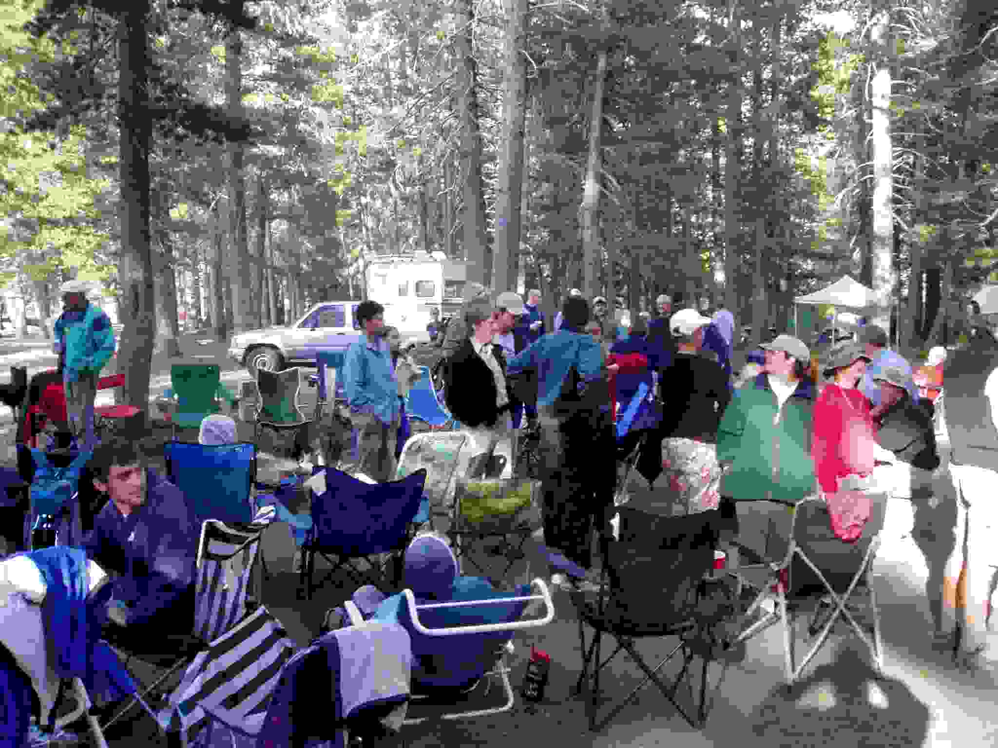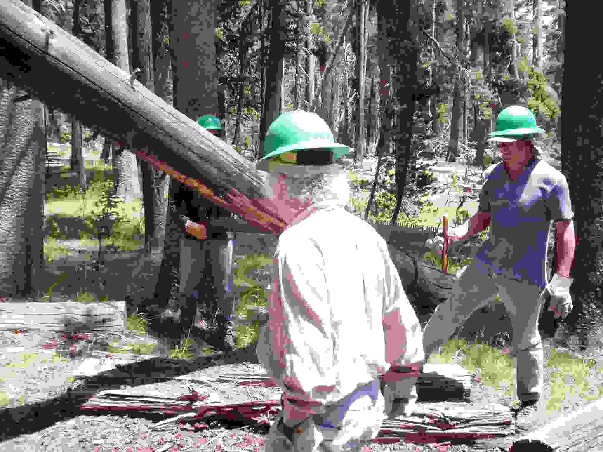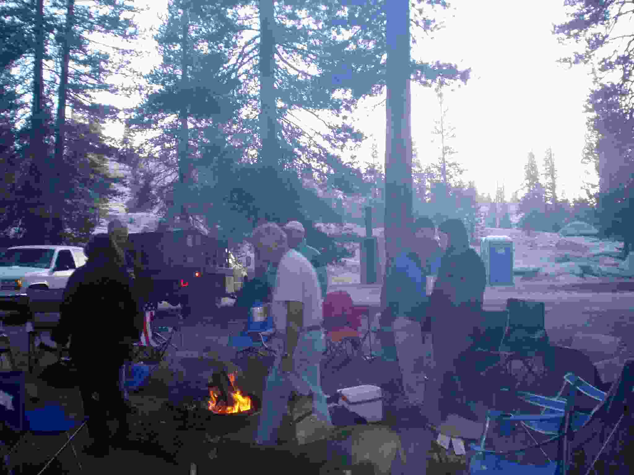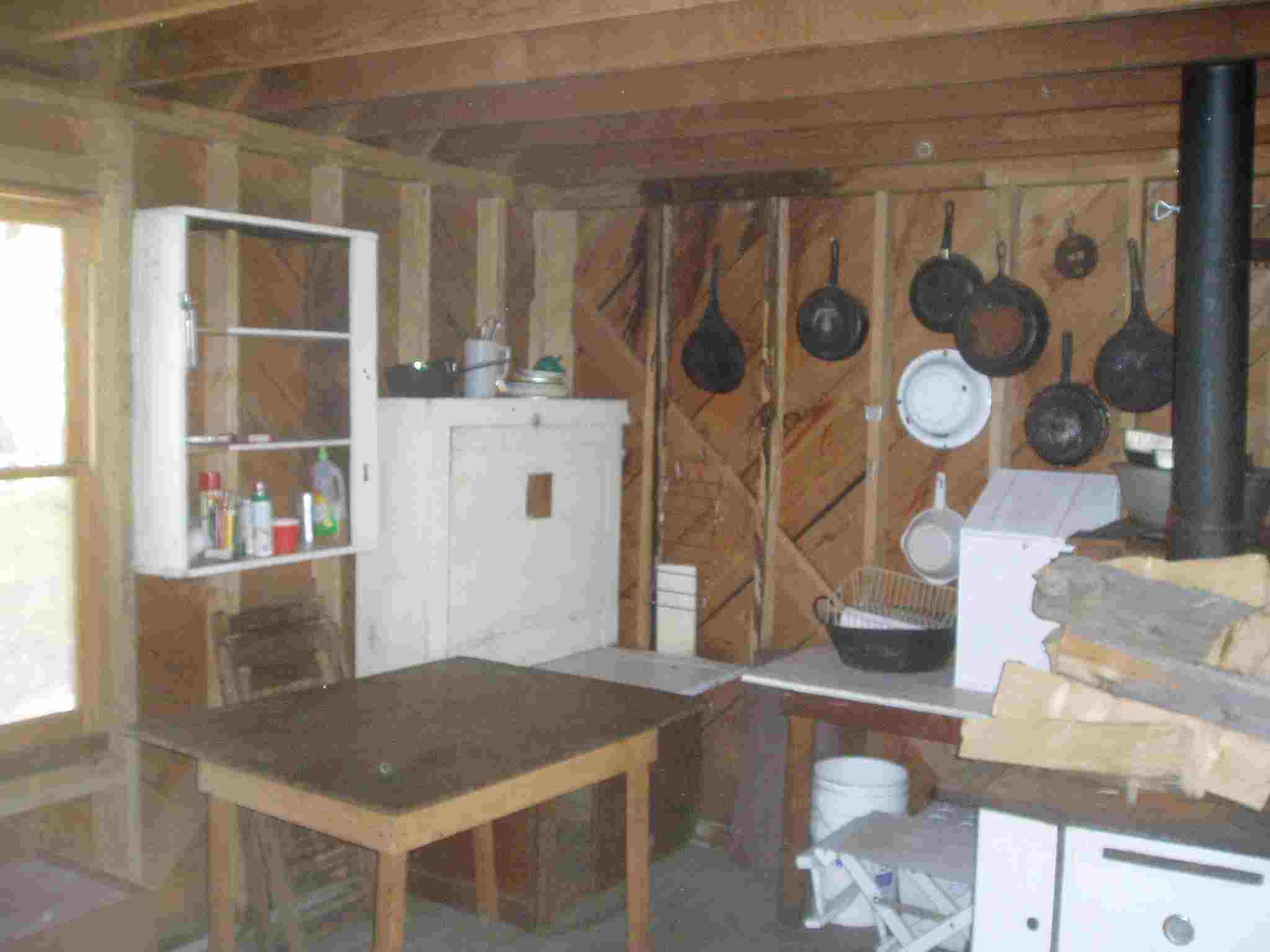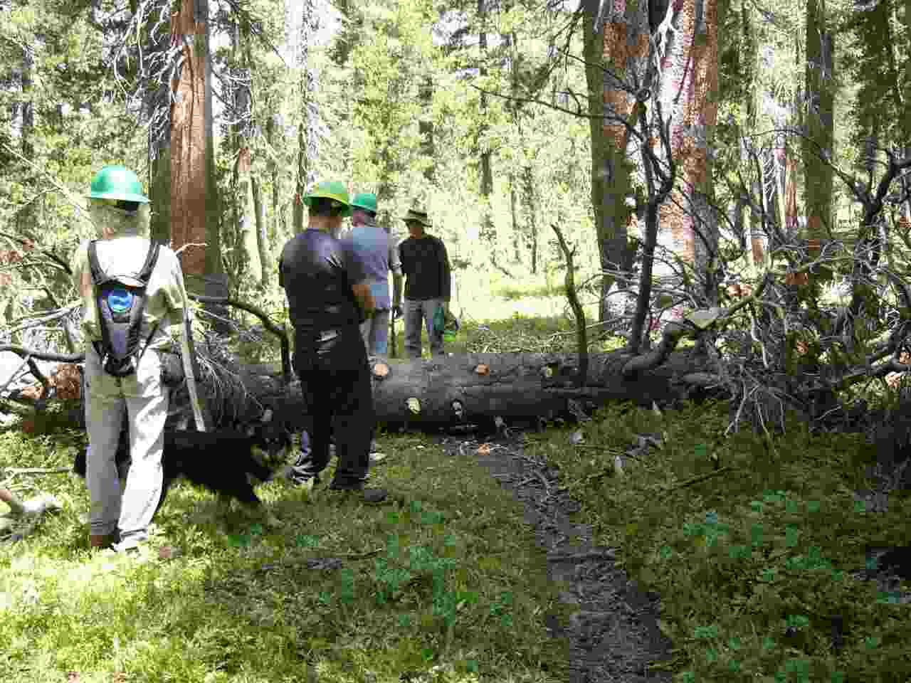 Kitchen area, first morning. (Friday) Today my task is to get a crew of all first timers and go to Rowell Meadow where the week long team has been working. They have left two "problem" trees for us, and some minor additional work. When they get packed out, they will be leaving a rock bar and two man crosscut saw behind for us.