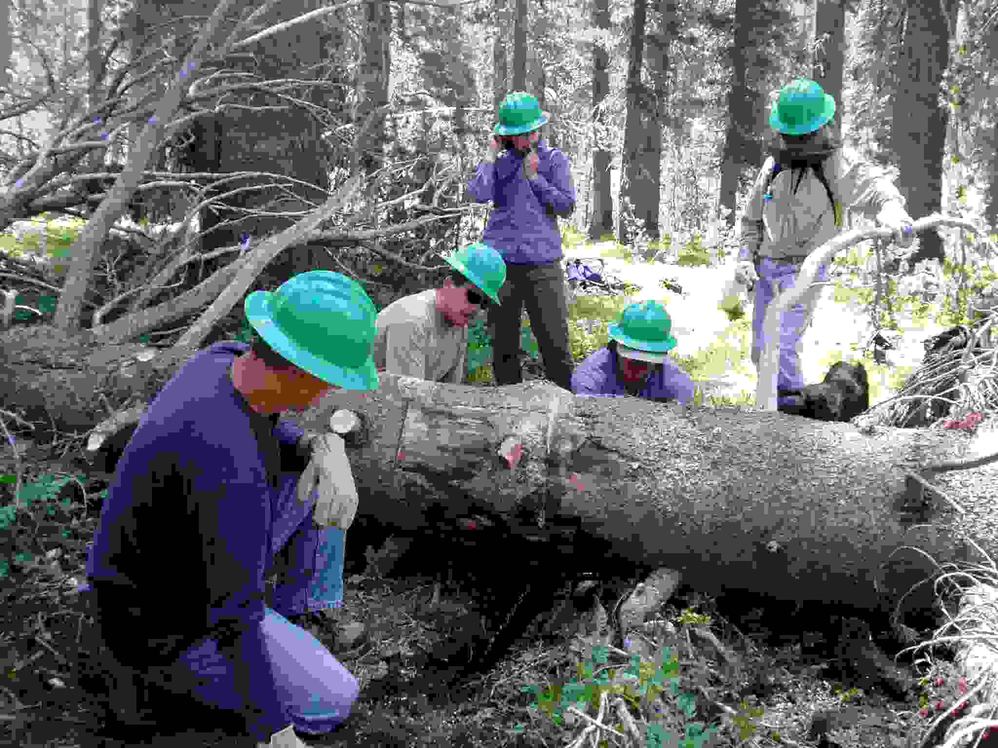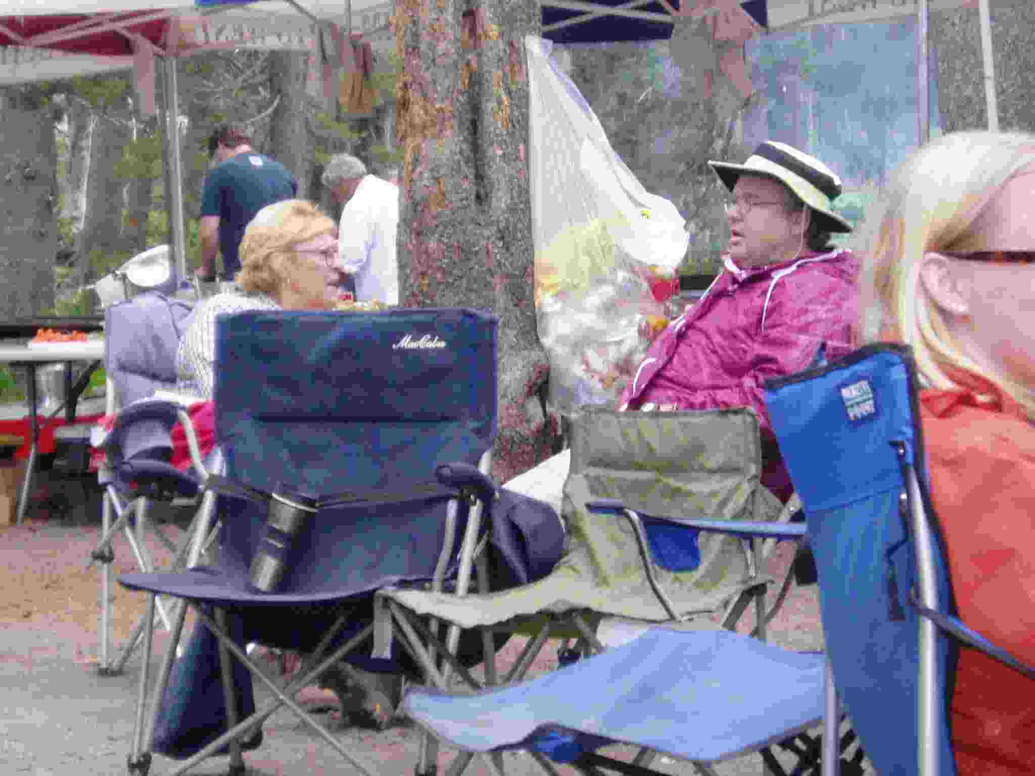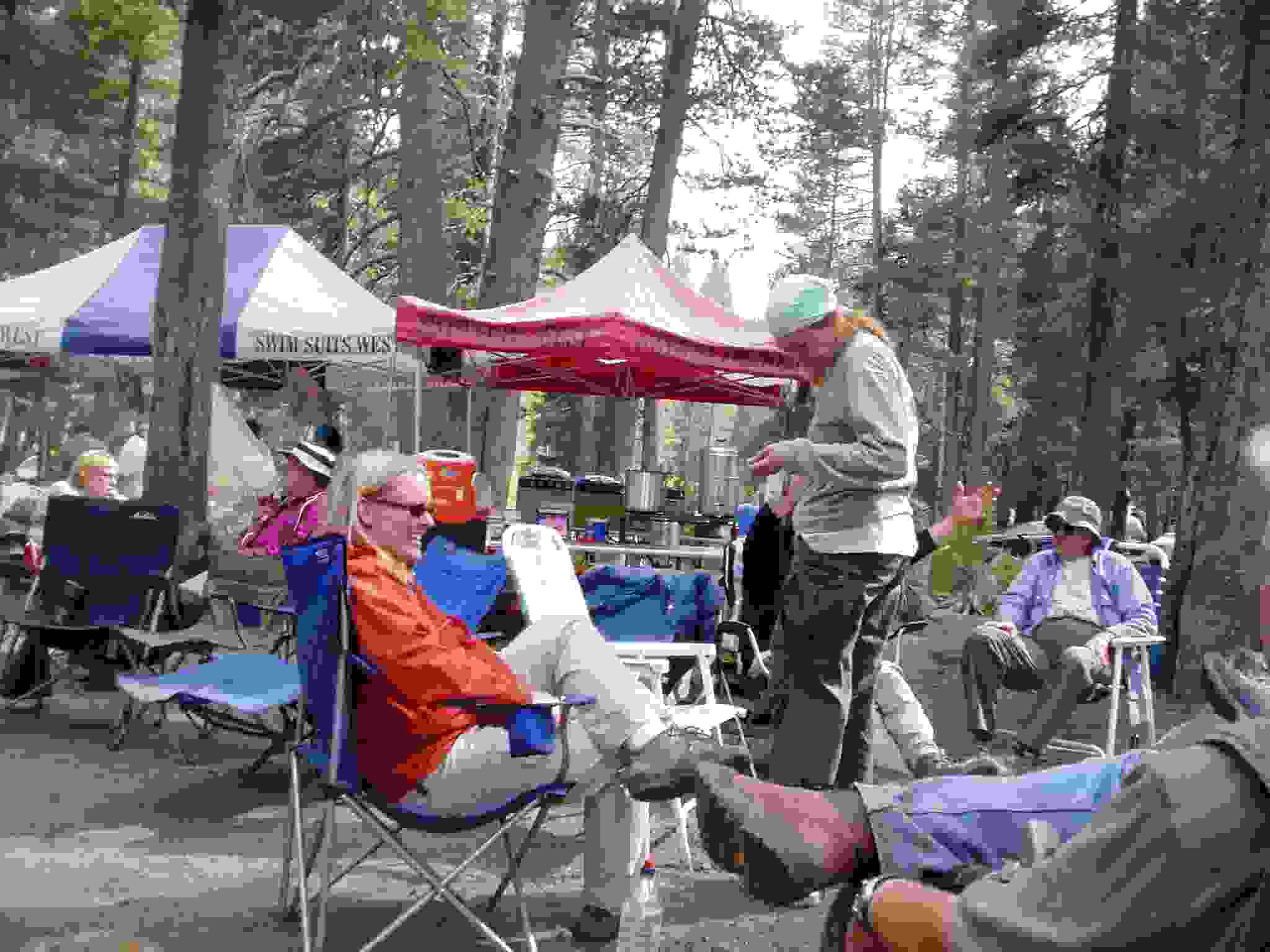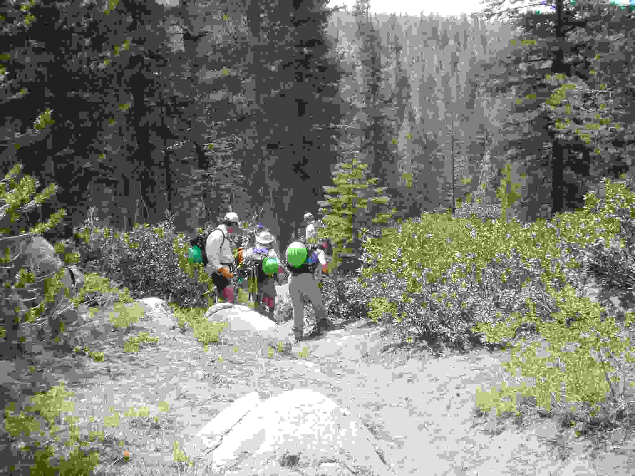 Kitchen area, first morning. (Friday) Today my task is to get a crew of all first timers and go to Rowell Meadow where the week long team has been working. They have left two "problem" trees for us, and some minor additional work. When they get packed out, they will be leaving a rock bar and two man crosscut saw behind for us.