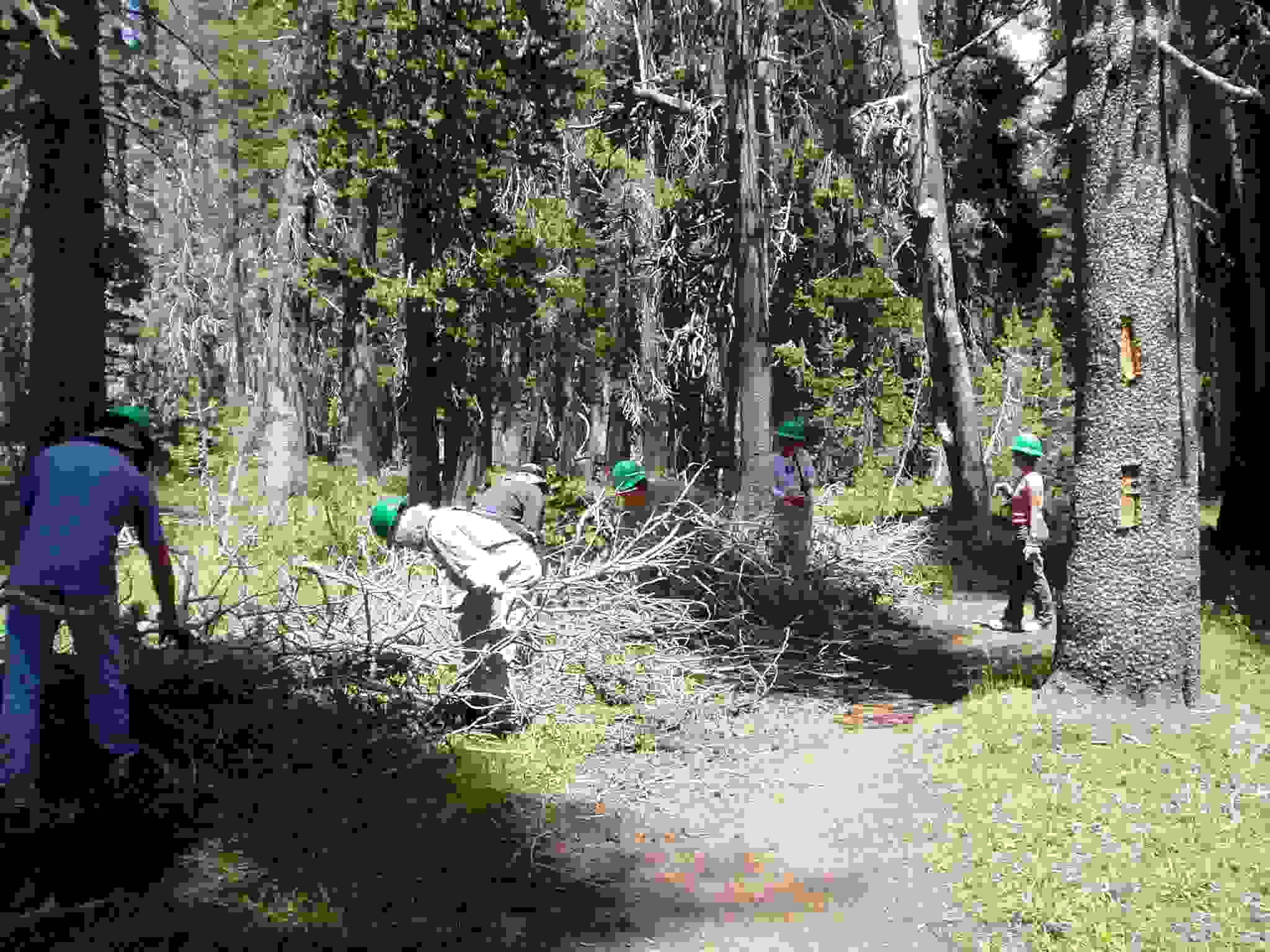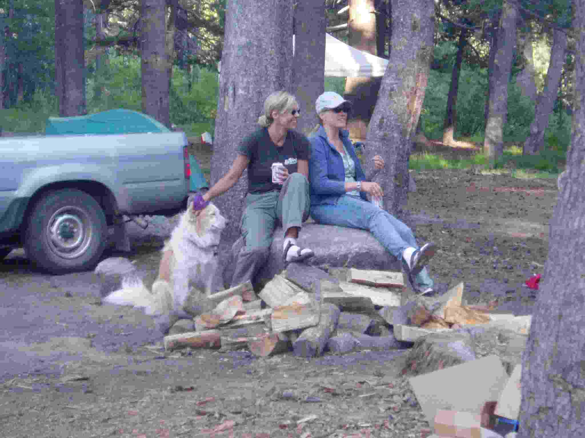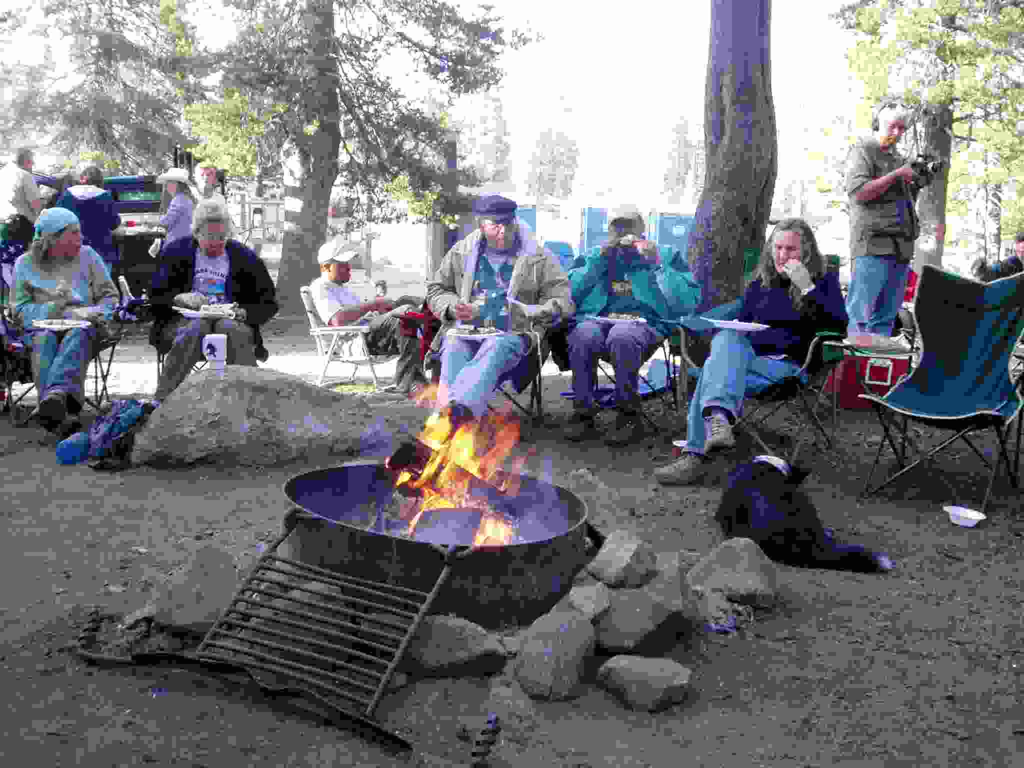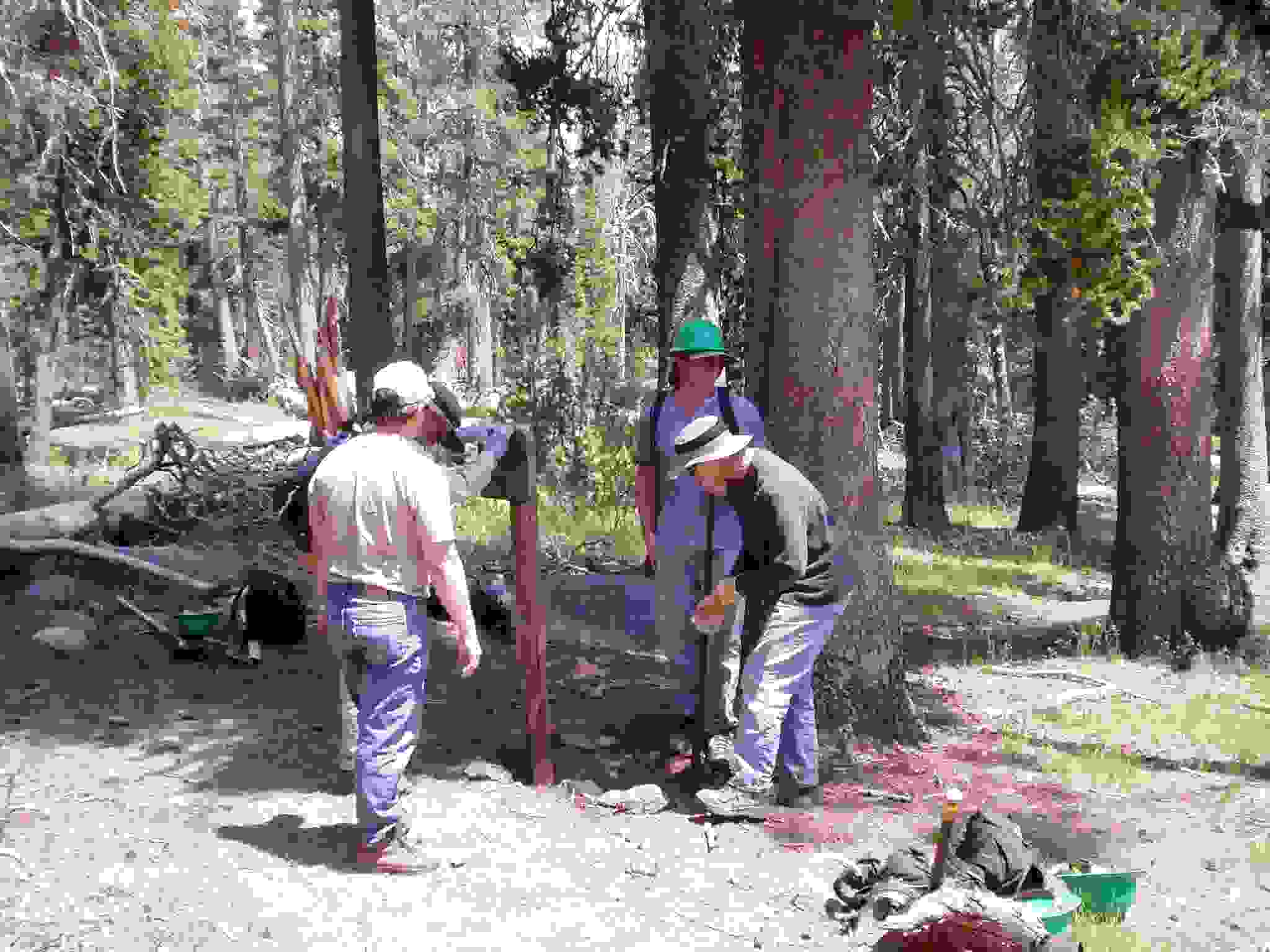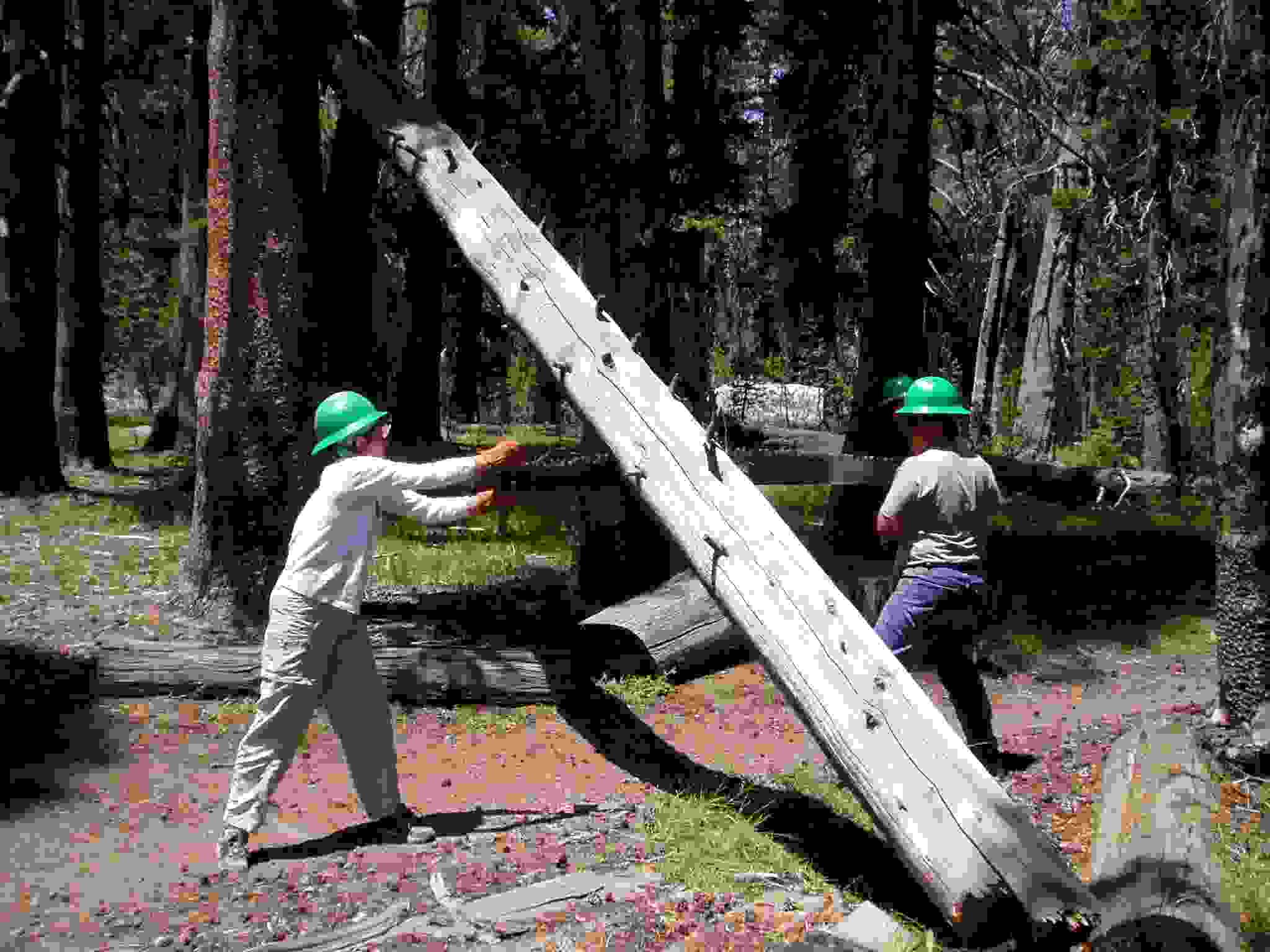 Kitchen area, first morning. (Friday) Today my task is to get a crew of all first timers and go to Rowell Meadow where the week long team has been working. They have left two "problem" trees for us, and some minor additional work. When they get packed out, they will be leaving a rock bar and two man crosscut saw behind for us.