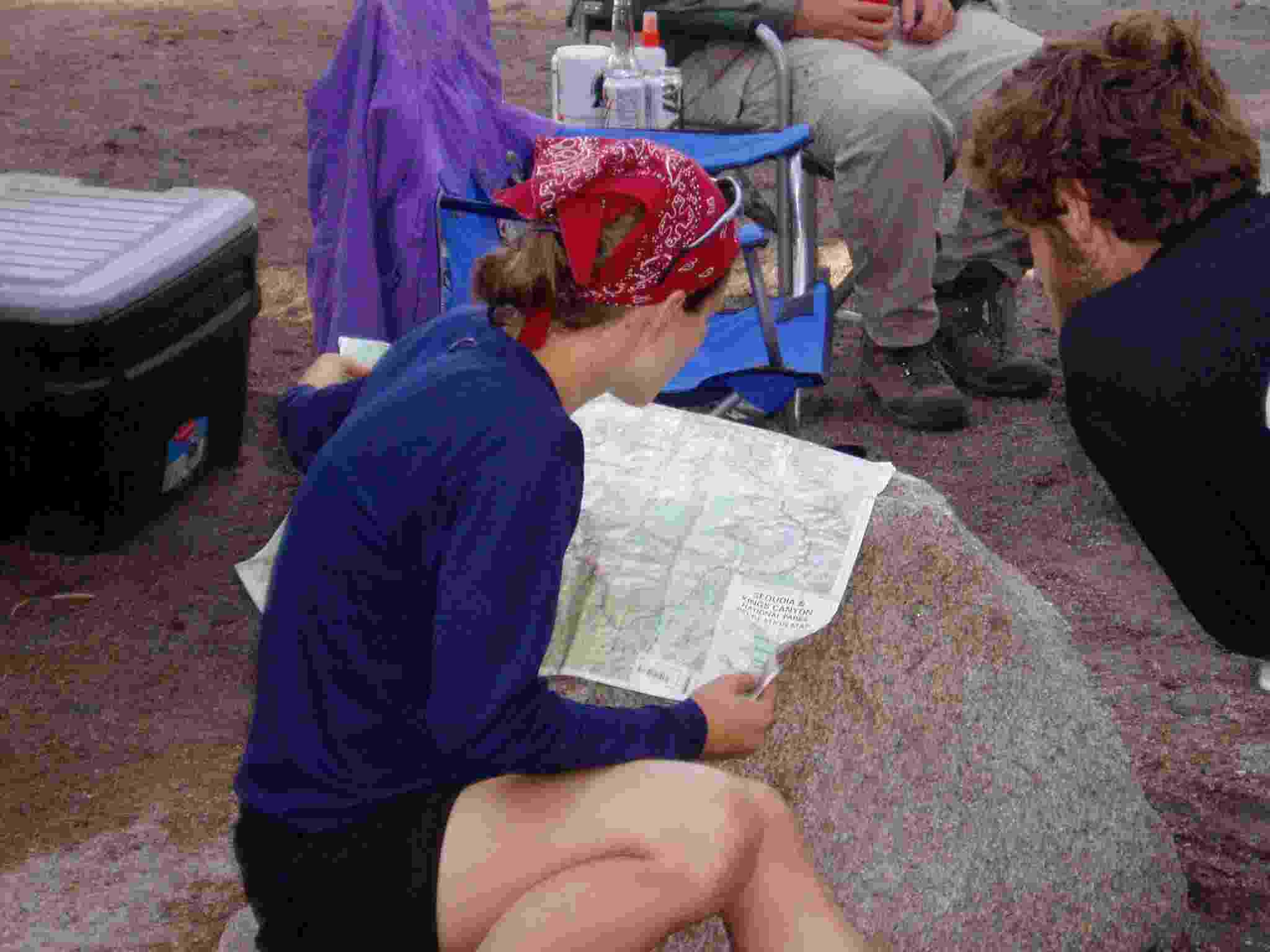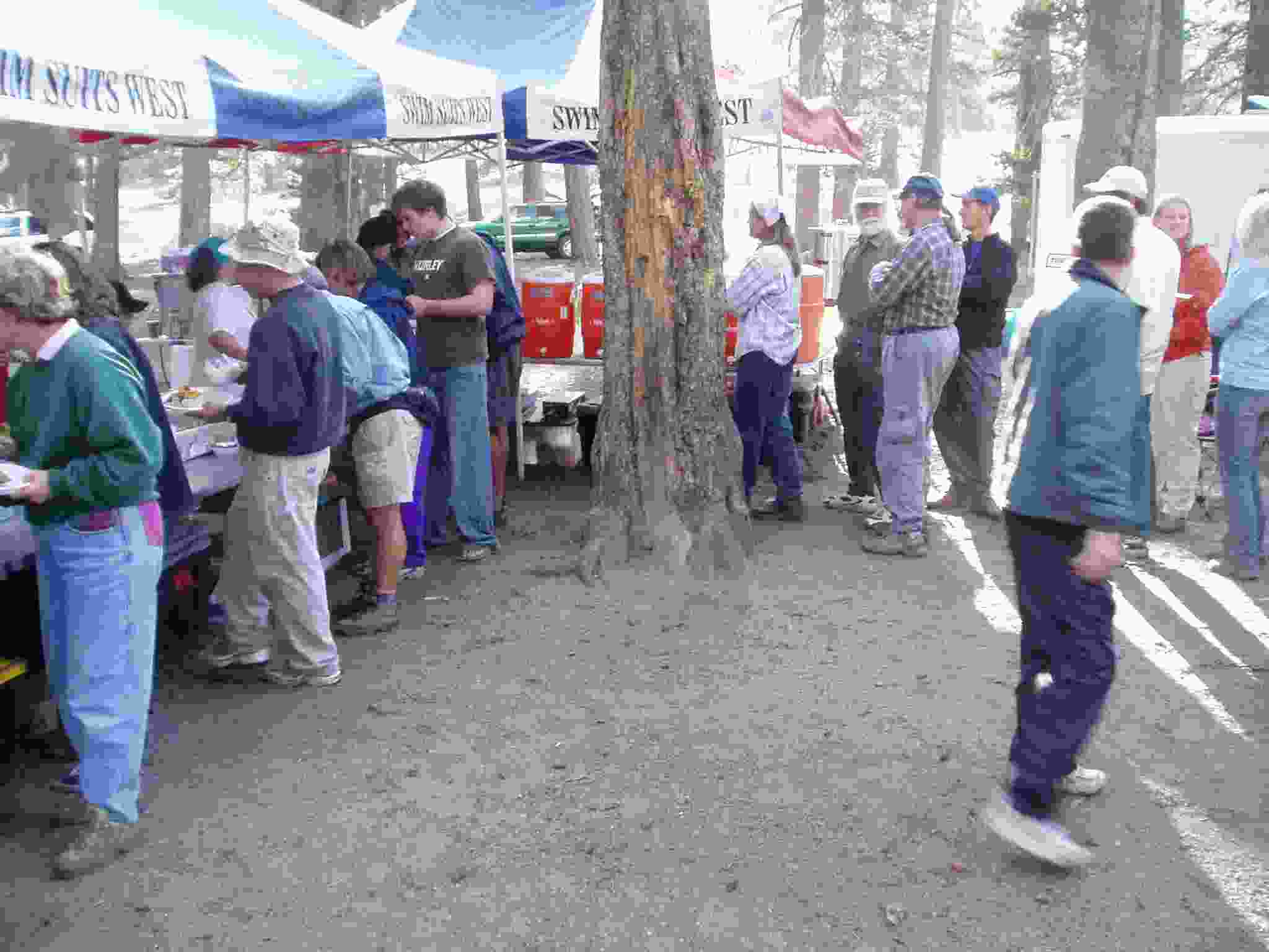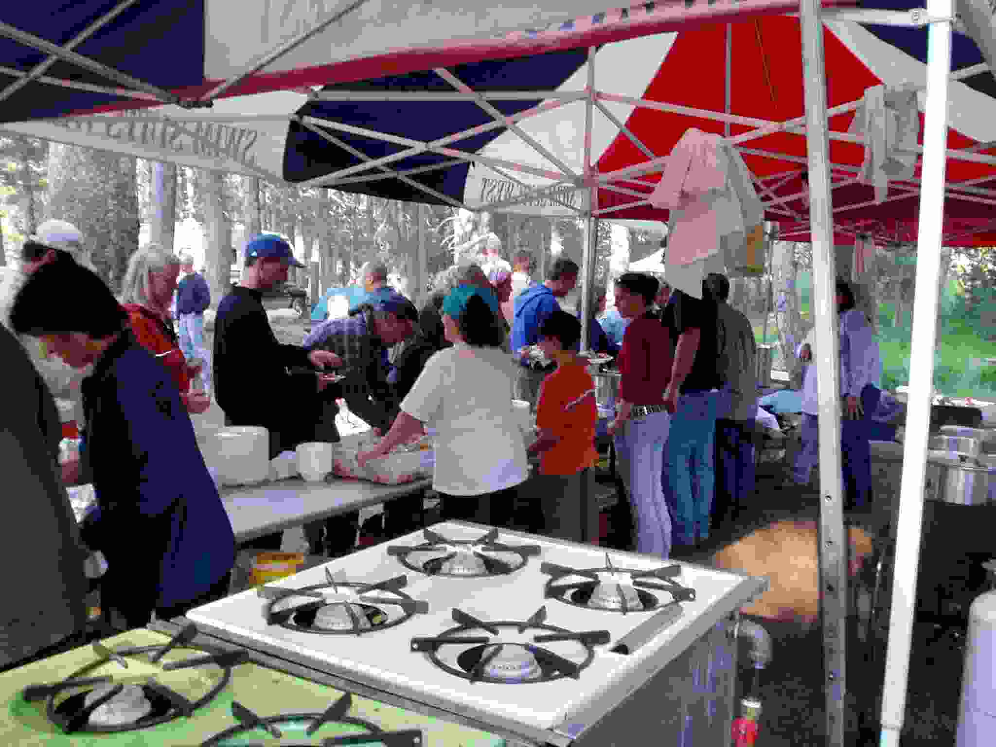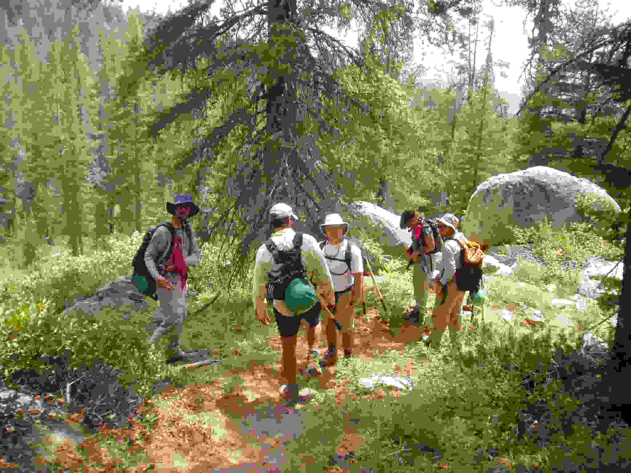 Kitchen area, first morning. (Friday) Today my task is to get a crew of all first timers and go to Rowell Meadow where the week long team has been working. They have left two "problem" trees for us, and some minor additional work. When they get packed out, they will be leaving a rock bar and two man crosscut saw behind for us.