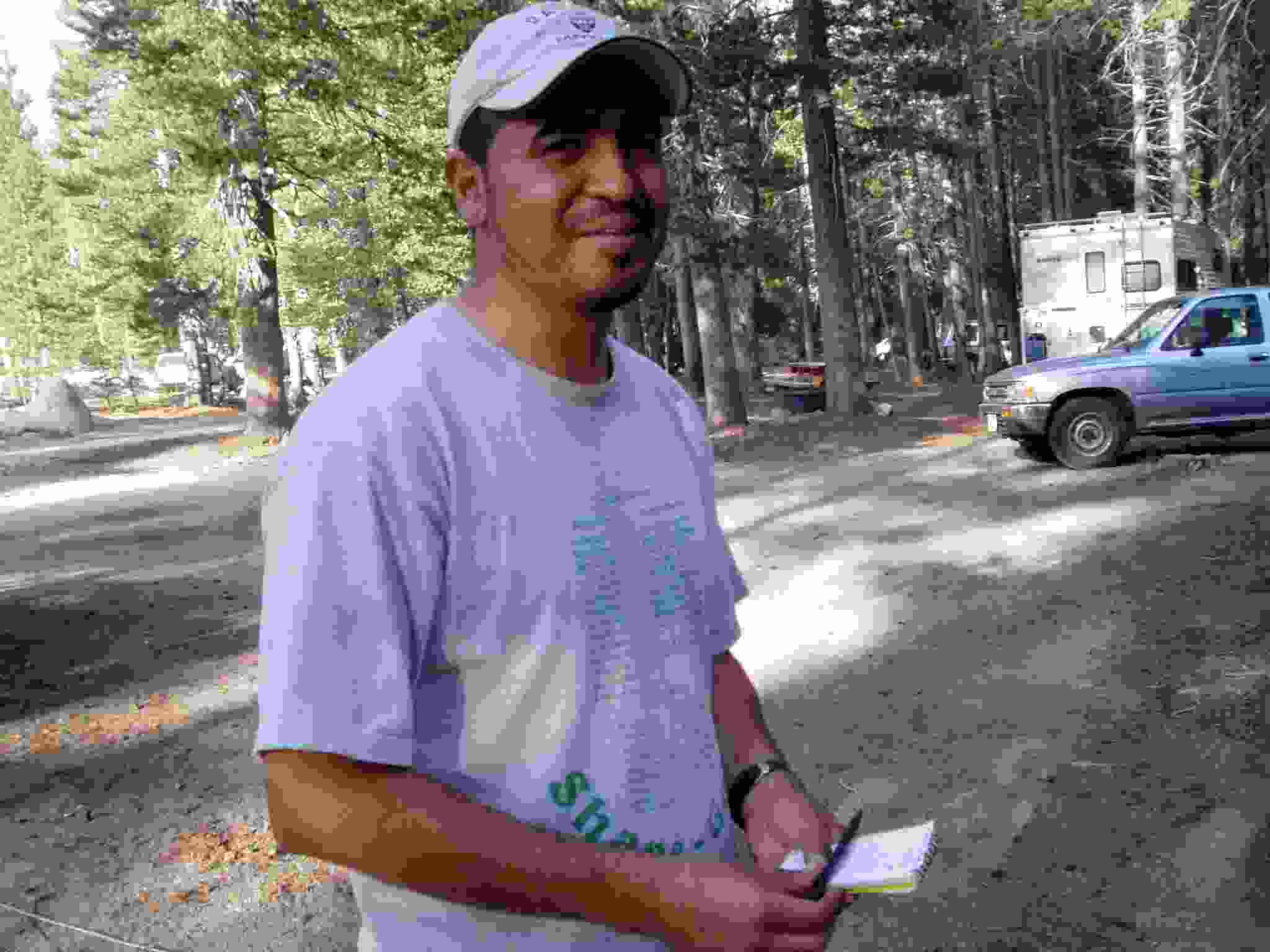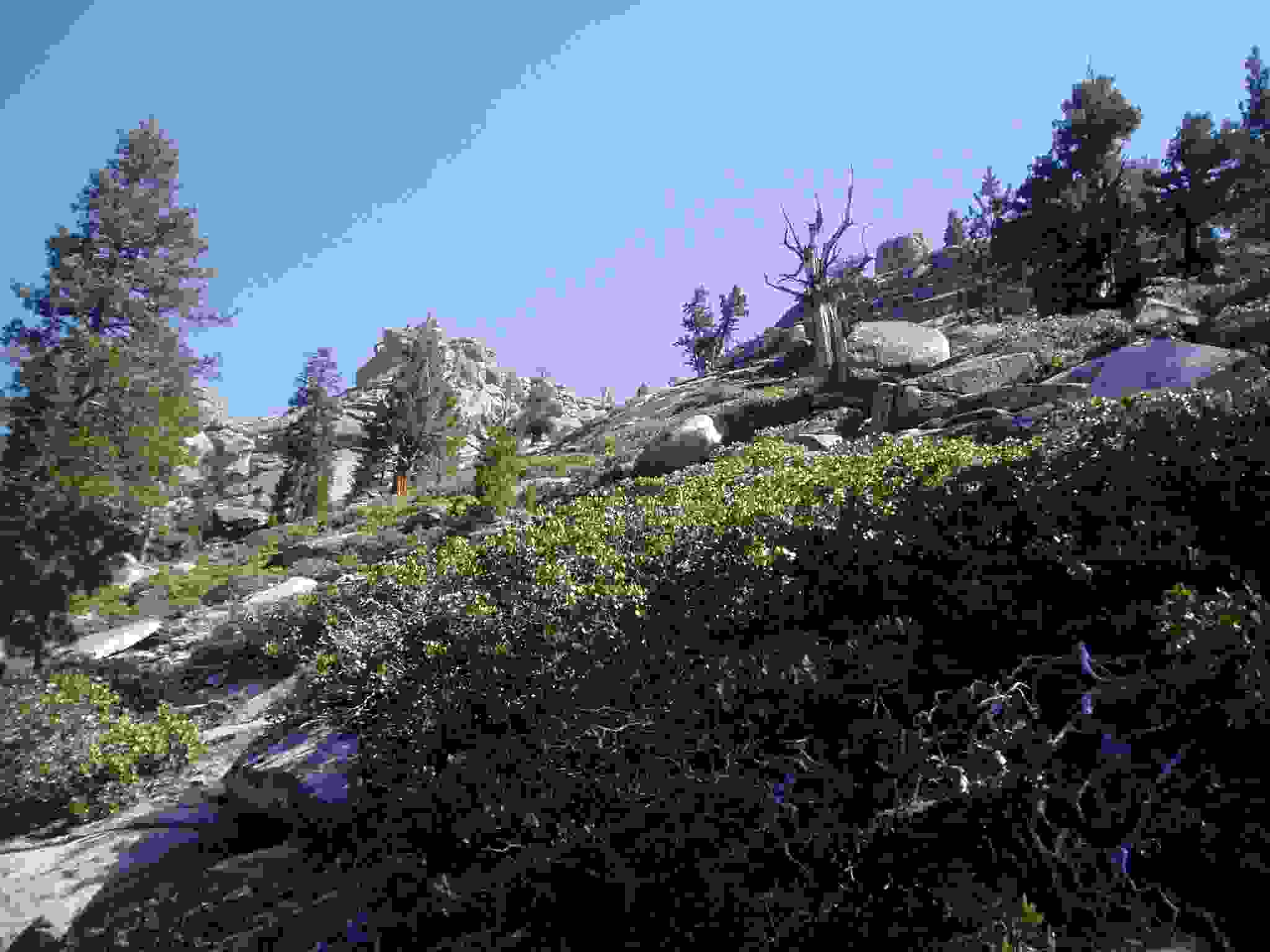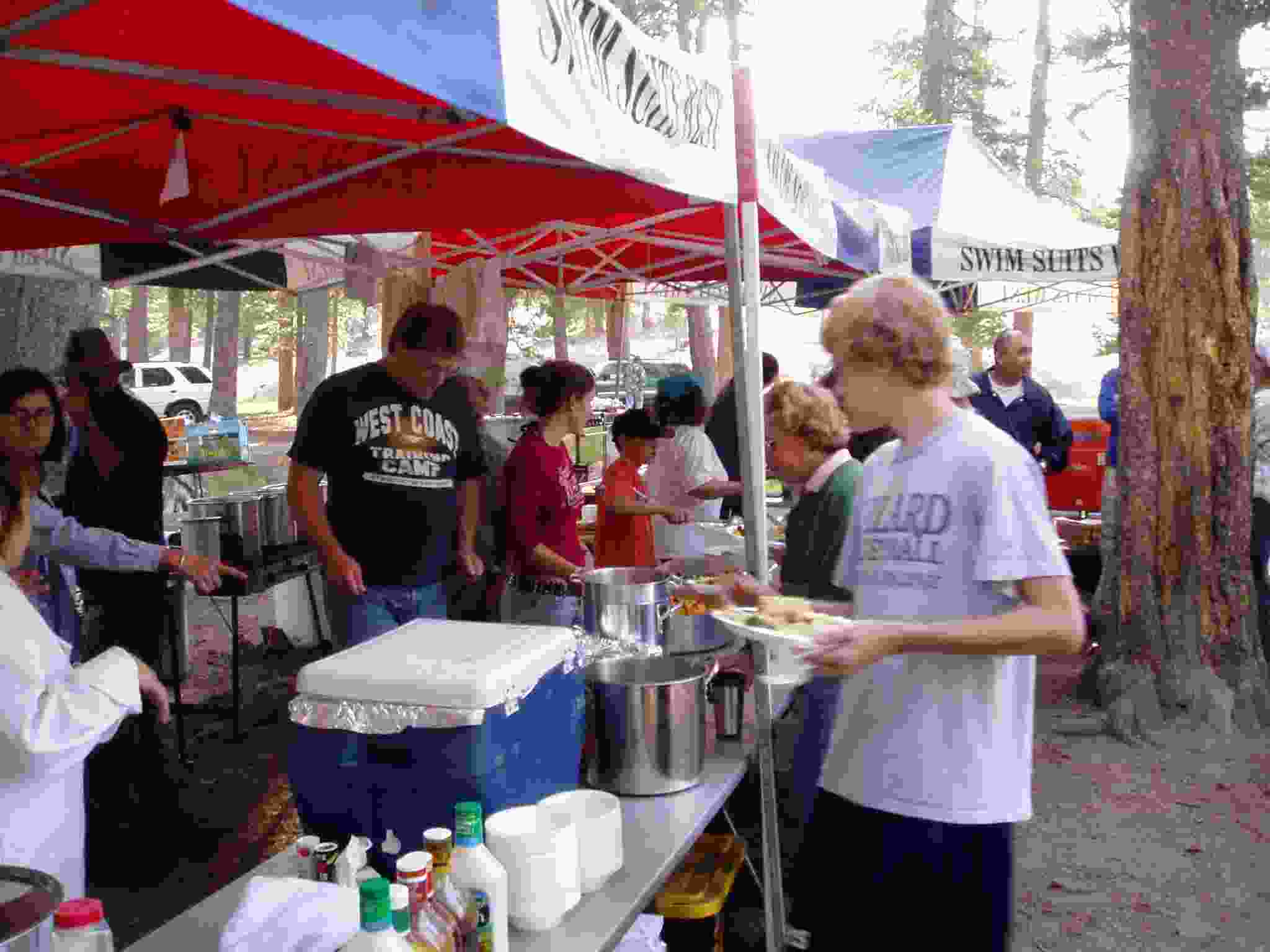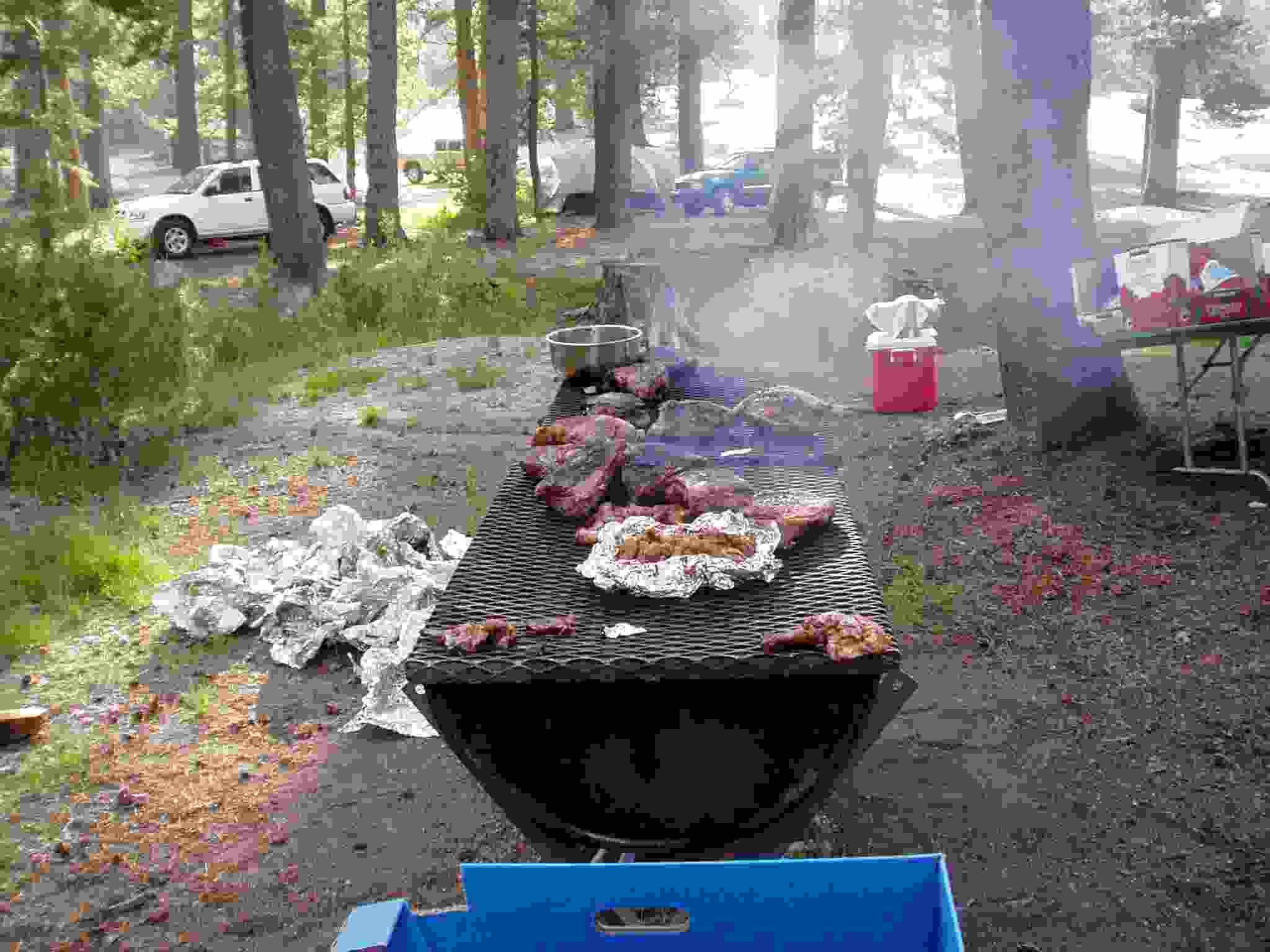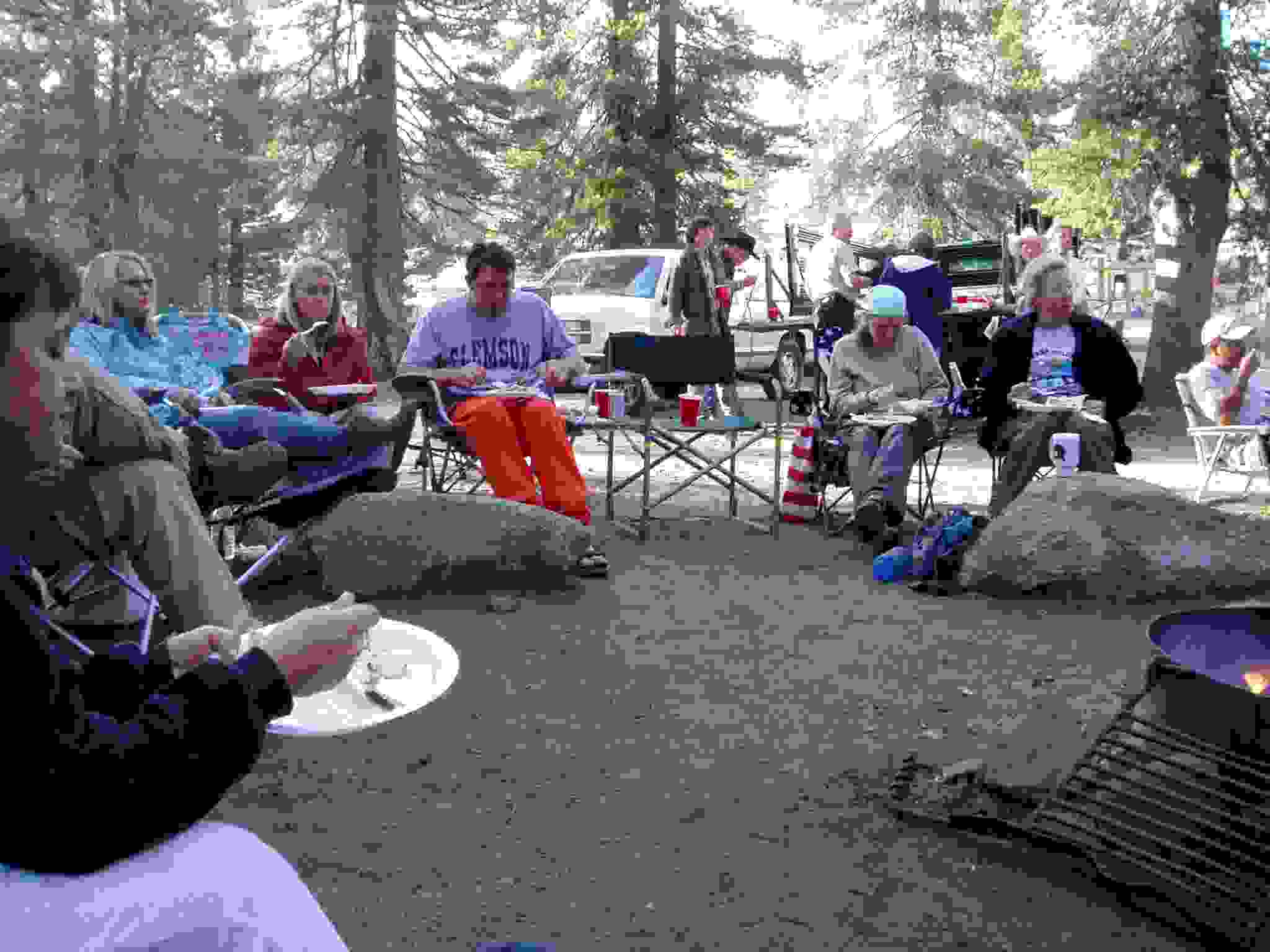Kitchen area, first morning. (Friday) Today my task is to get a crew of all first timers and go to Rowell Meadow where the week long team has been working. They have left two "problem" trees for us, and some minor additional work. When they get packed out, they will be leaving a rock bar and two man crosscut saw behind for us.