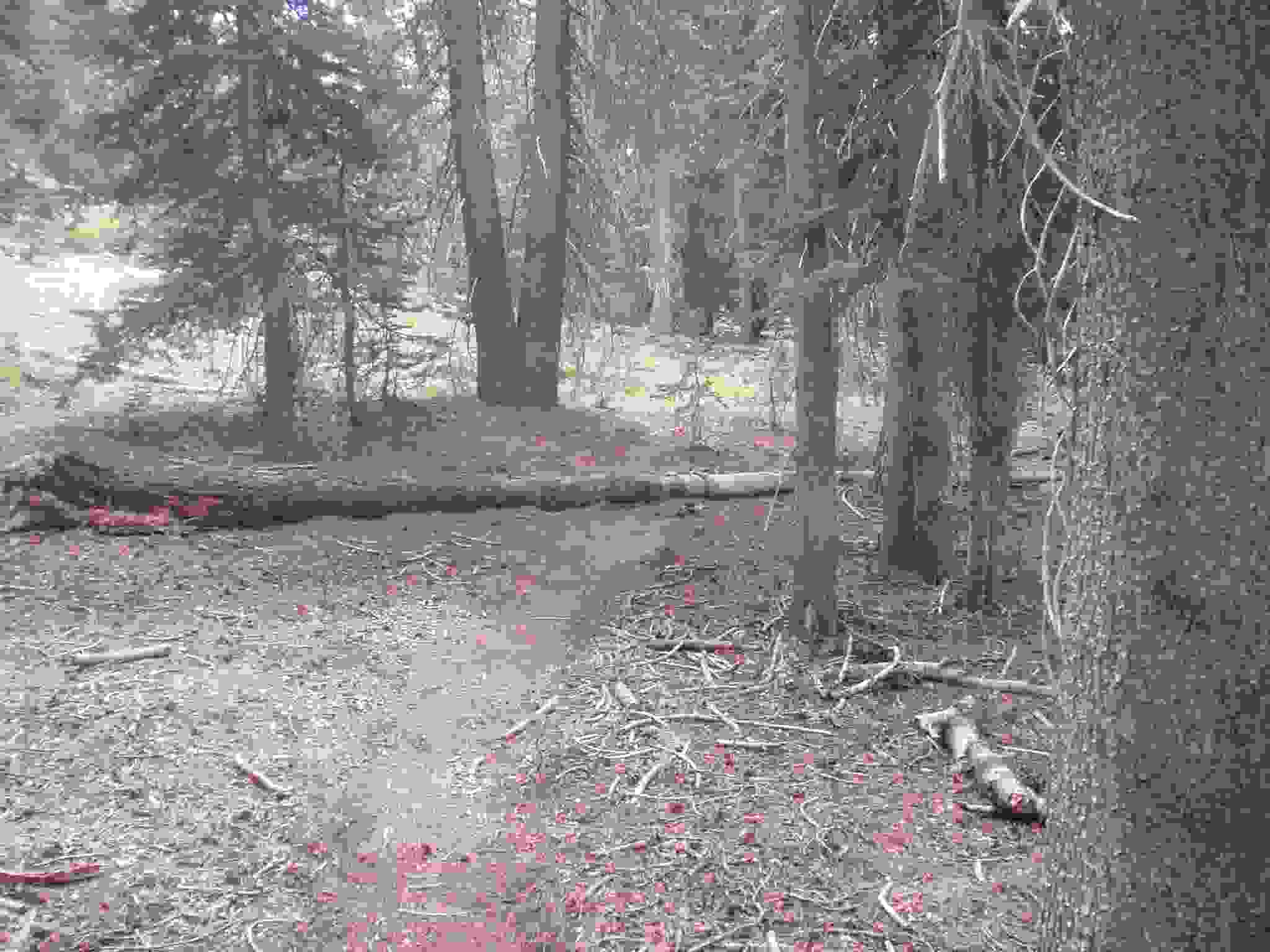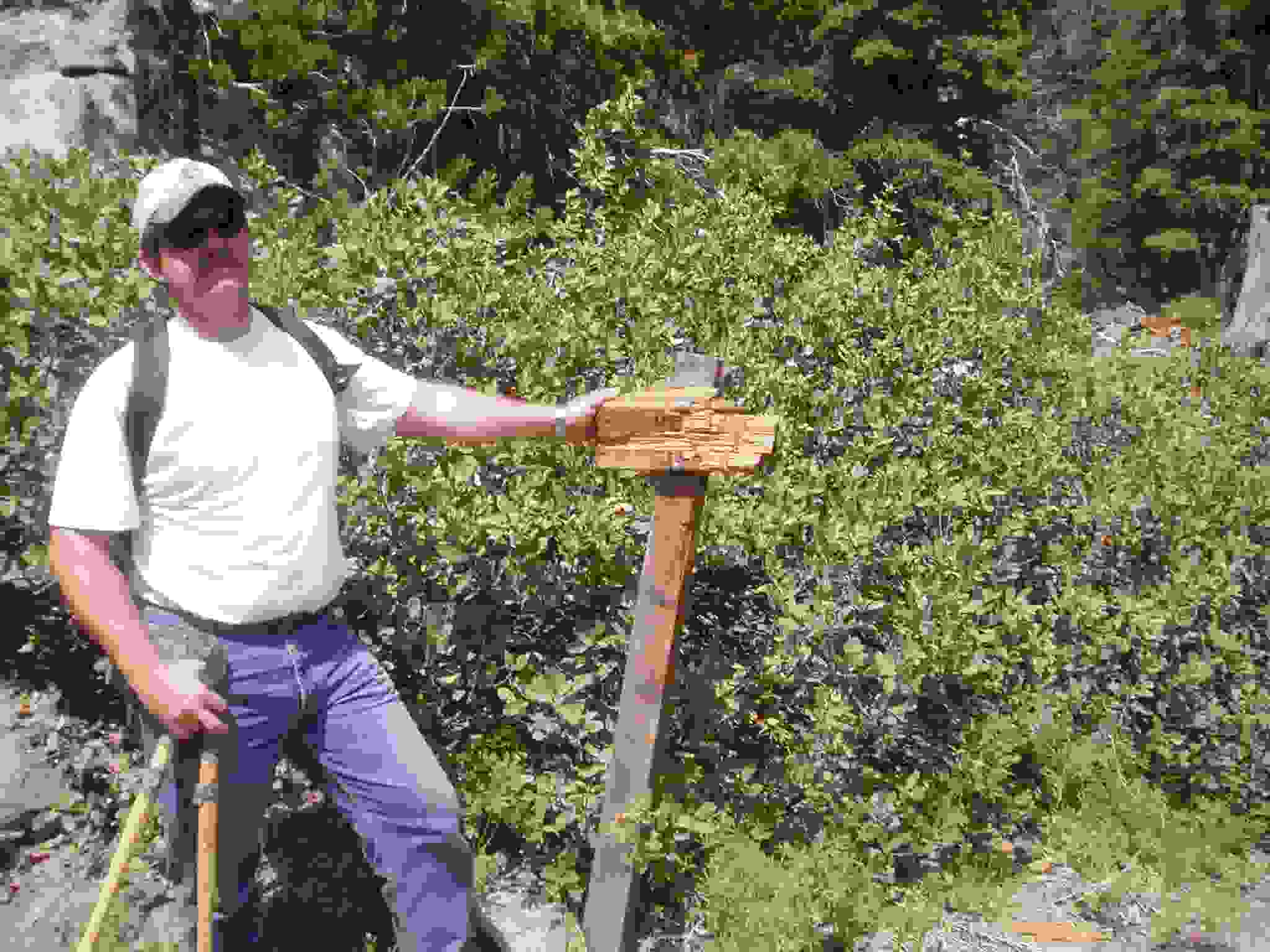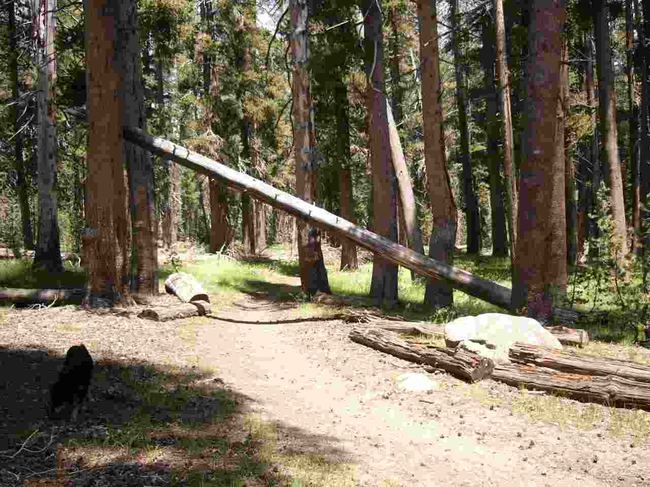 Here is the "leaner" that the week long crew left for us. It is just the right height to hit a horse rider in the head when they pass under it. Here at the trail side it is about six feet eight inches high, on the low side.