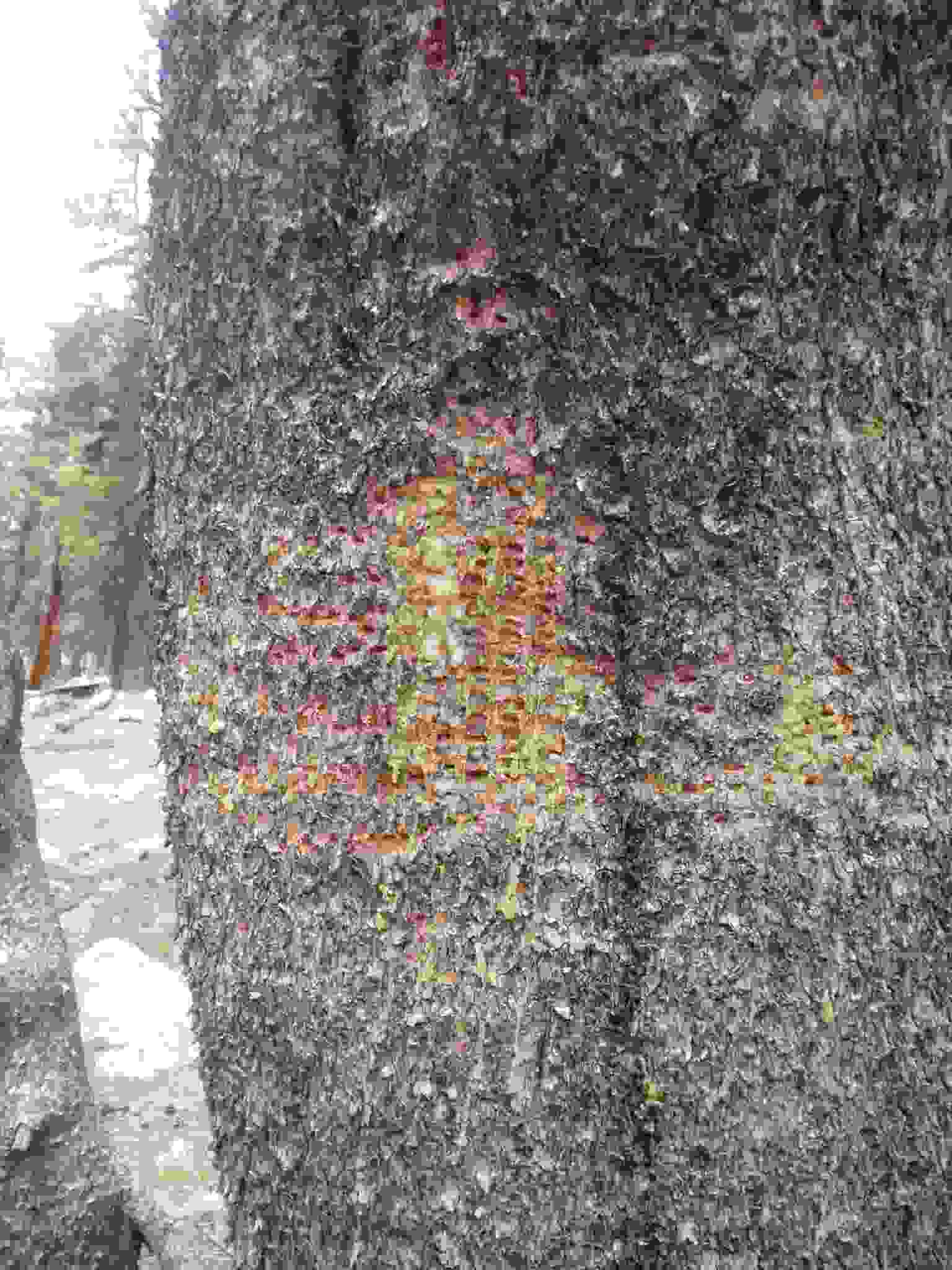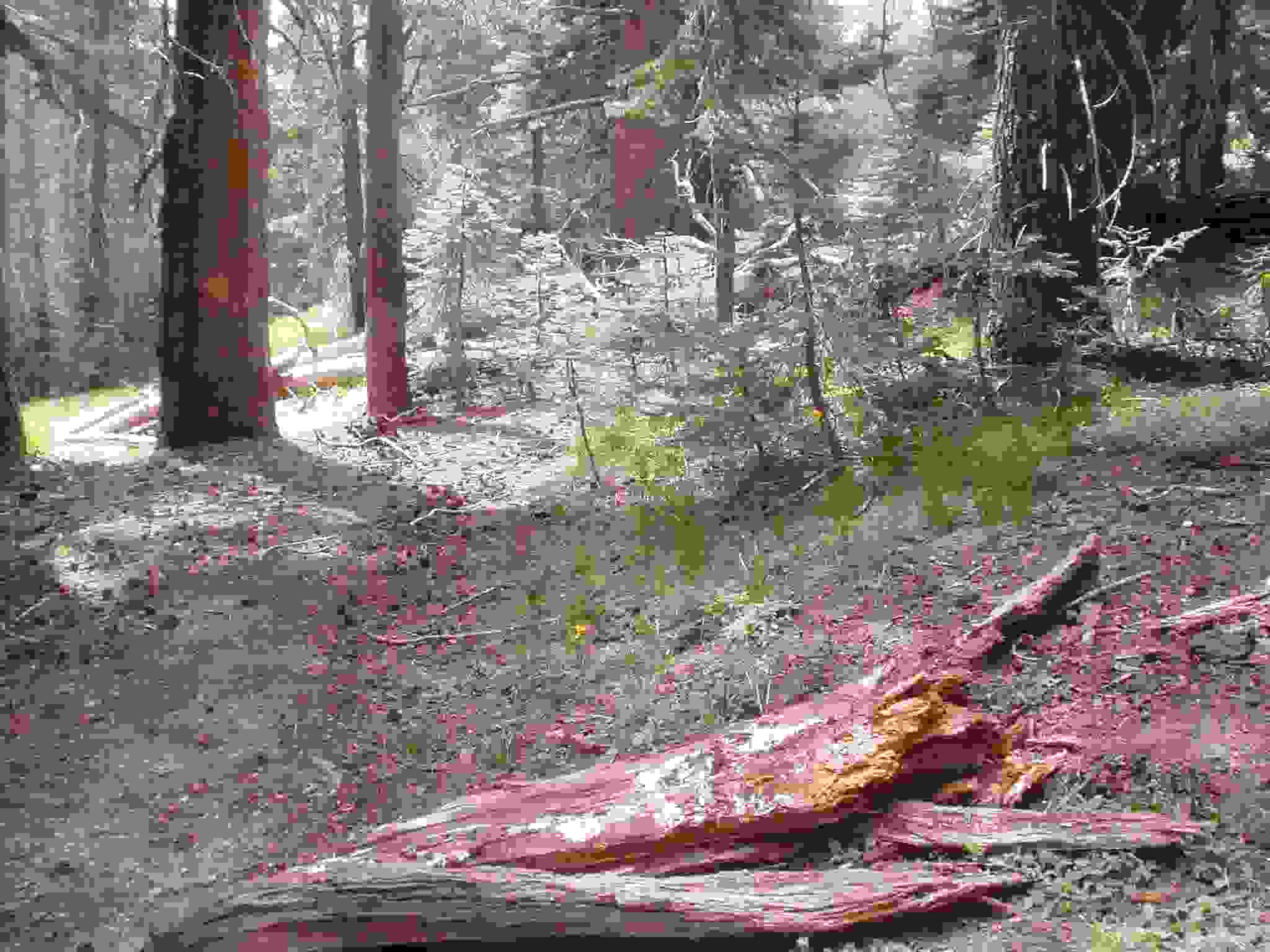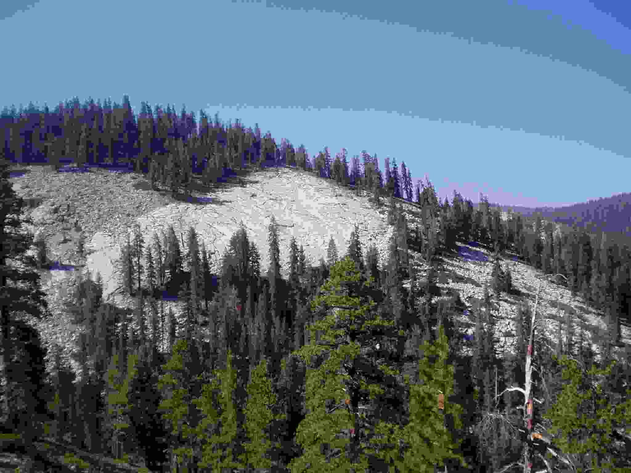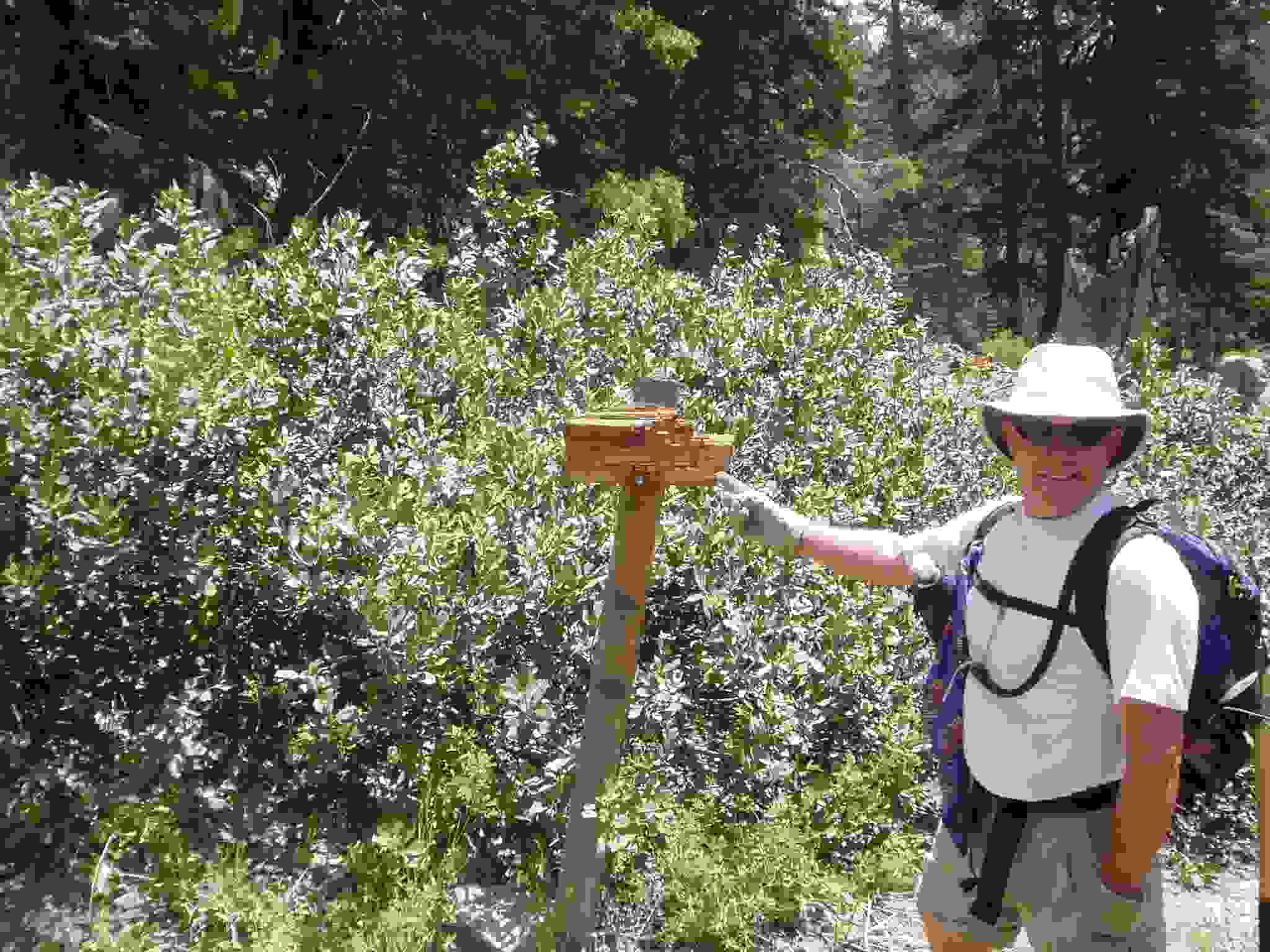 Here is the "leaner" that the week long crew left for us. It is just the right height to hit a horse rider in the head when they pass under it. Here at the trail side it is about six feet eight inches high, on the low side.