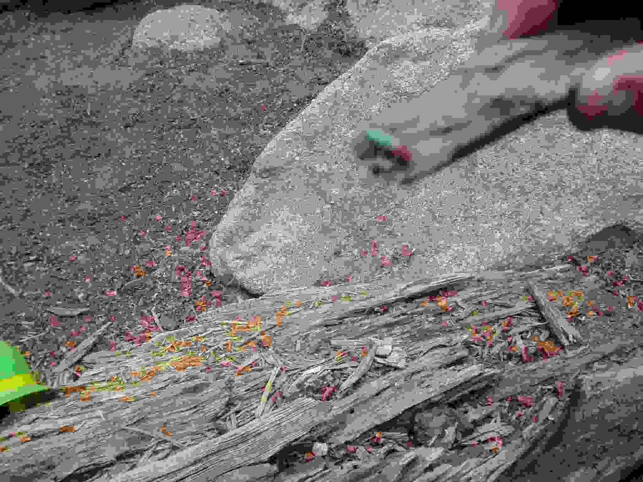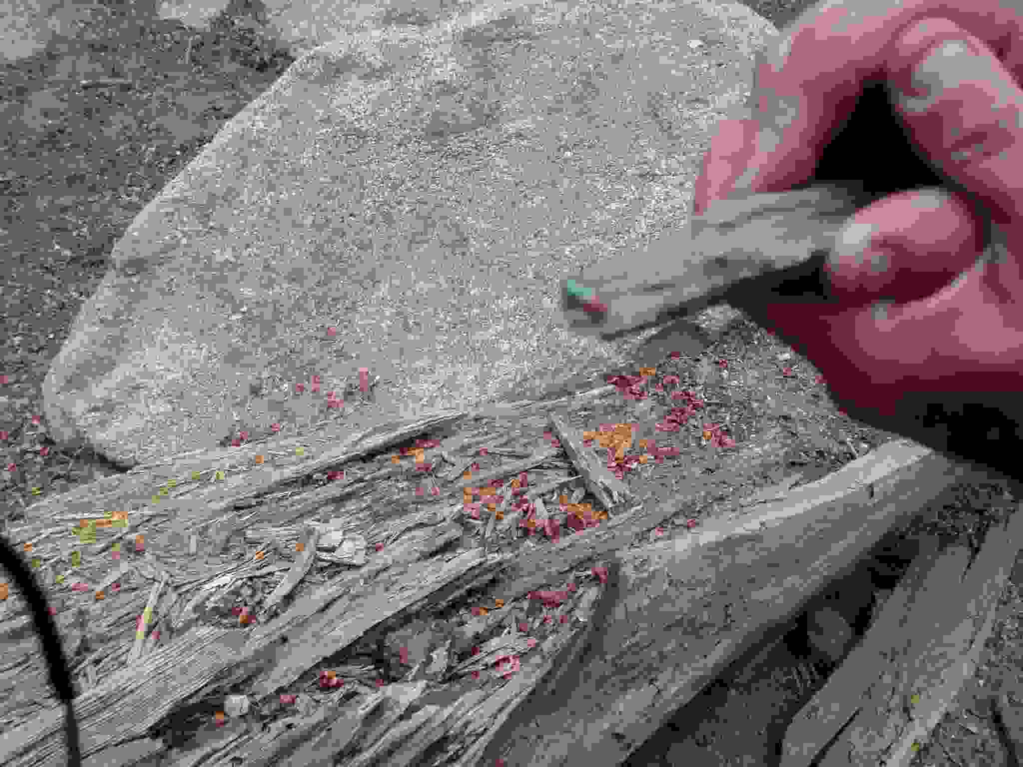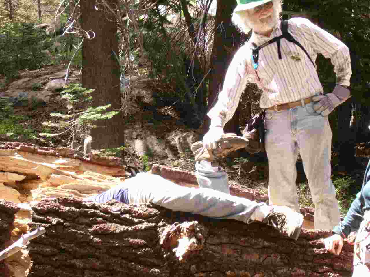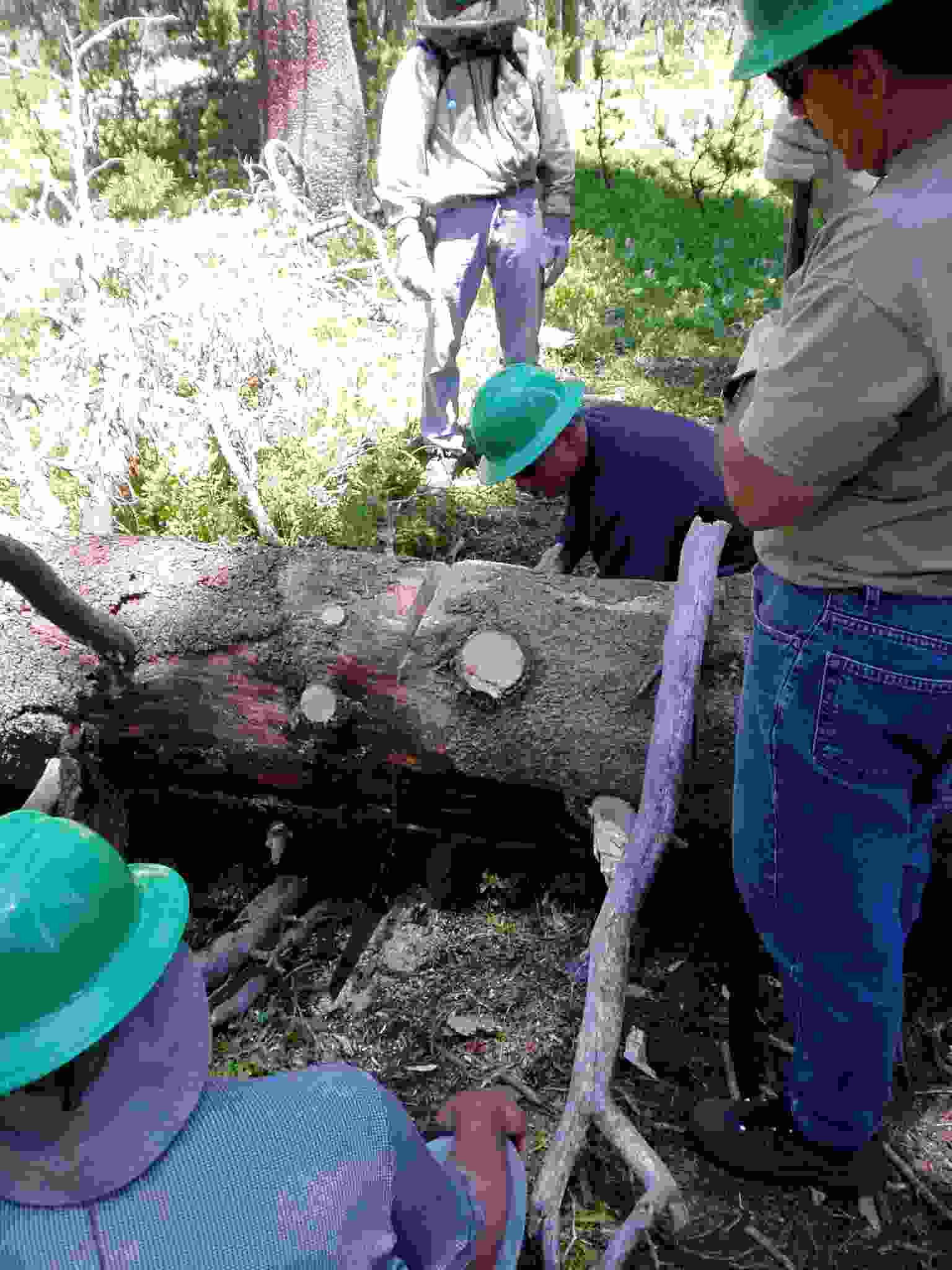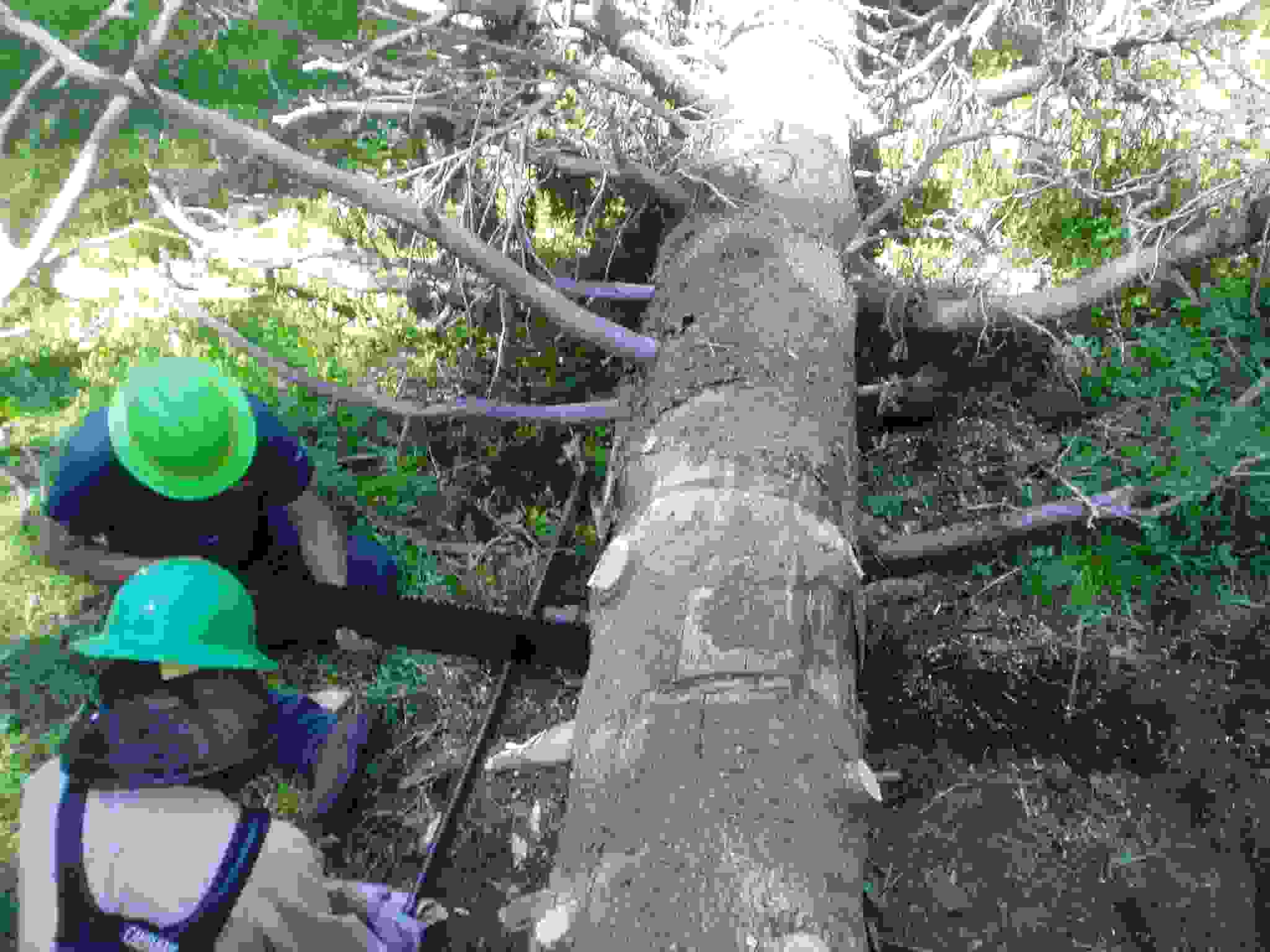 We decided to do an "under buck" cut and cut up from the bottom and hit the cut that the week long crew started. Here I, Eric, am starting the cut. Note the small log underneath the saw. Under bucking is quite difficult as normal cutting uses the weight of the saw to do the cutting. Here we have to hold the saw up and then push it up more to get cutting done.