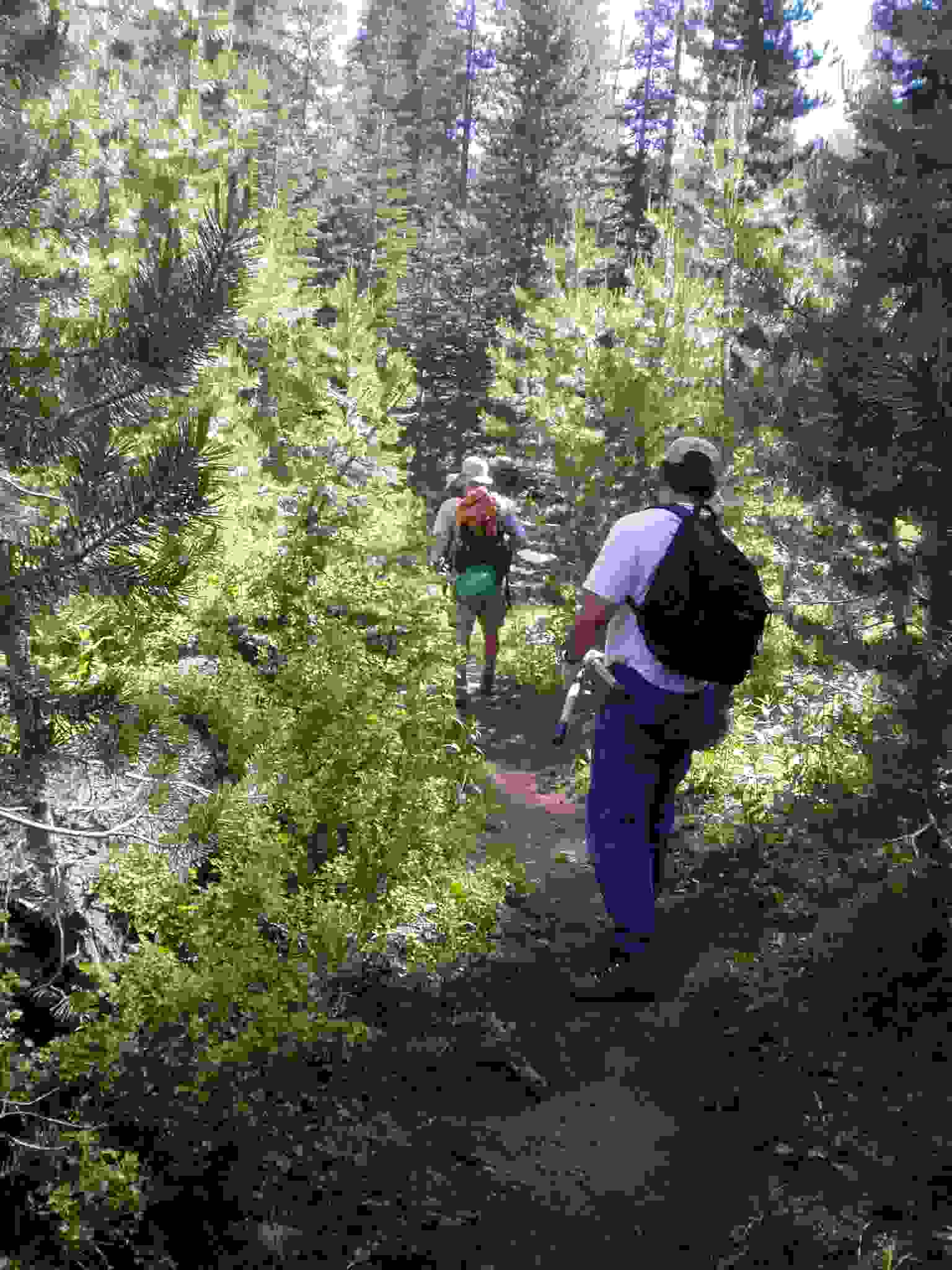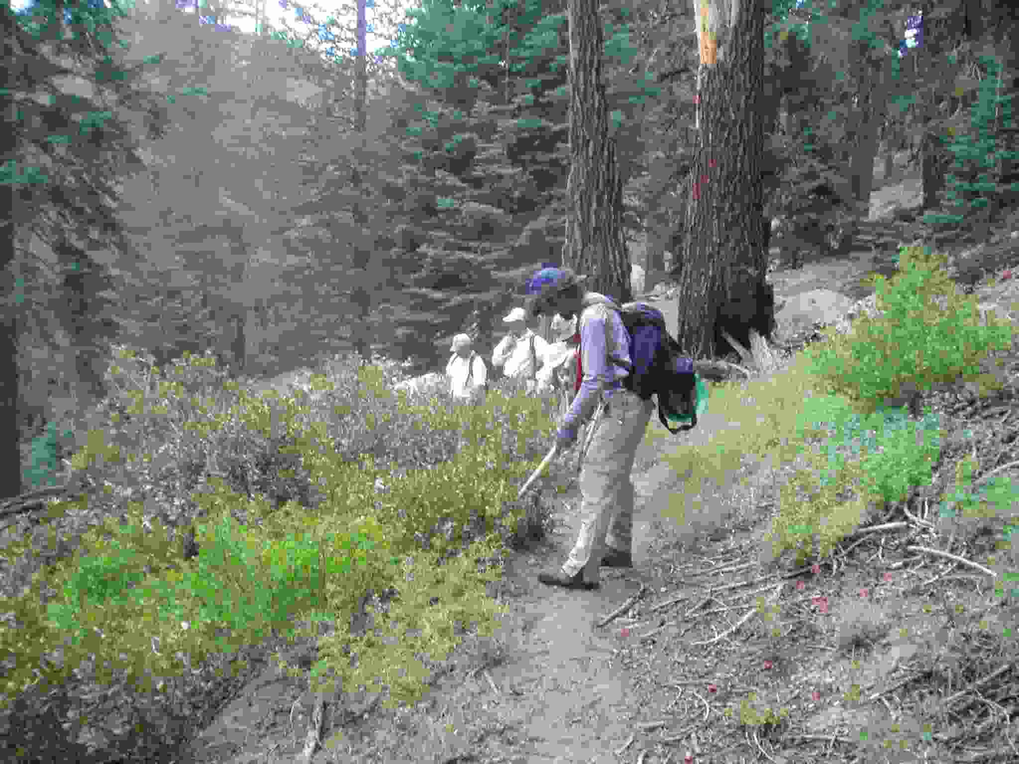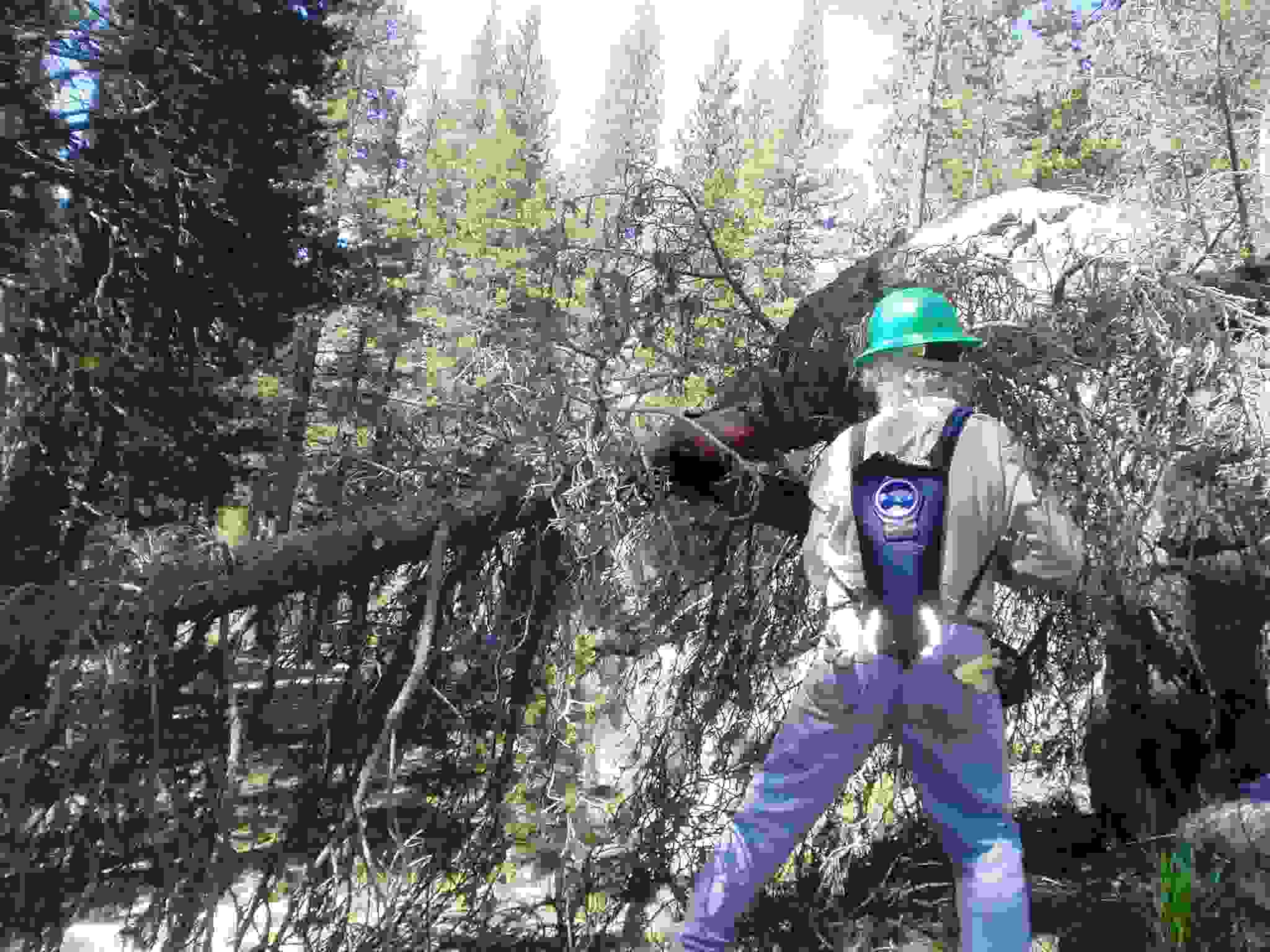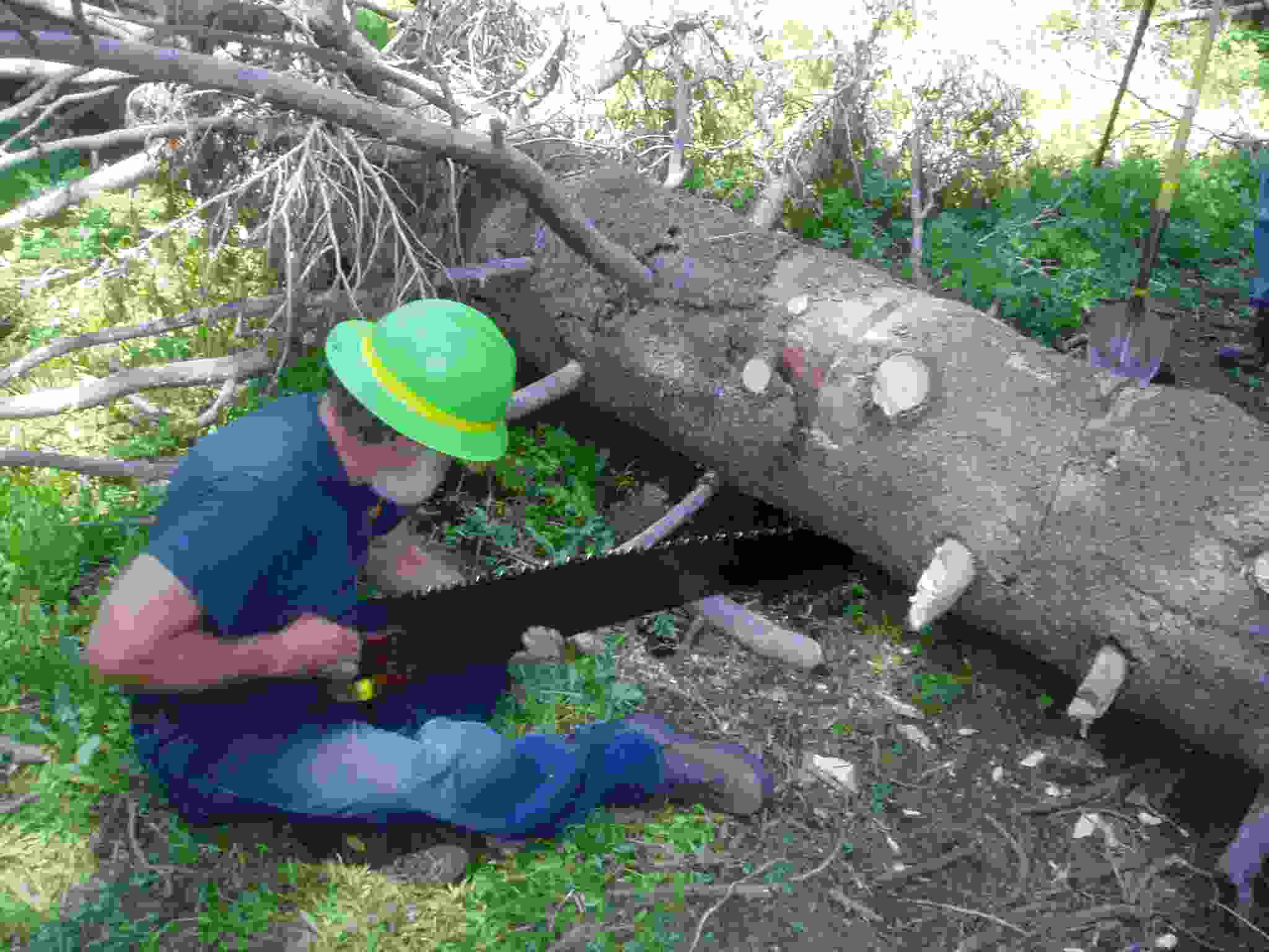 Art using my little four foot saw on a dead tree that is sticking too near the trail.
