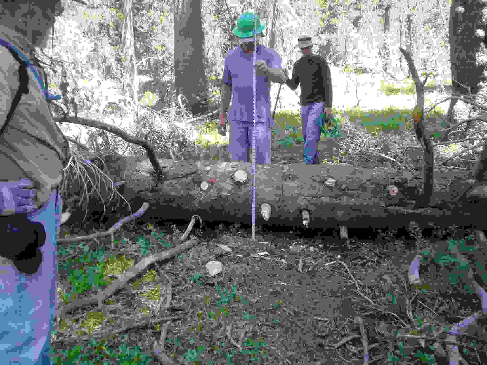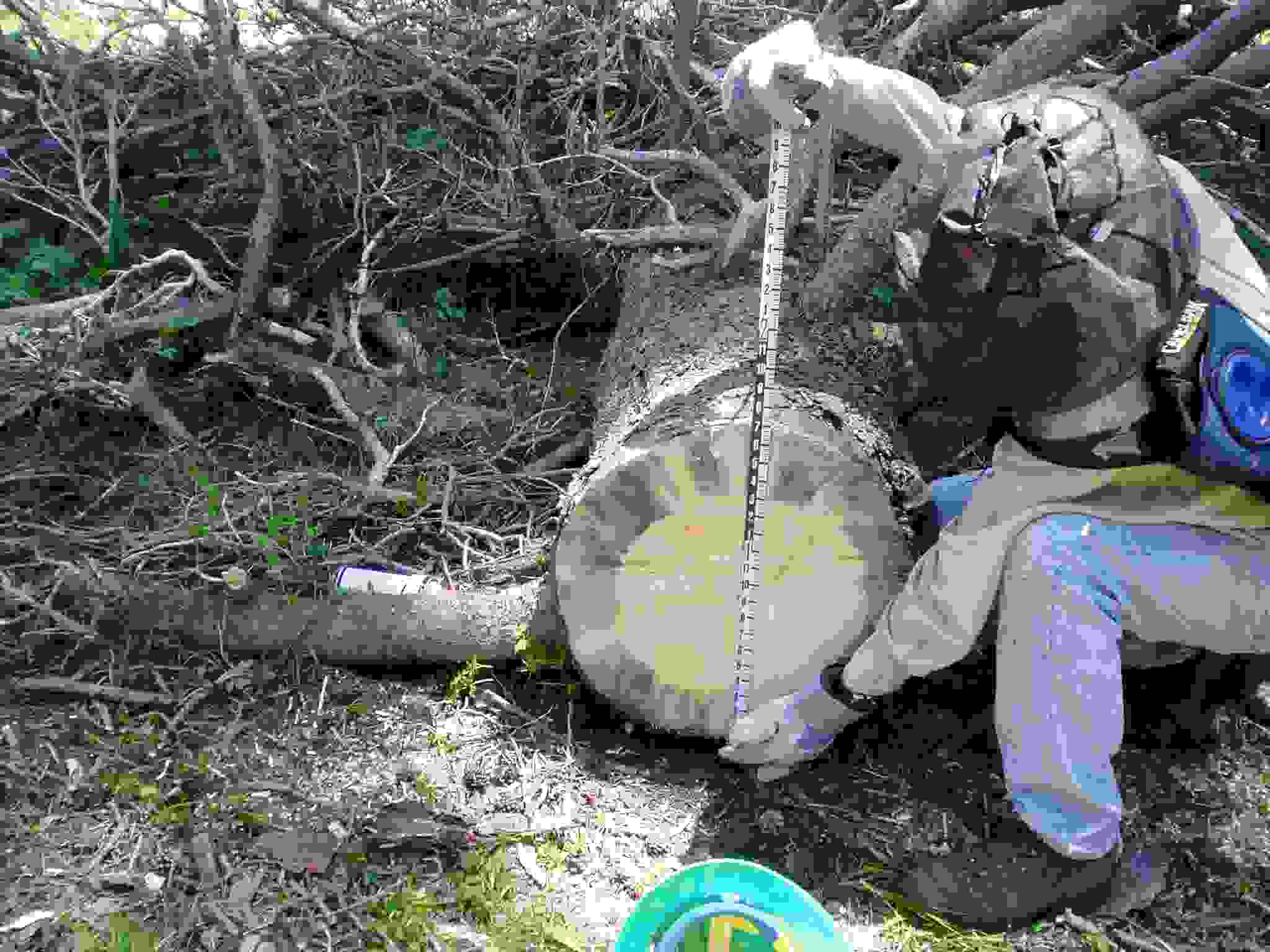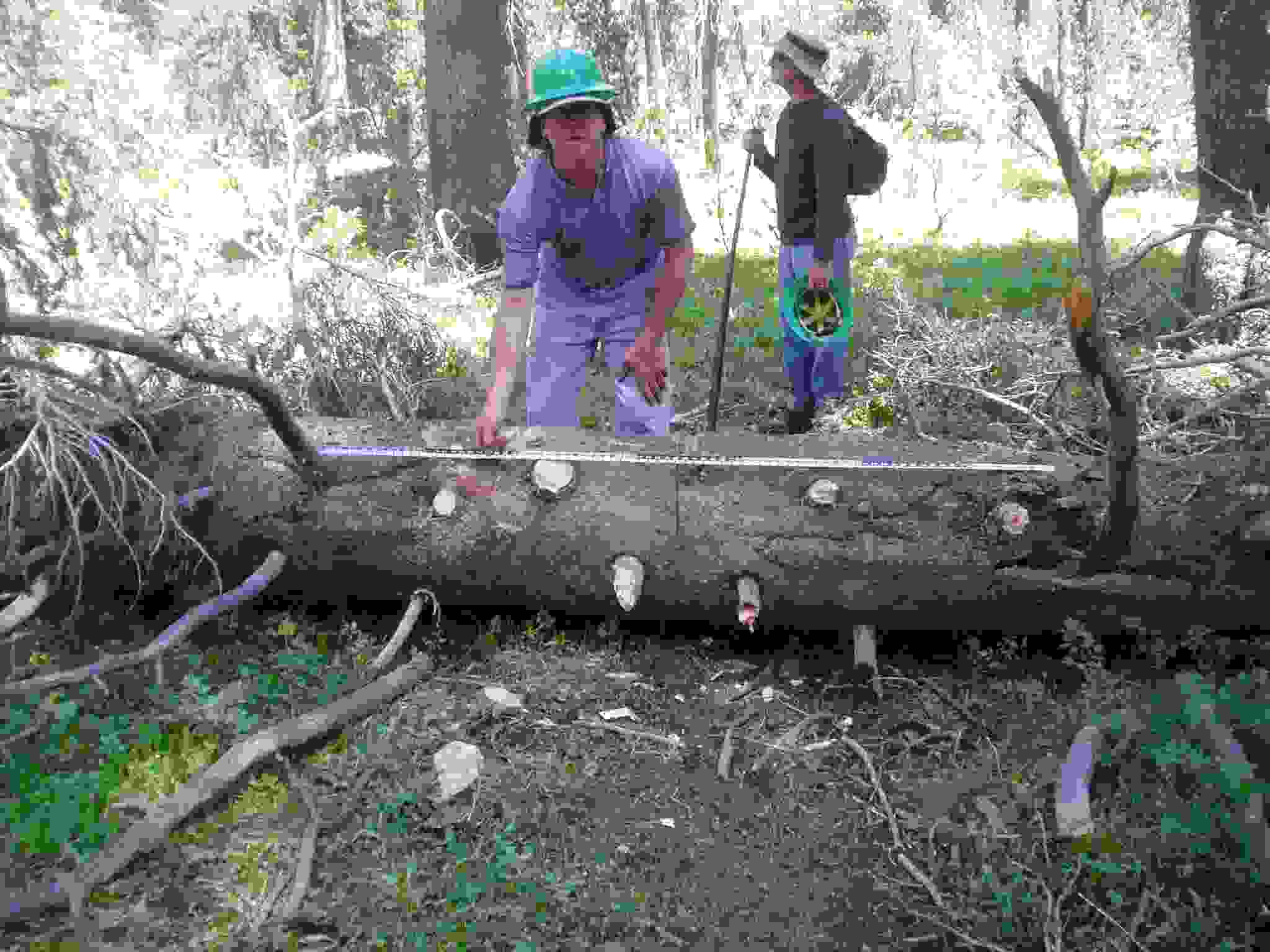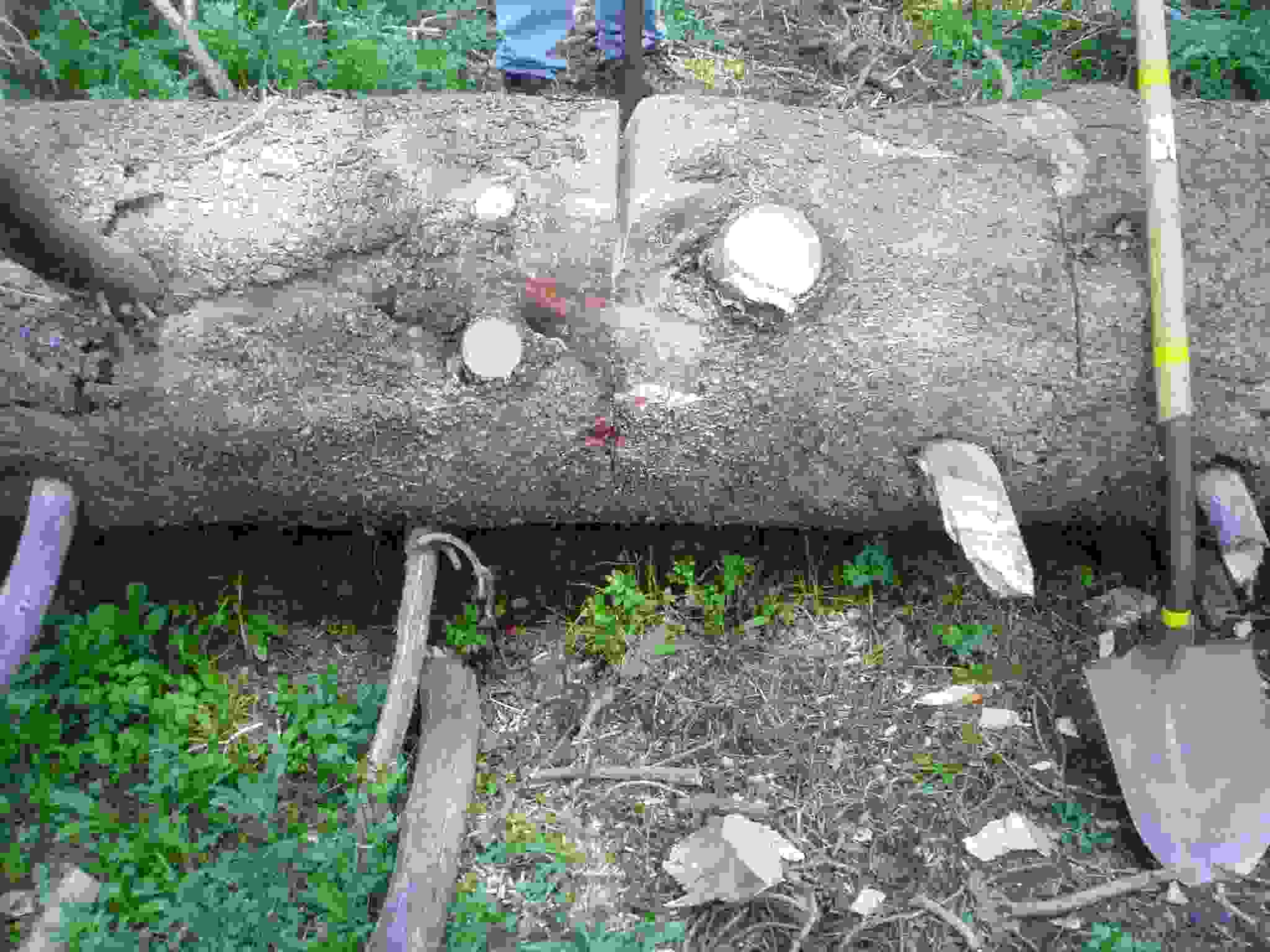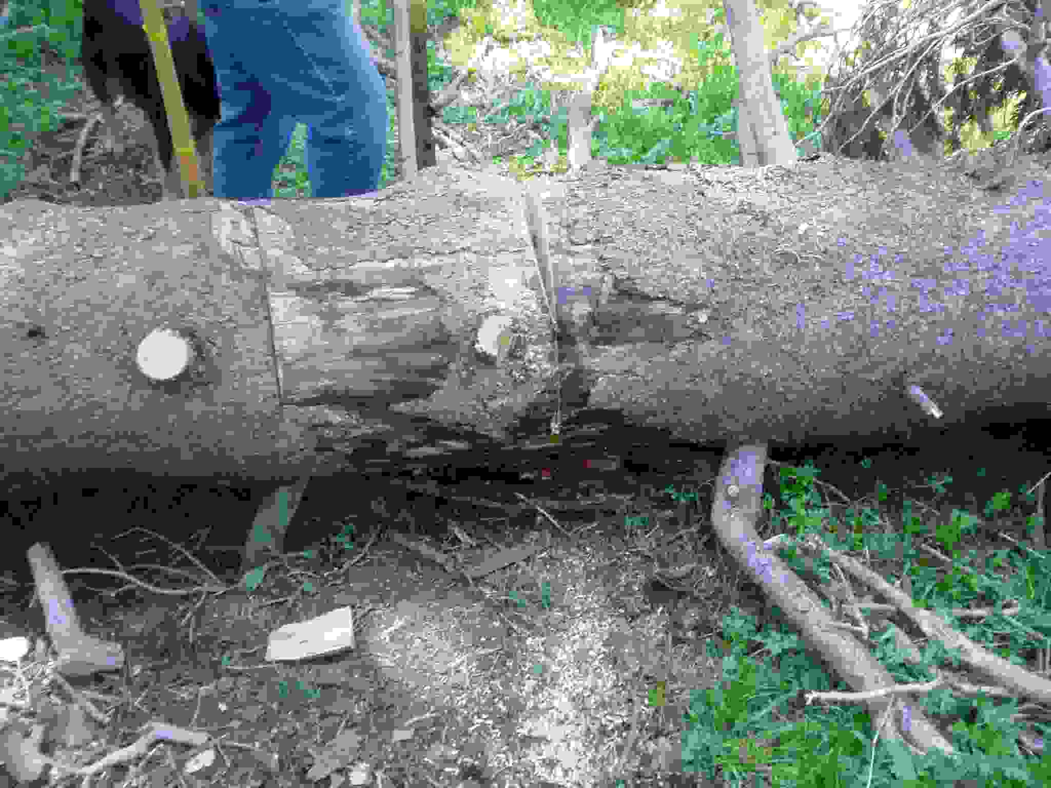 Our first "problem" tree. The week long crew got their saw badly stuck in this beauty. The tree suspended on both sides and is about four inches above the ground. The wood is "mushy" on top and using wedges did not work well. Notice the week long crew's cut on the left and an older try on the right of the tape measure.