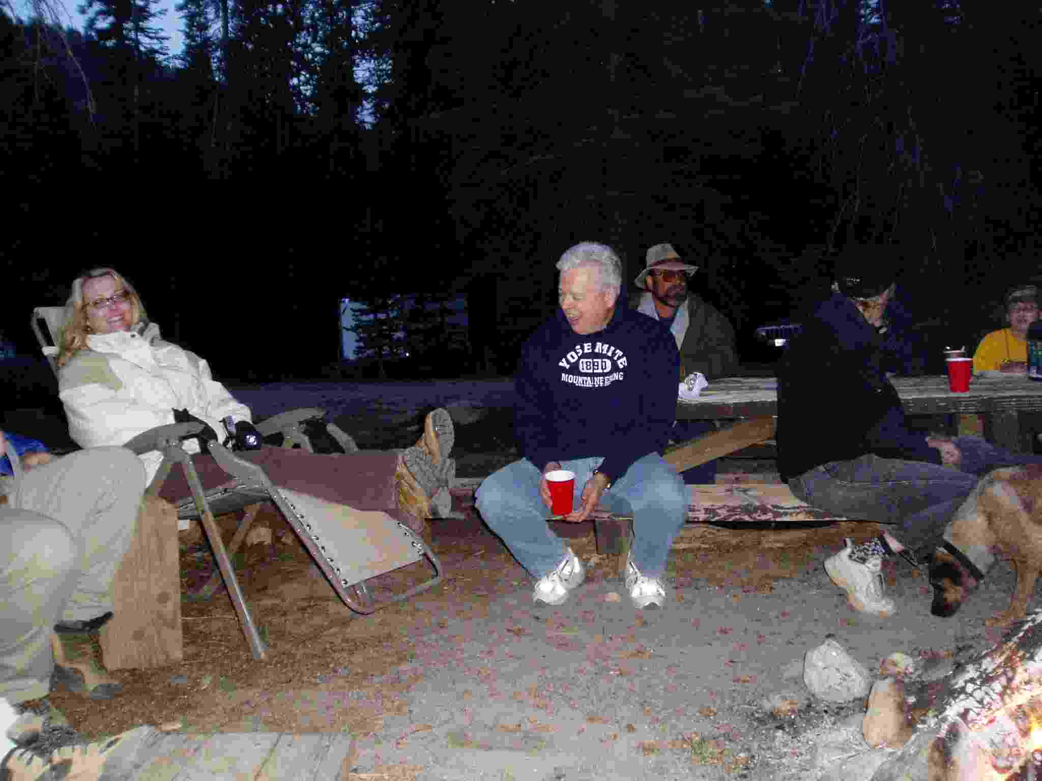 Sherri (in mega-chair), Phil, Tom, Barbara around the fire the first night.