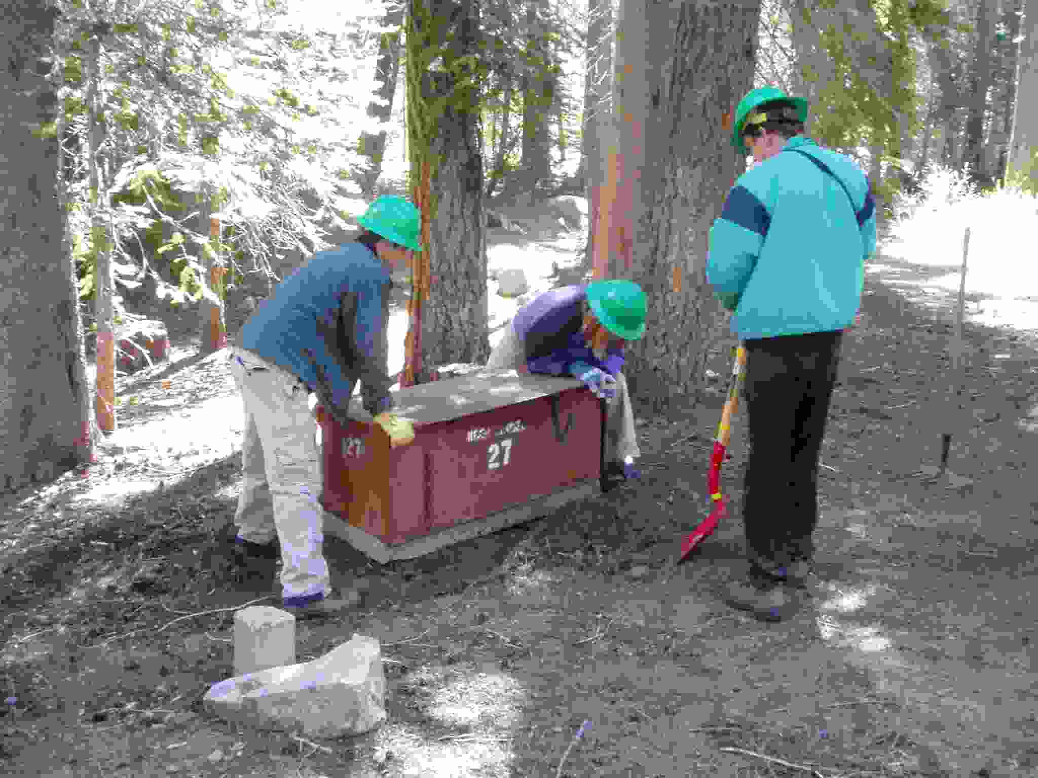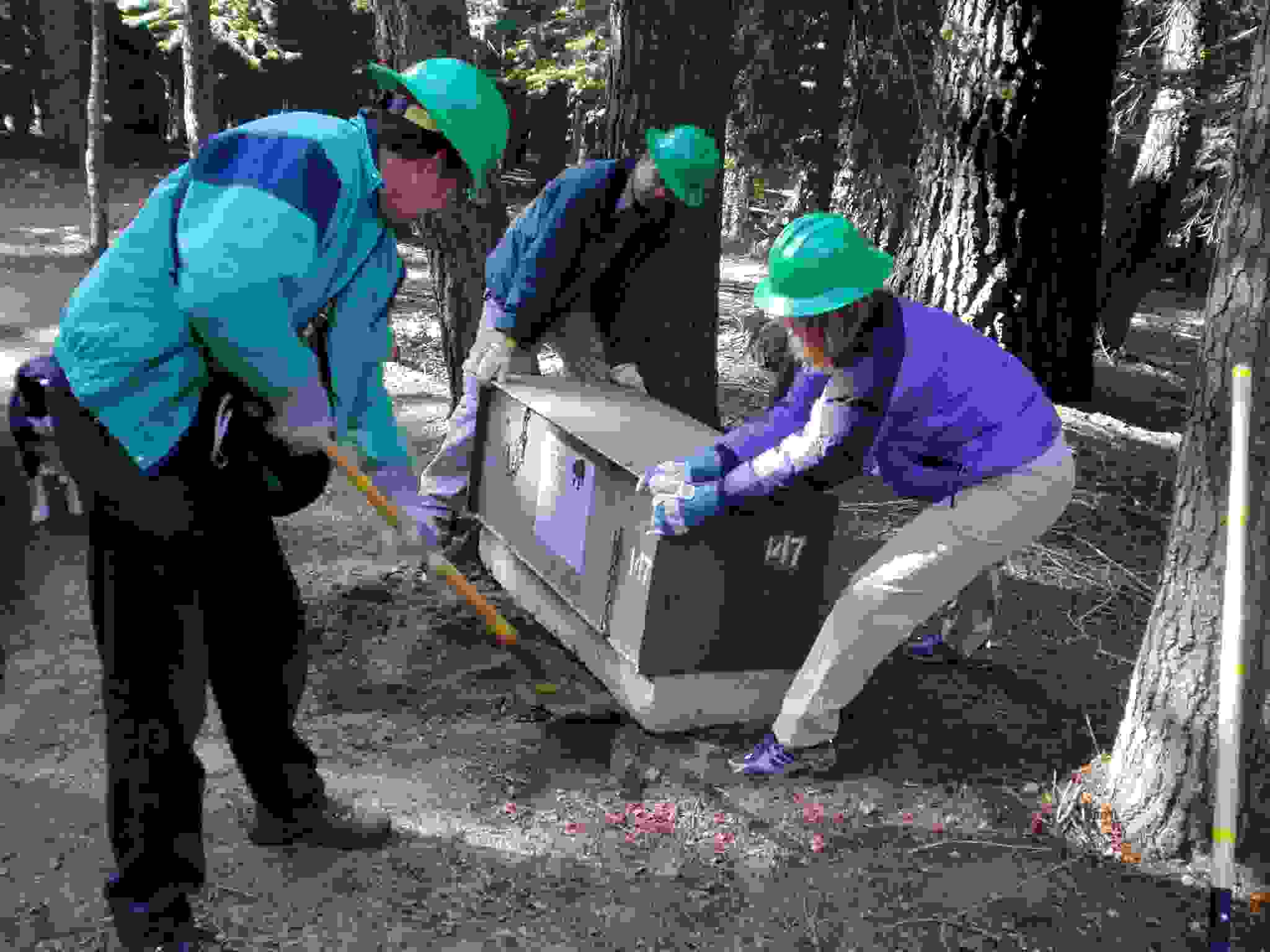 Keith shoveling dirt underneath a bear box while ? and Lisa hold it up.