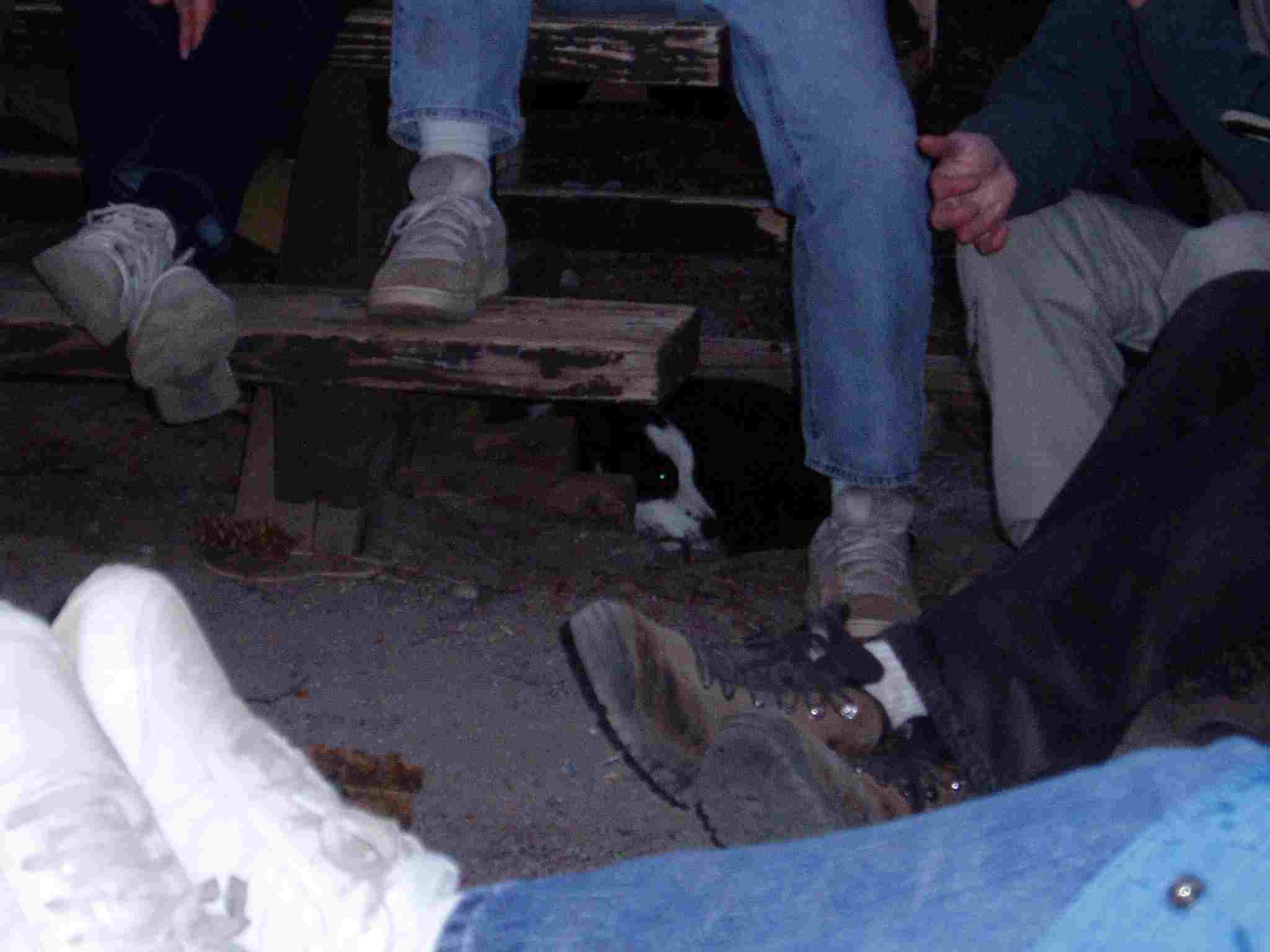 Tom, new dog and ? around fire after dinner.