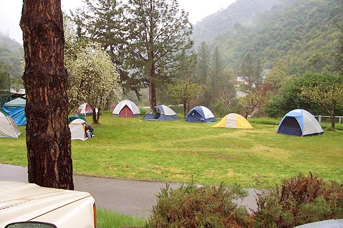 Tents pitched in soggy lawn at the PG&E recreation facility at Balch Camp.